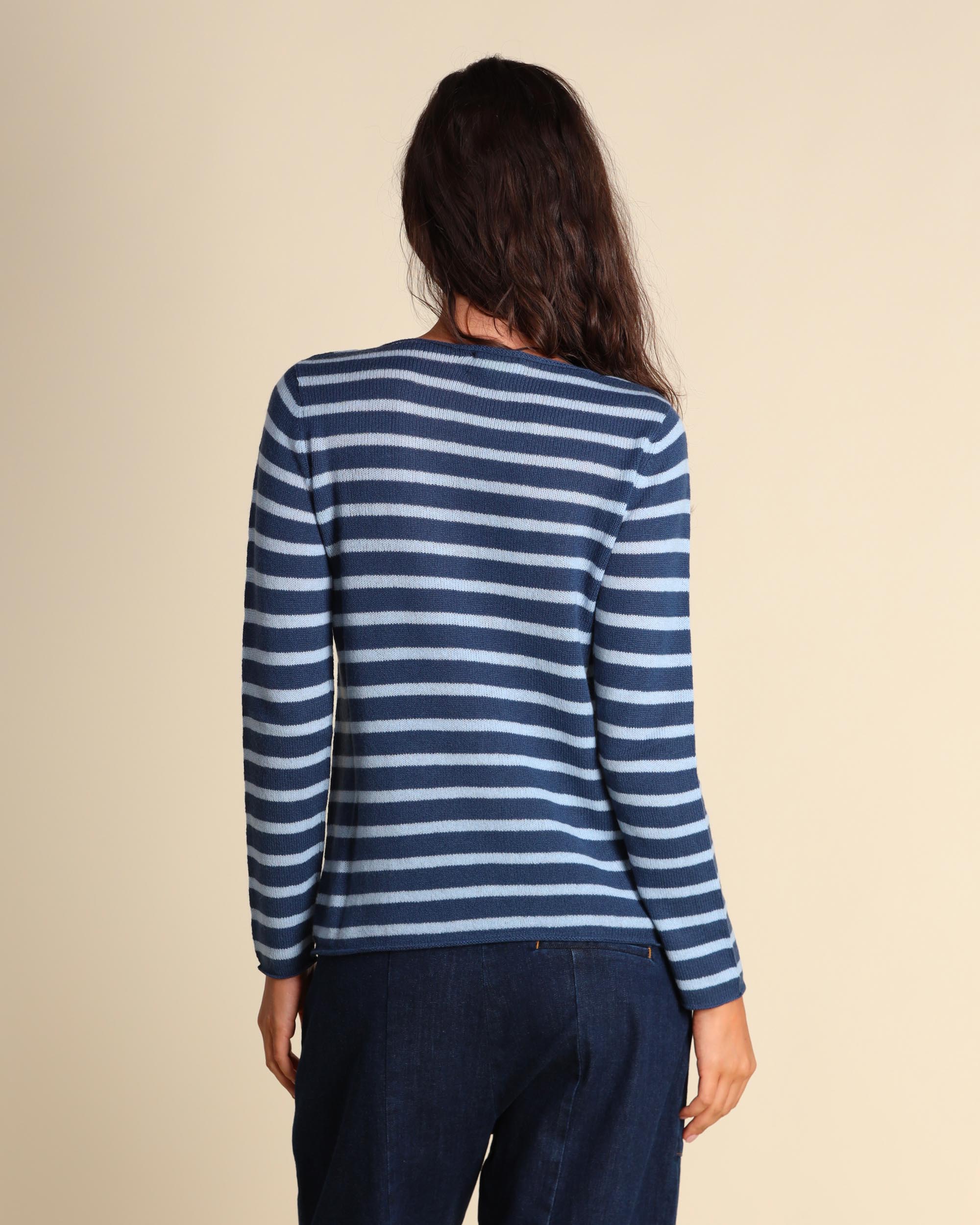 Maglia blu e azzurro a righe in cashmere con lavorazione a nuvola, gr.141, maniche lunghe, scollo a barchetta, linea semiaderente, la modella indossa una tg.S, la modella ha le seguenti misure: altezza 179, seno 84, vita 63, fianchi 94, collezione donna Be You Autunno Inverno 2025/26