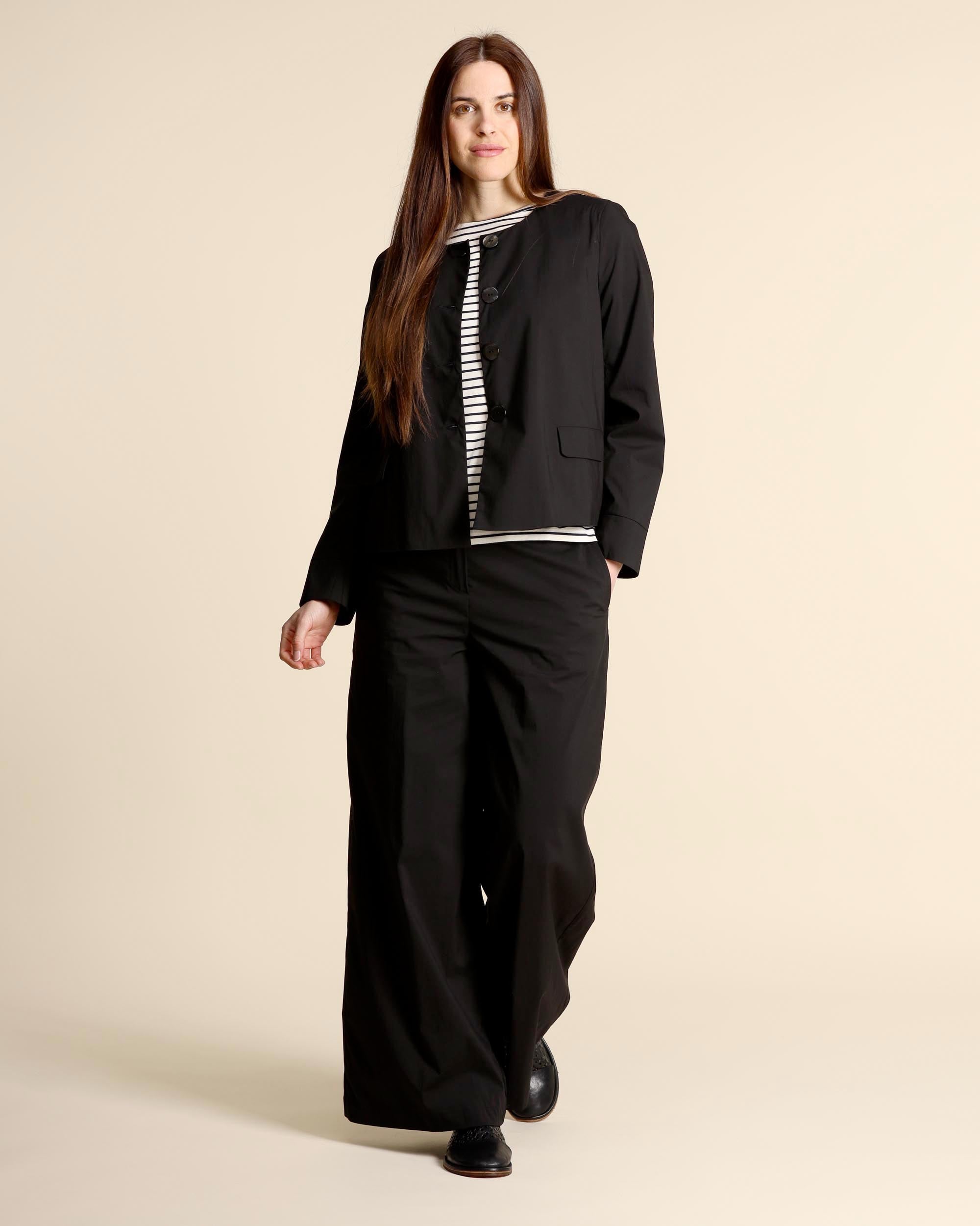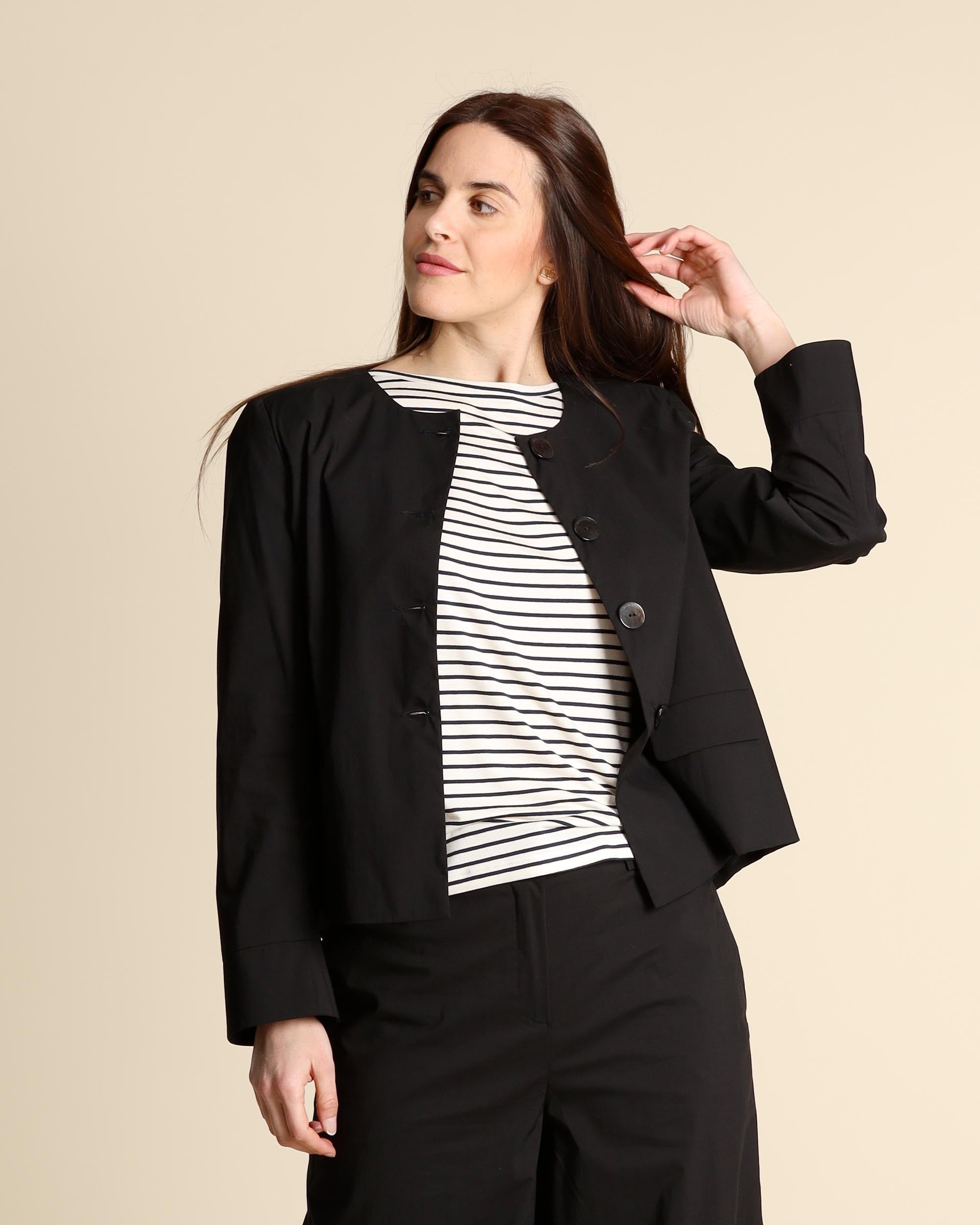 Giacca nera in misto cotone stretch, maniche lunghe, scollo tondo, tasche con patta, linea dritta, chiusura con bottoni, foderata, spacco centrale sul dietro, made in Italy, la modella indossa una tg.42, la modella ha le seguenti misure: altezza 177, seno 86,vita 65, fianchi 93, collezione donna Alessia Santi Primavera Estate 2026