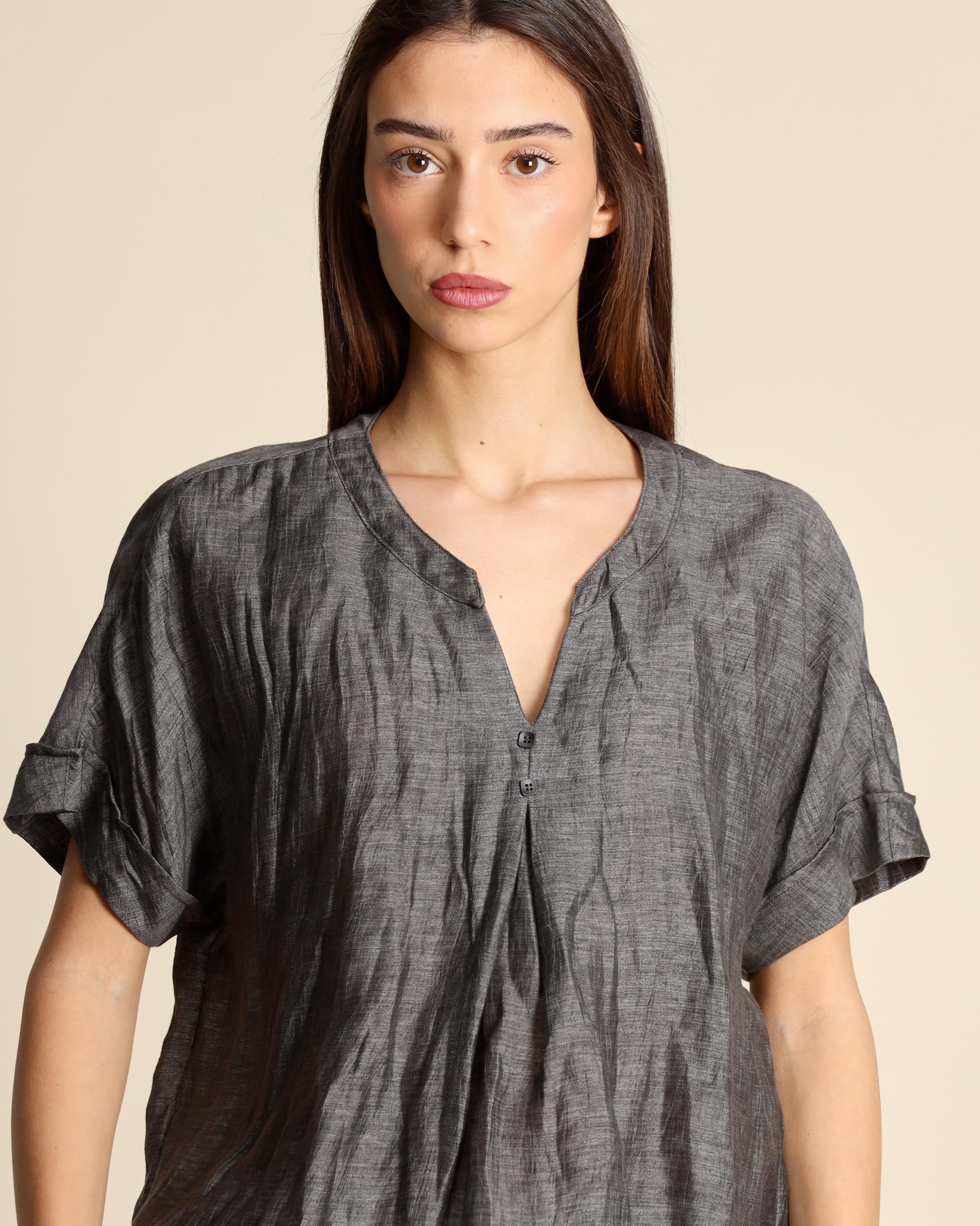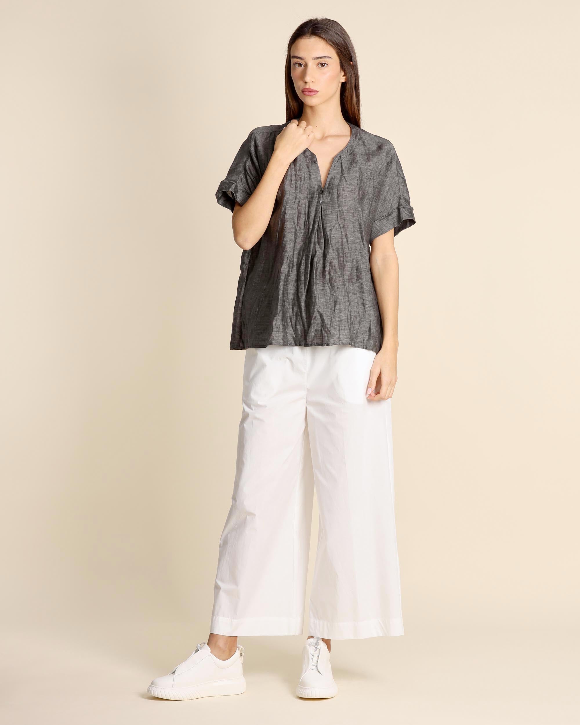 Blusa grigia in tessuto cangiante di misto lino, maniche corte con risvolto, linea ampia, scollo tondo con apertura a V sul davanti e bottoni, made in Italy, la modella indossa una tg.42, la modella ha le seguenti misure: altezza 177, seno 86,vita 65, fianchi 93, collezione donna Alessia Santi Primavera Estate 2026