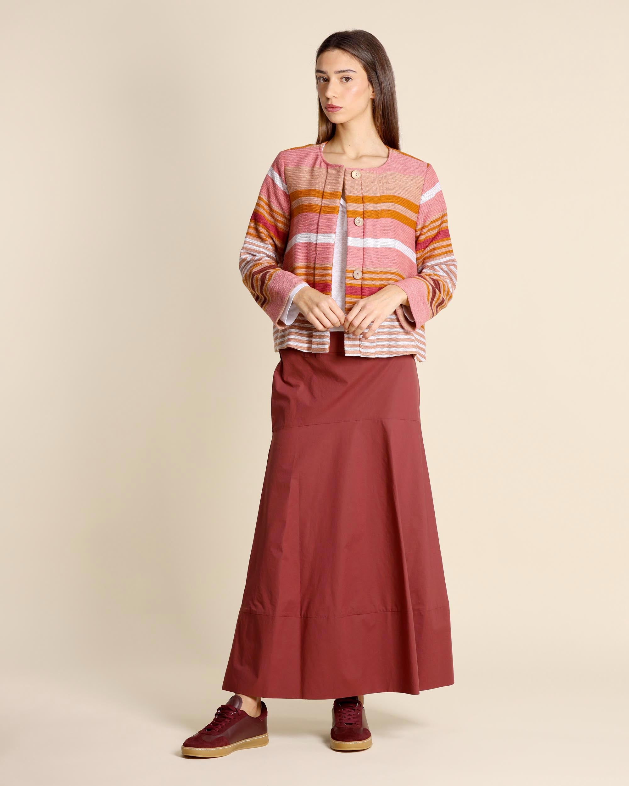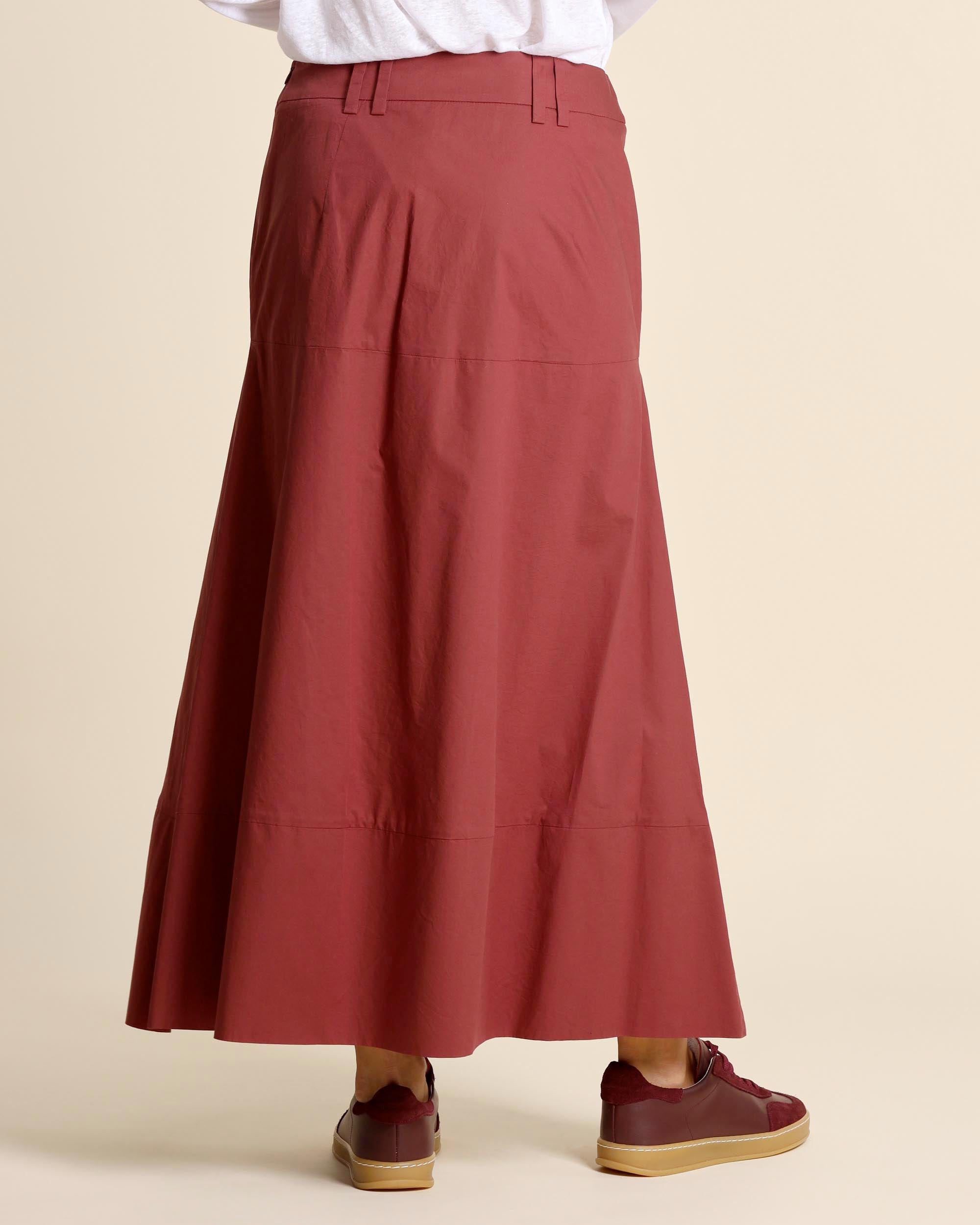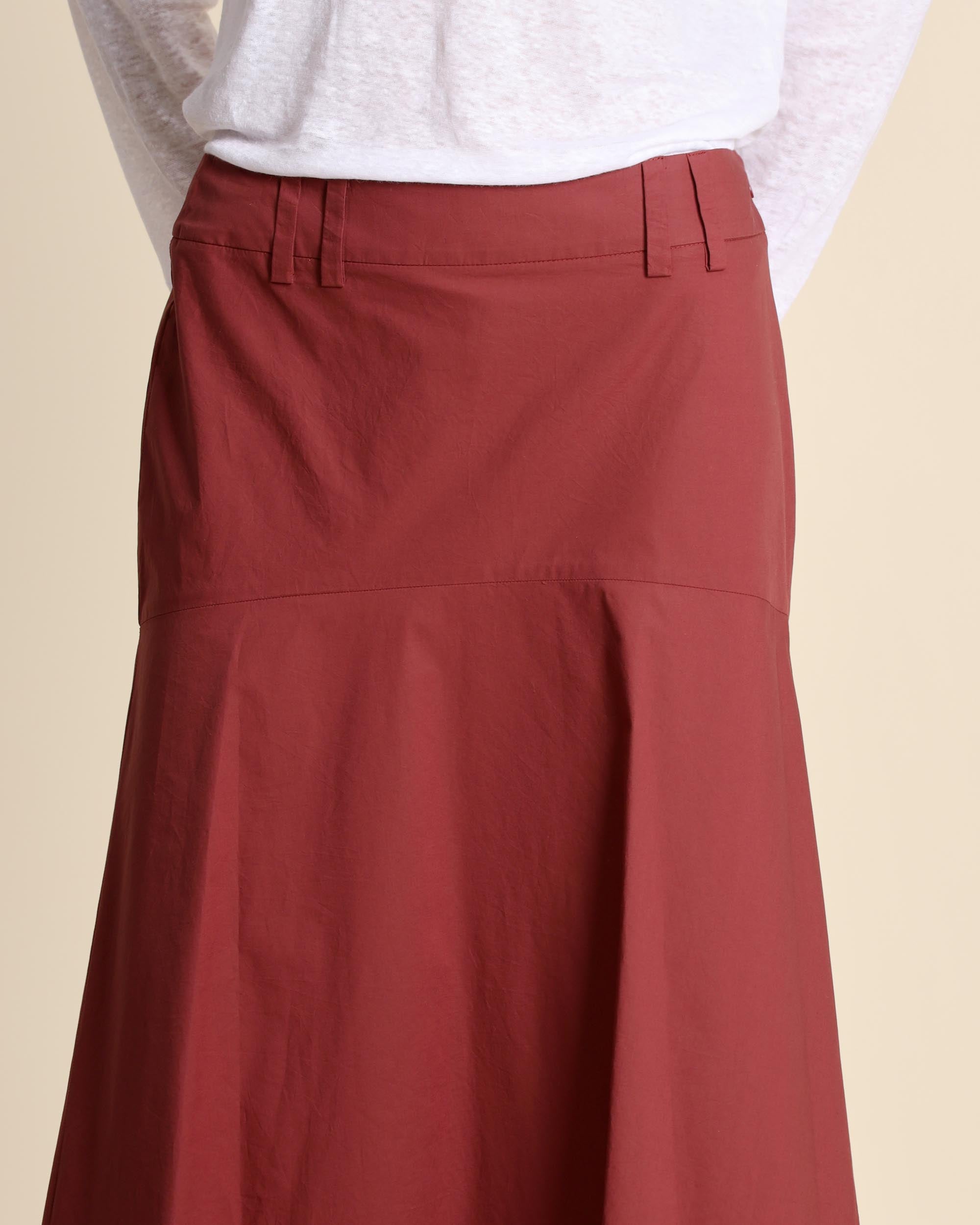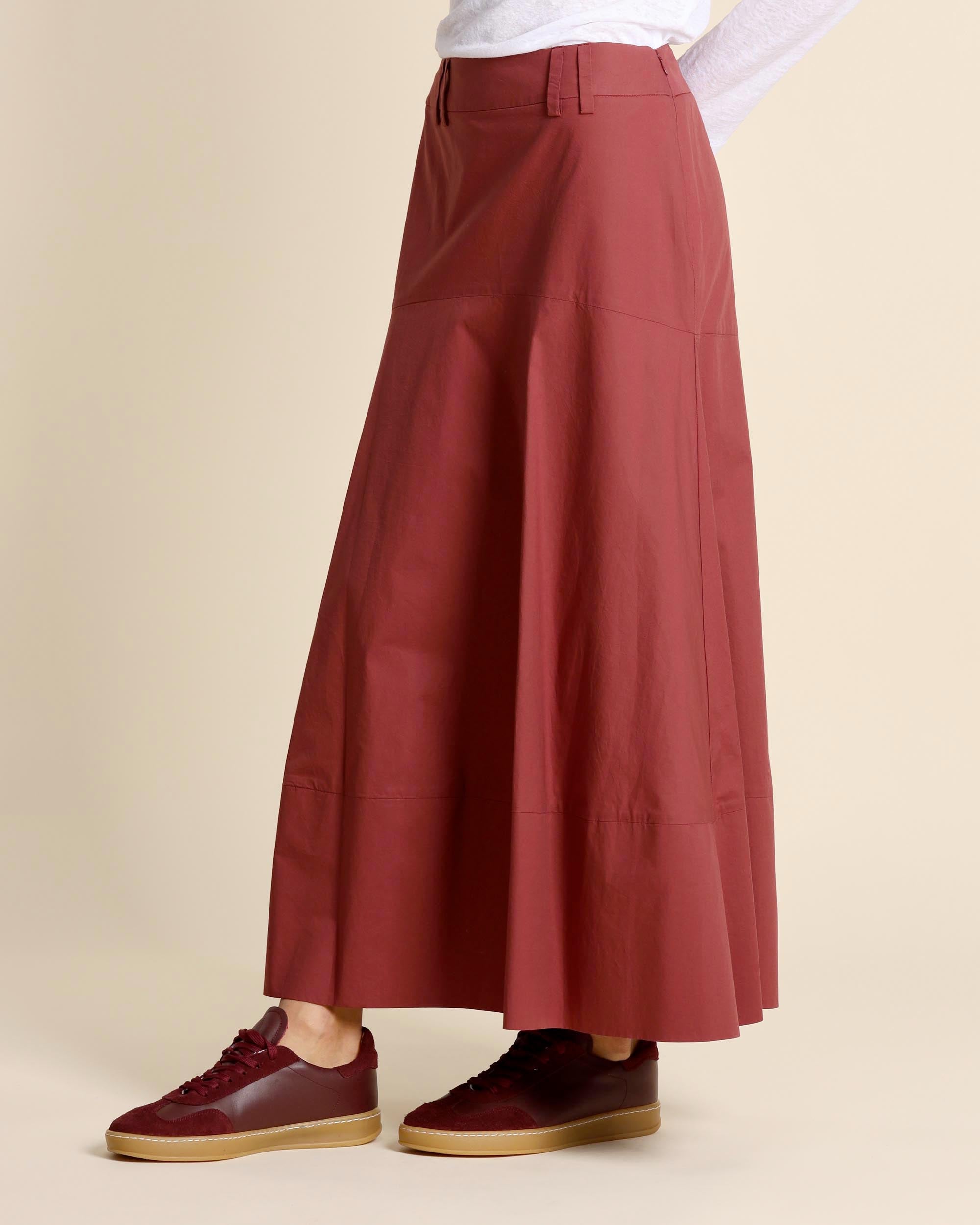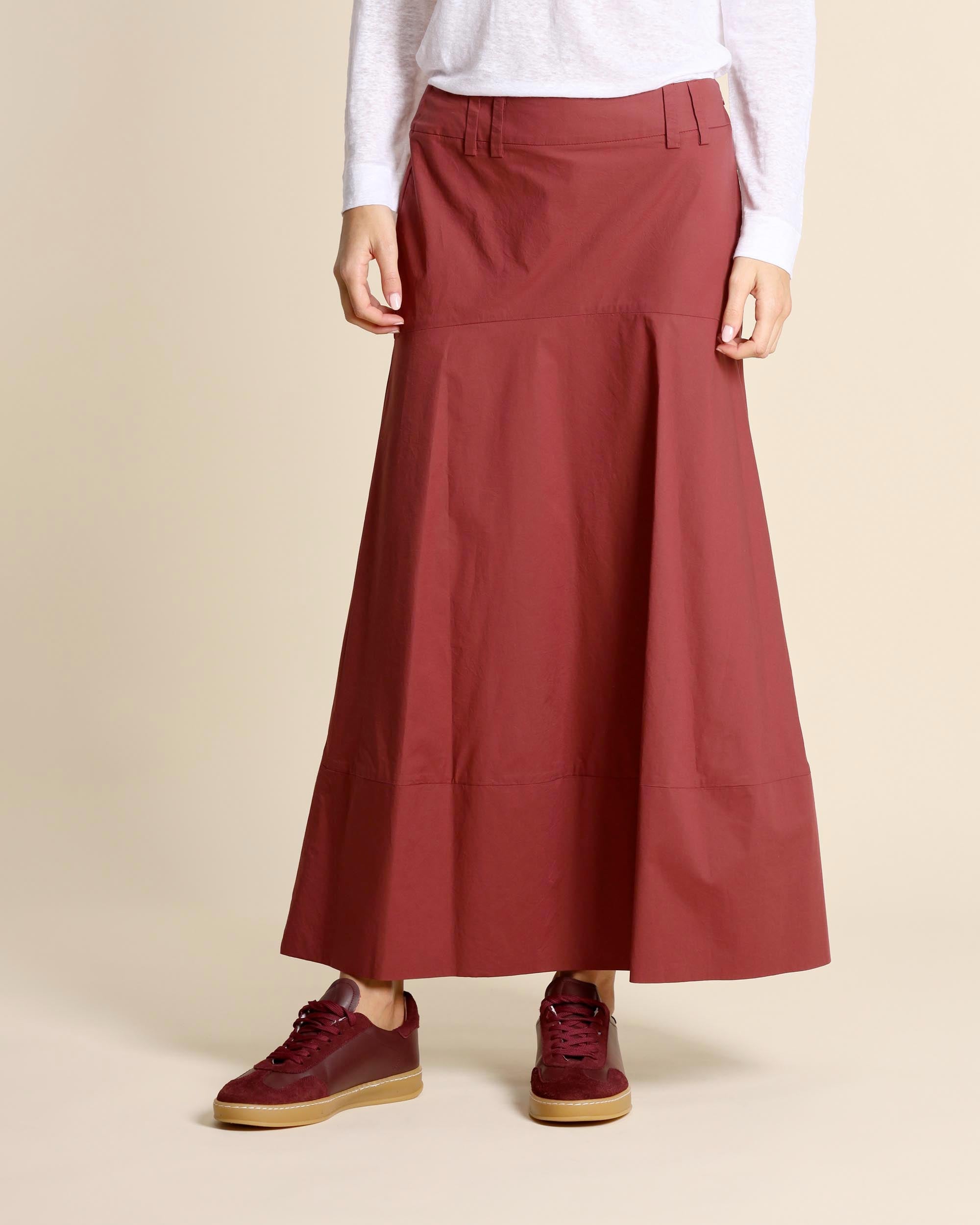Gonna color mattone lunga in popeline di cotone, chiusura laterale con zip invisibile sul fianco, linea svasata, sfoderata, made in Italy, la modella indossa una tg.42, la modella ha le seguenti misure: altezza 177, seno 86,vita 65, fianchi 93, collezione donna Alessia Santi Primavera Estate 2026