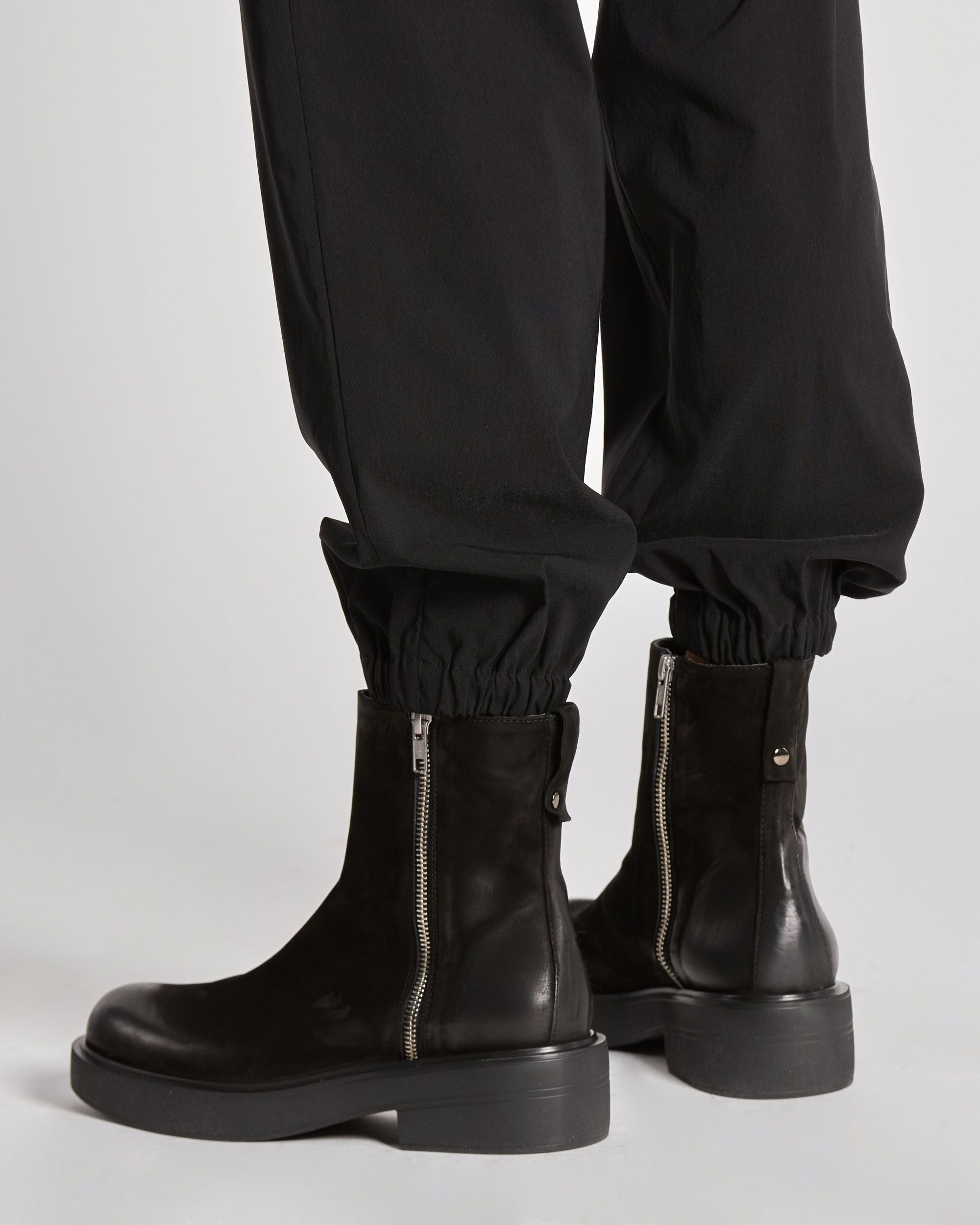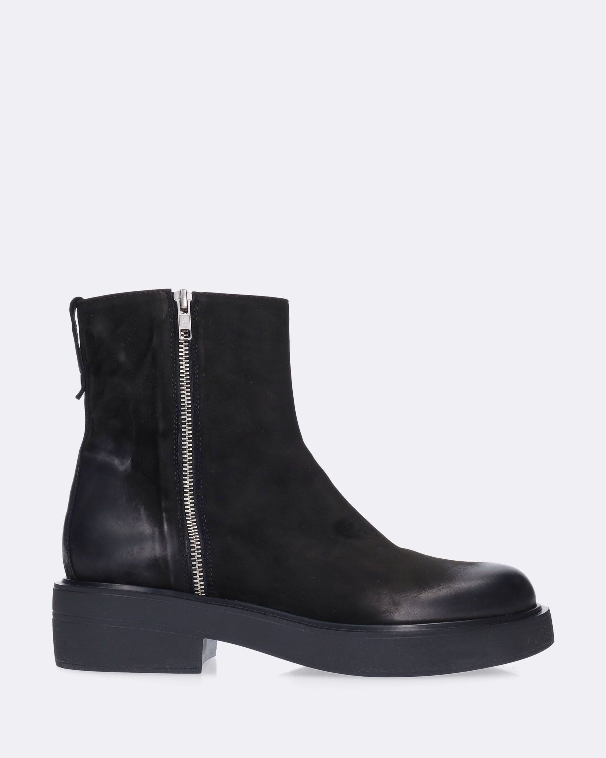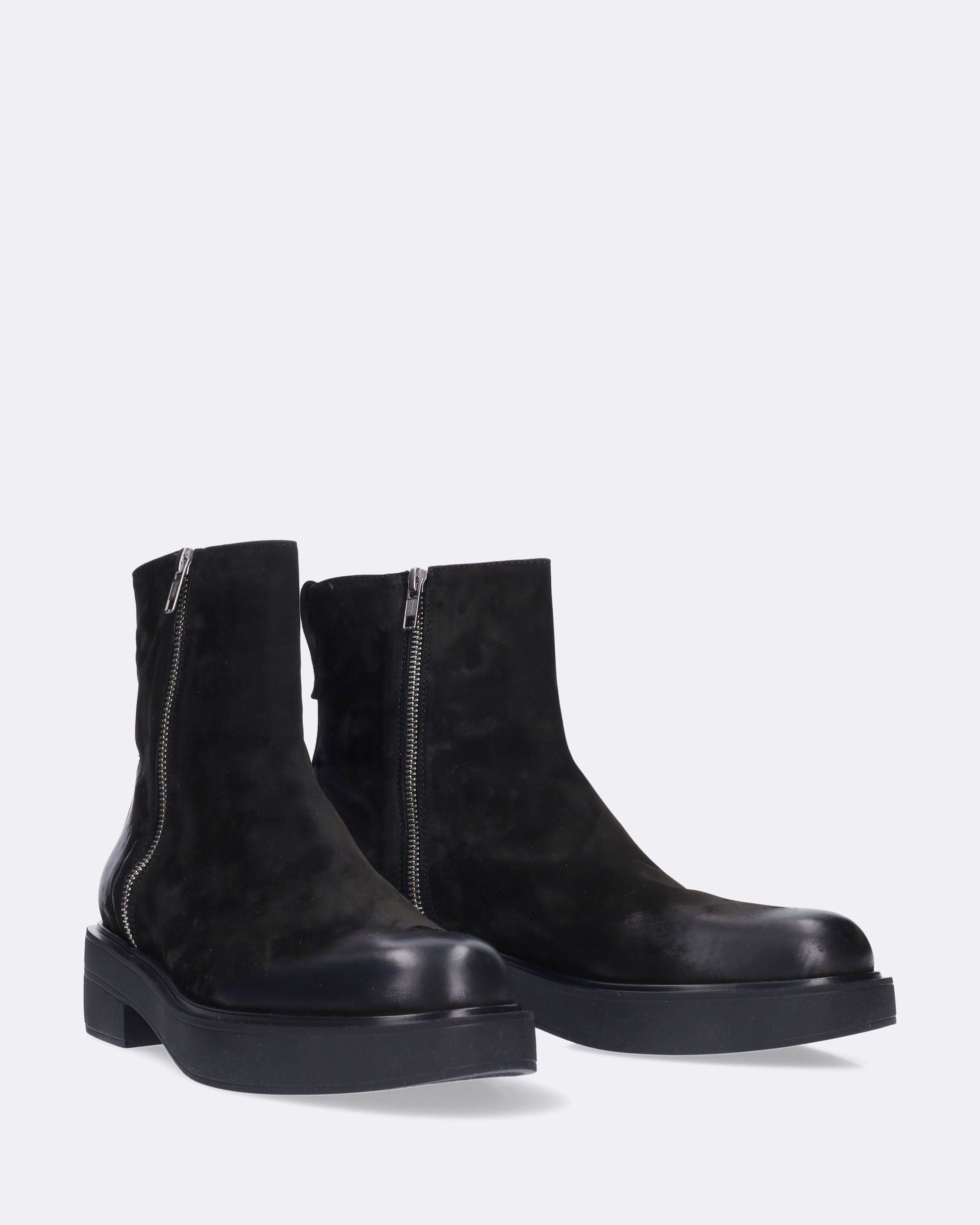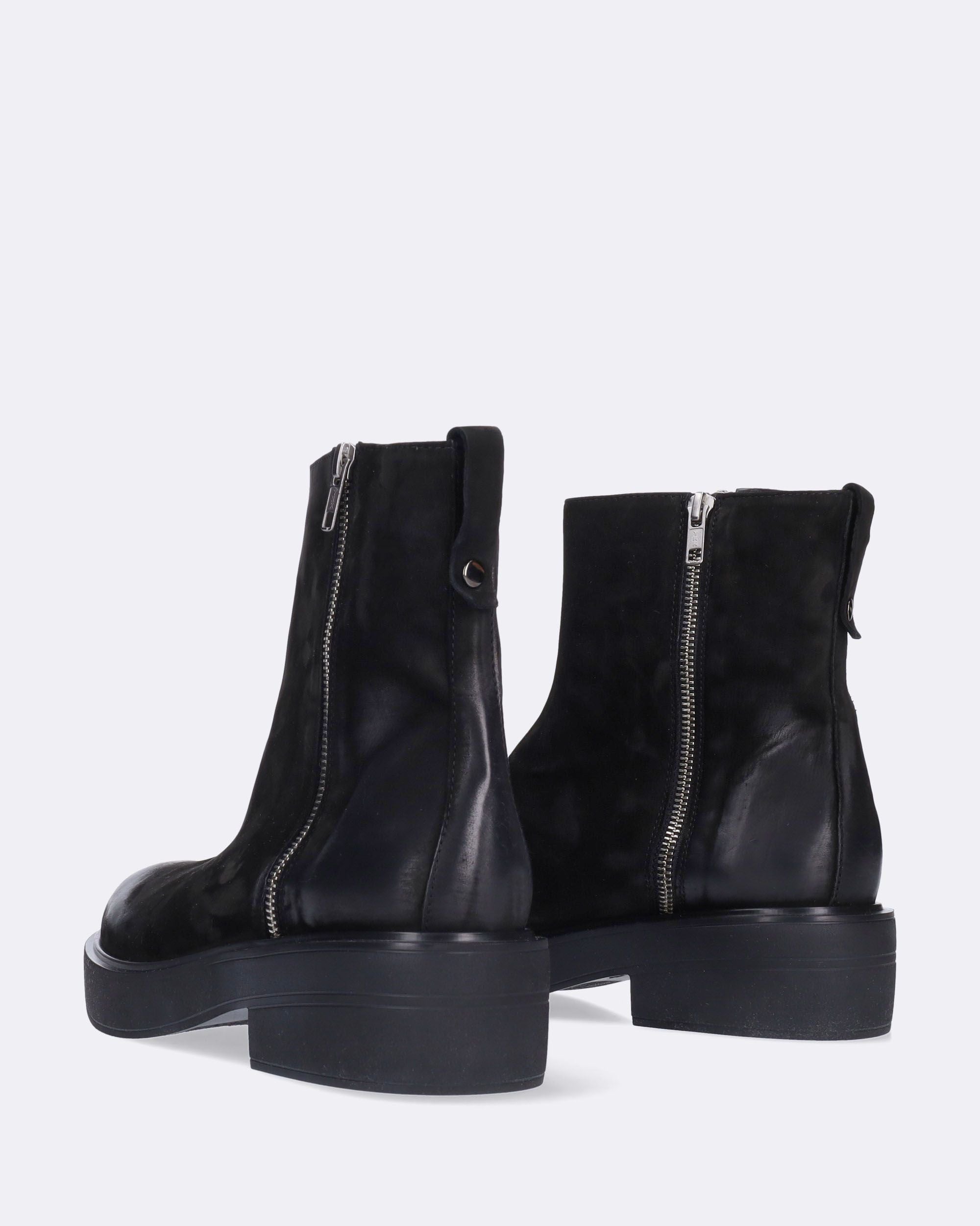 Stivaletti in velour nera tamponata con effetto vinted, concia vegetale, zip laterali, tacco 40mm, suola in gomma ultralight, fodera in pelle, sottopiede in pelle, made in Italy, collezione donna Fruit Autunno Inverno 2024/25