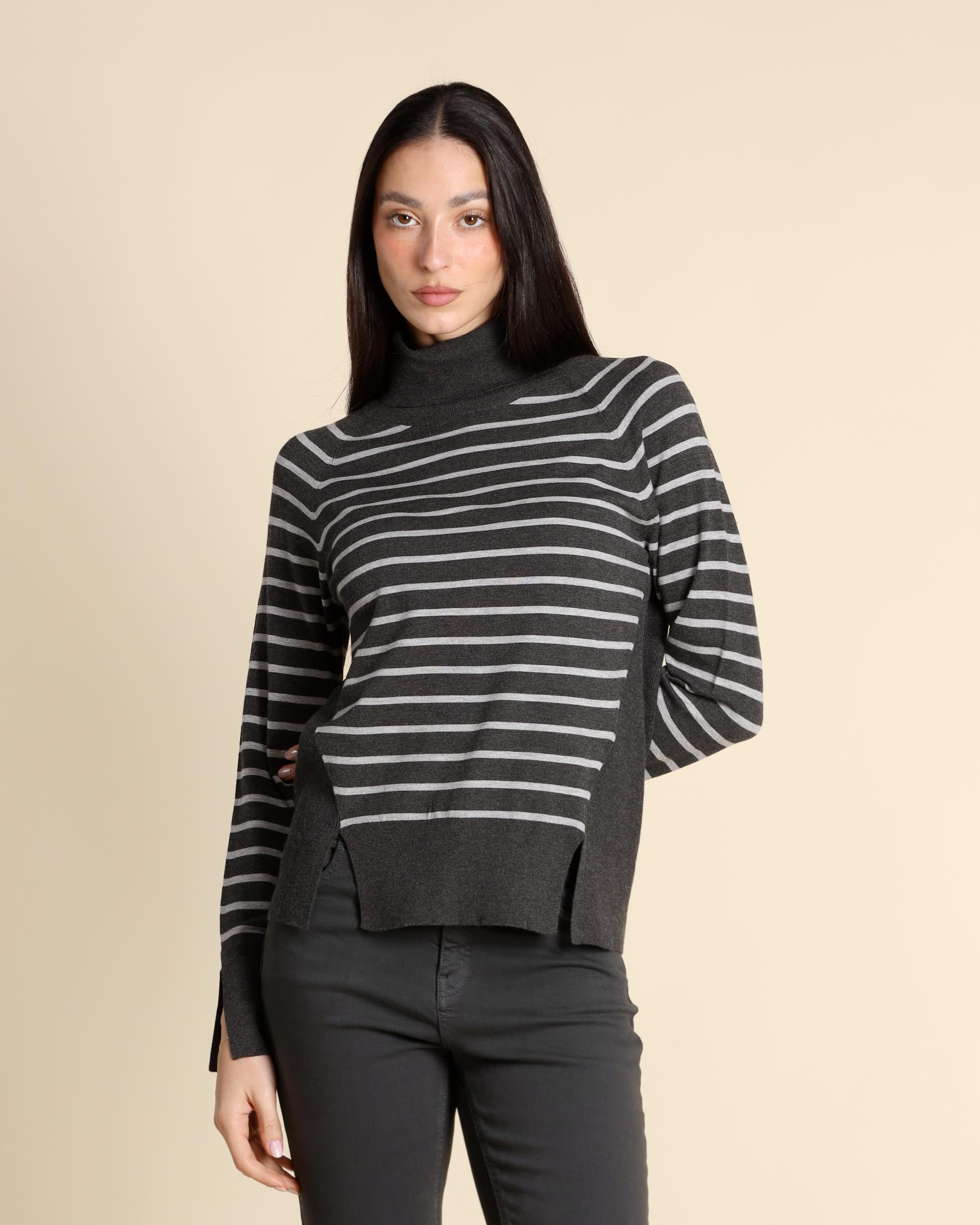 Maglia grigio melange a righe in misto viscosa, collo alto, maniche lunghe raglan con spacco sul polso, linea dritta, spacchi sul davanti, la modella indossa una tg.S, la modella ha le seguenti misure: altezza 173, seno 84, vita 63, fianchi 94, collezione donna Emme by Marella Autunno Inverno 2025/26