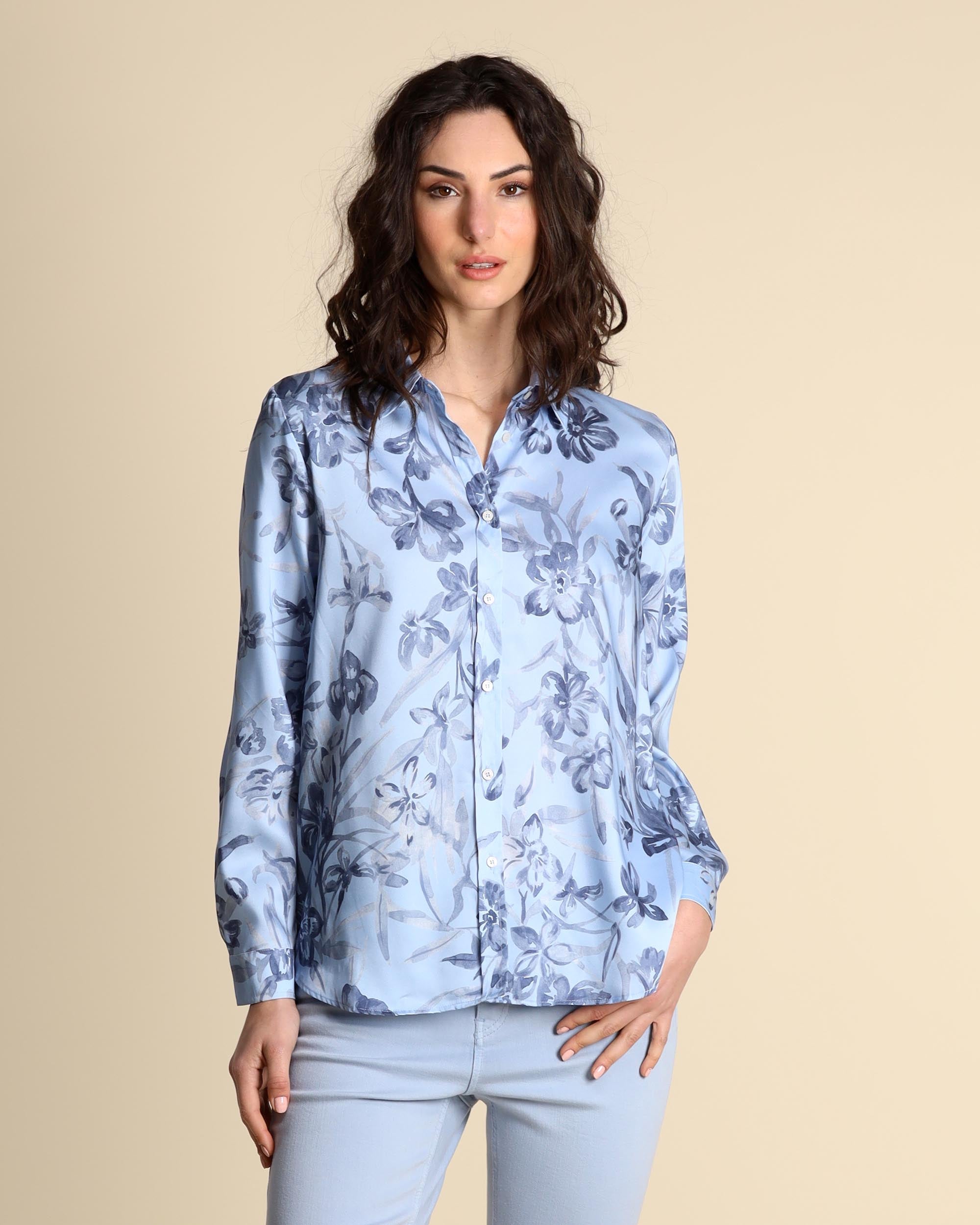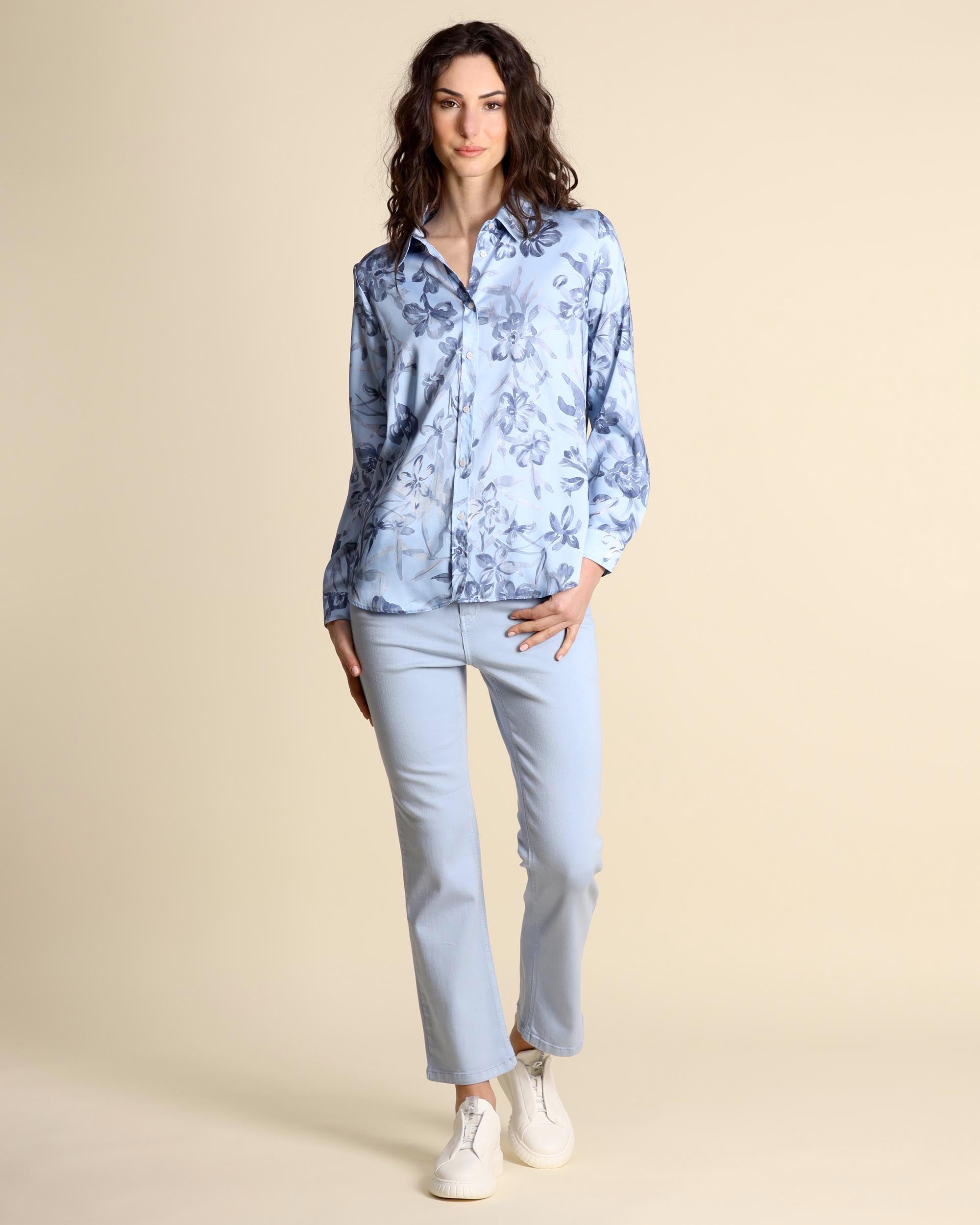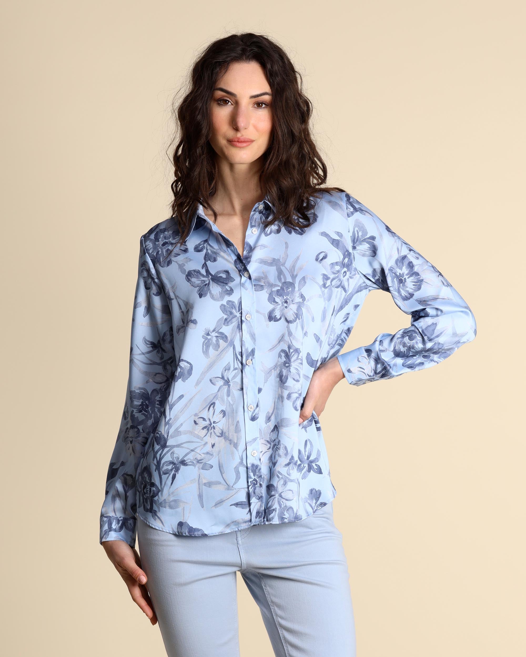 Hellblaues, gemustertes Twillhemd, Hemdkragen, gerader Schnitt, Knopfleiste, lange Ärmel mit Manschetten, abgerundeter Saum. Das Model trägt Größe 42 und hat folgende Maße: Körpergröße 177 cm, Brustumfang 86 cm, Taillenumfang 65 cm, Hüftumfang 93 cm. Emme by Marella Damenkollektion Frühjahr/Sommer 2026.