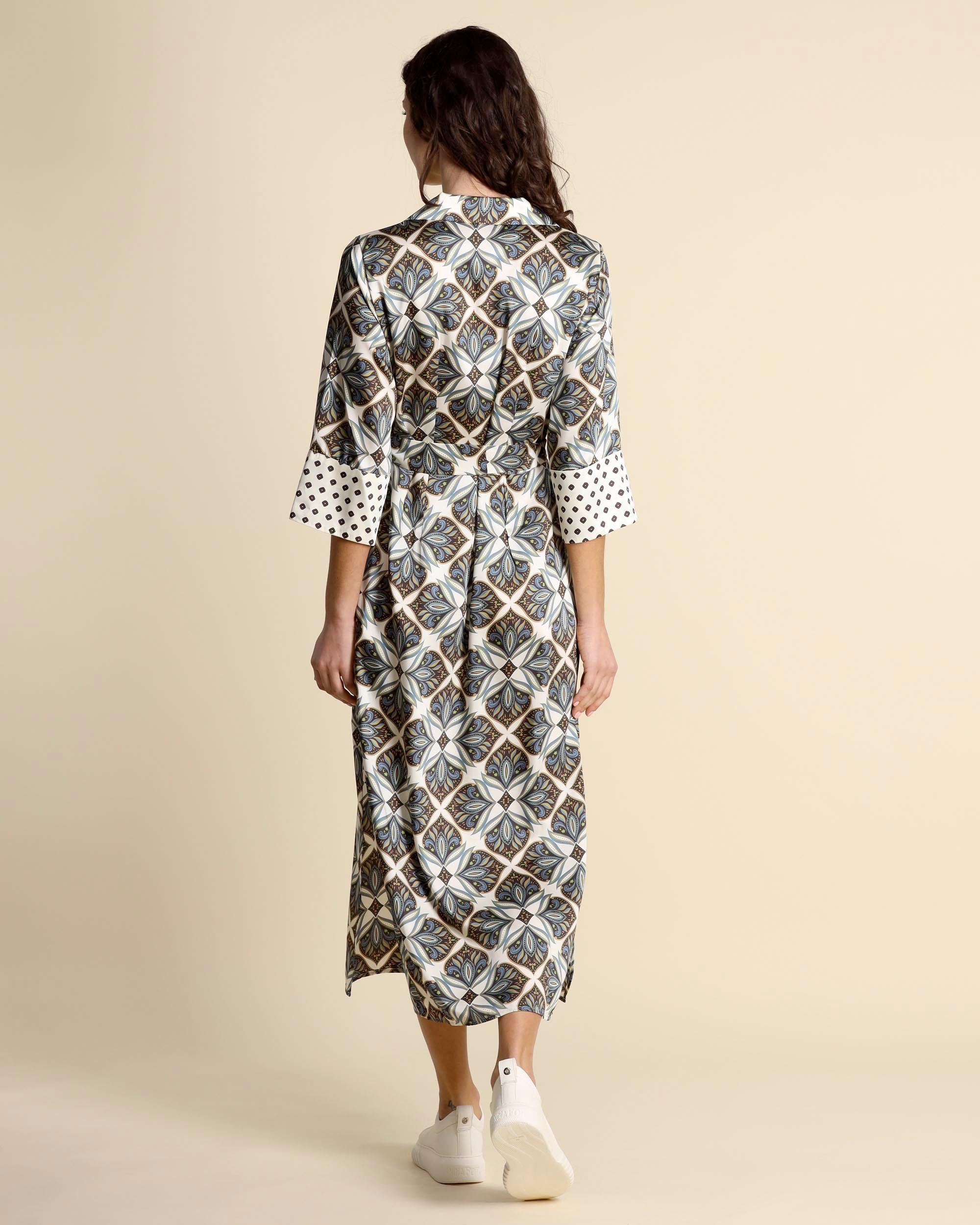 Elfenbeinfarbenes Hemdblusenkleid aus gemustertem Twill, Knopfleiste, Dreiviertelärmel mit kontrastierender Borte, tailliert, Seitenschlitze, ungefüttert, leicht ausgestellter Schnitt, passender Gürtel. Das Model trägt Größe 42 und hat folgende Maße: Körpergröße 177 cm, Brustumfang 86 cm, Taillenumfang 65 cm, Hüftumfang 93 cm. Emme by Marella Damenkollektion Frühjahr/Sommer 2026.