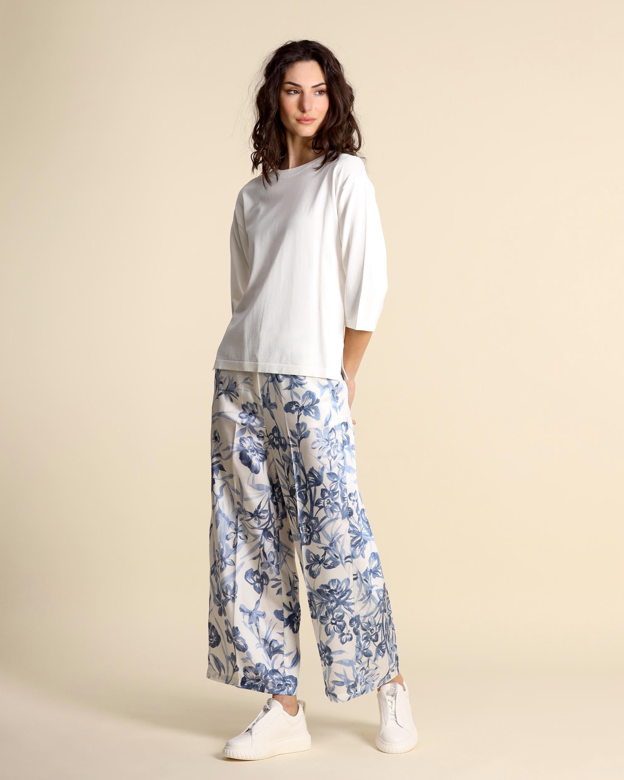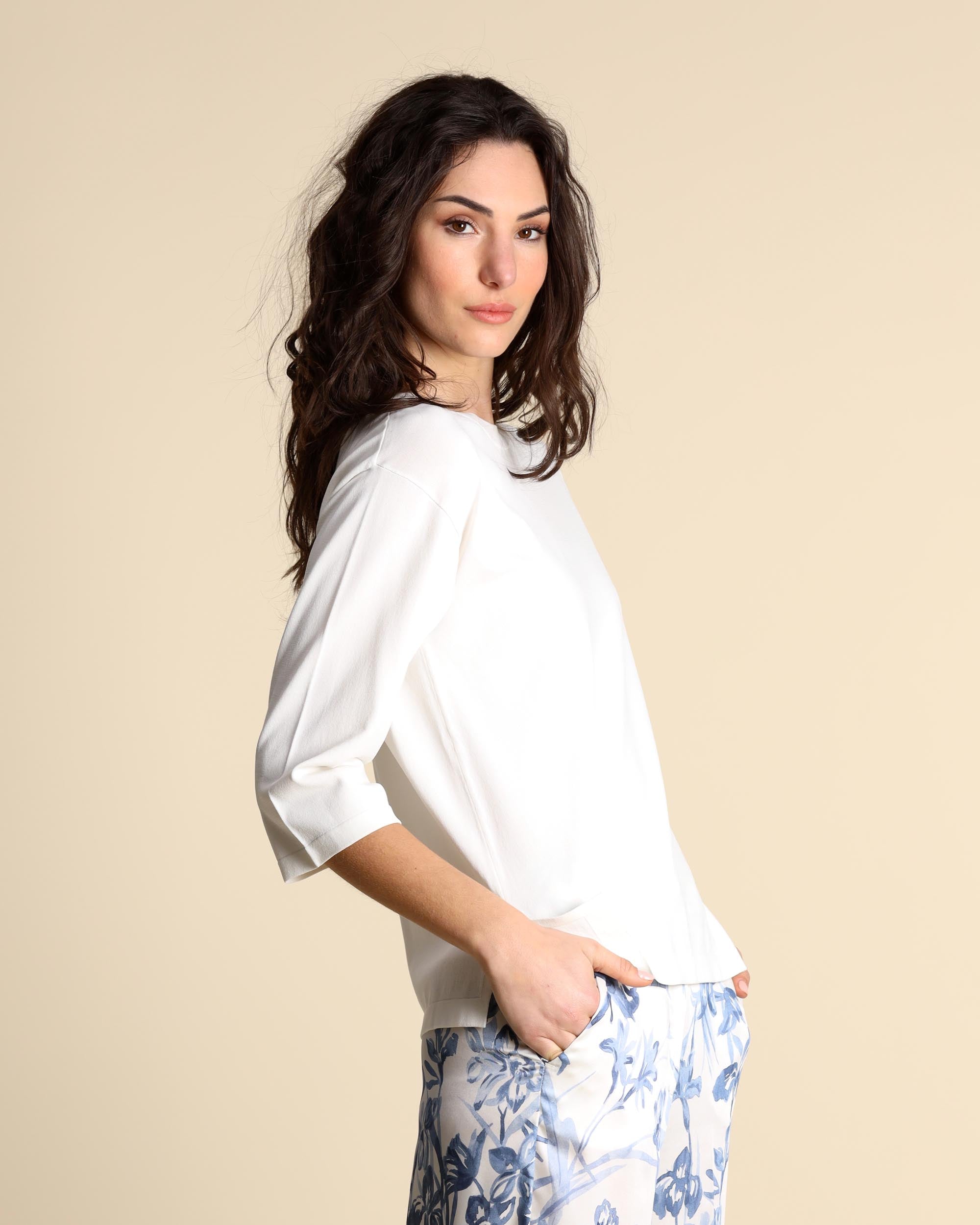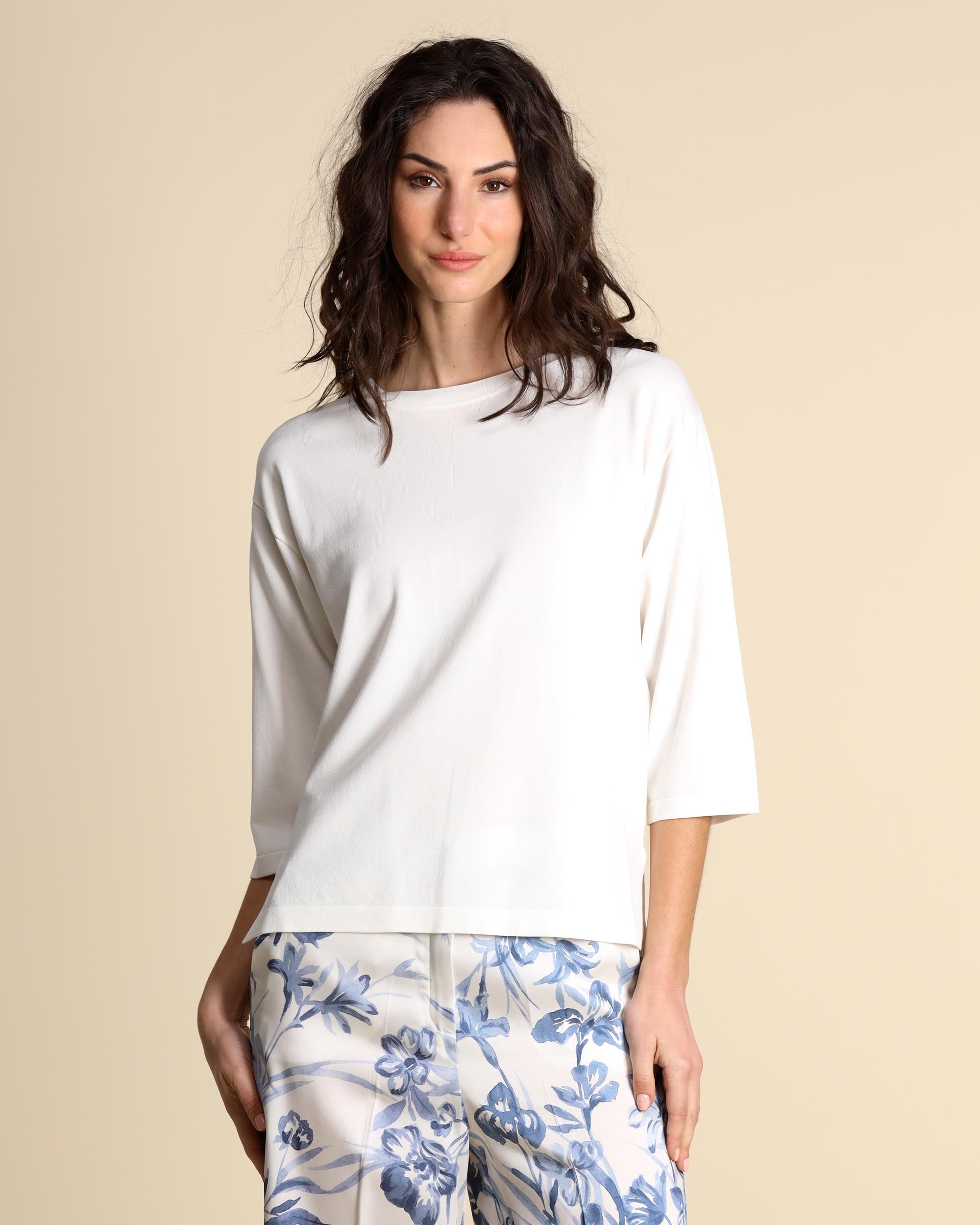 Weißer Pullover aus Viskosemischung, Rundhalsausschnitt, gerader Schnitt, Dreiviertelärmel, überschnittener Saum, Seitenschlitze. Das Model trägt Größe S und hat folgende Maße: Körpergröße 177 cm, Brustumfang 86 cm, Taillenumfang 65 cm, Hüftumfang 93 cm. Damenkollektion Emme by Marella Frühjahr/Sommer 2026.