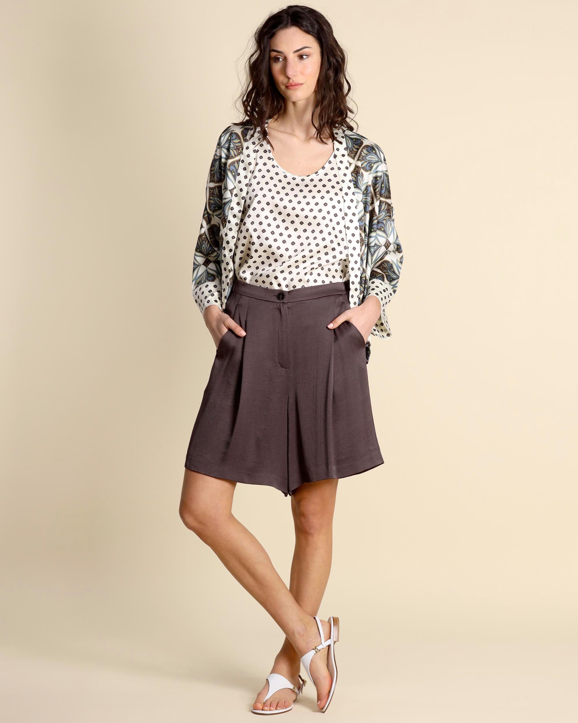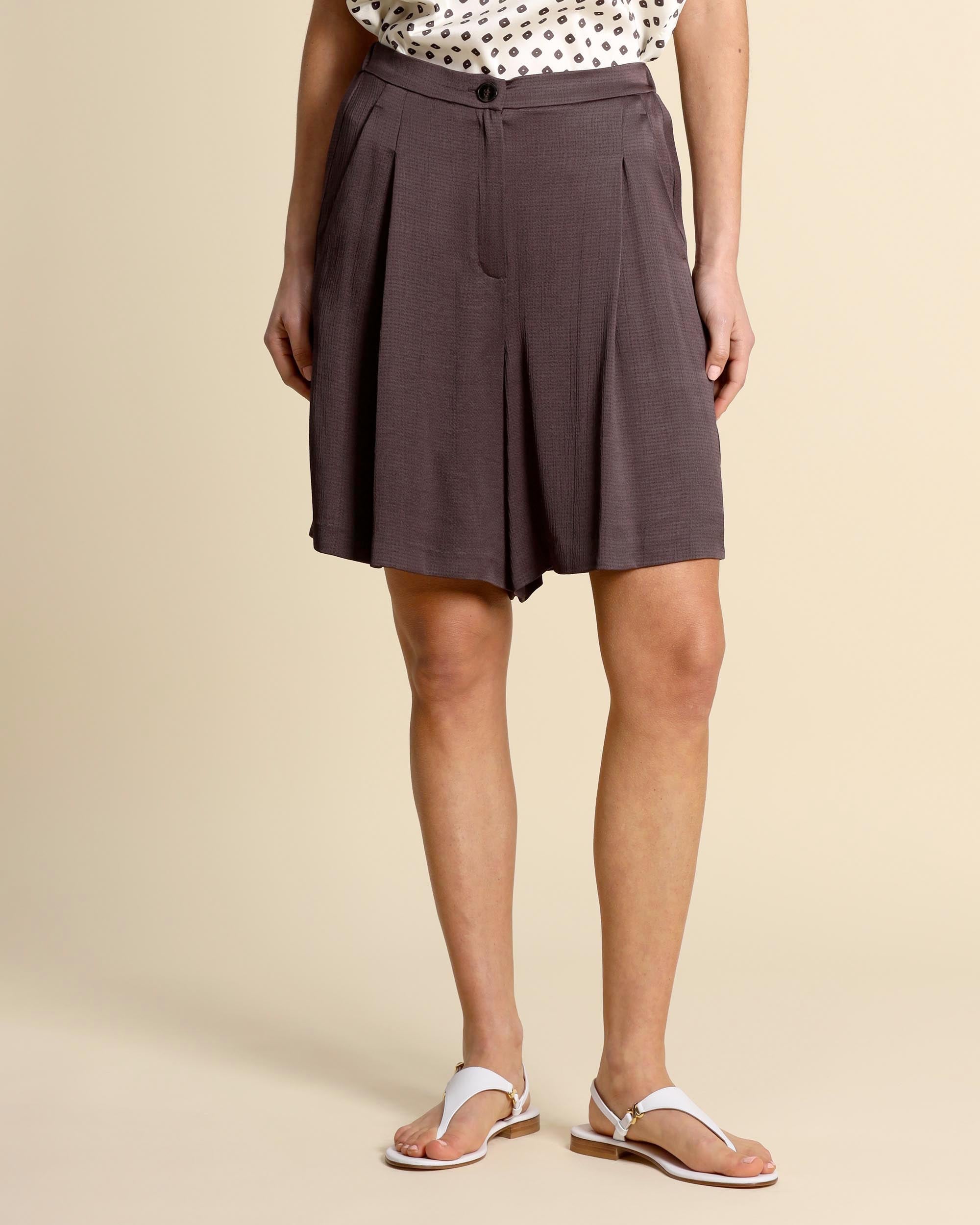 Fließende, dunkelbraune Bermuda-Shorts aus gewaschenem Viskose-Acetat mit gehämmertem Muster, Knopf- und verdecktem Reißverschluss, elastischem Bund hinten, französischen Taschen und lockerer Passform. Das Model trägt Größe 42 und hat folgende Maße: Körpergröße 177 cm, Brustumfang 86 cm, Taillenumfang 65 cm, Hüftumfang 93 cm. Emme by Marella Damenkollektion Frühjahr/Sommer 2026.
