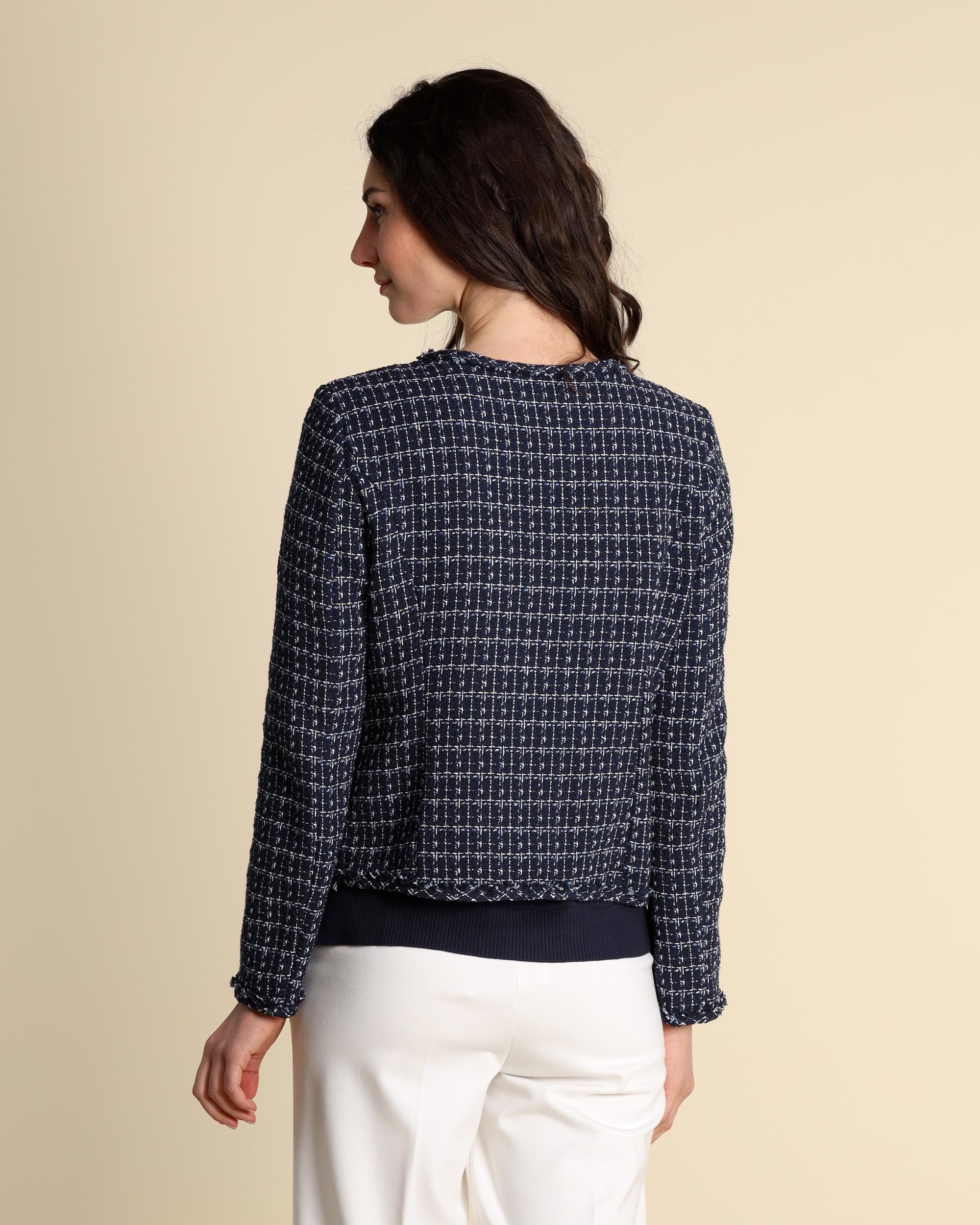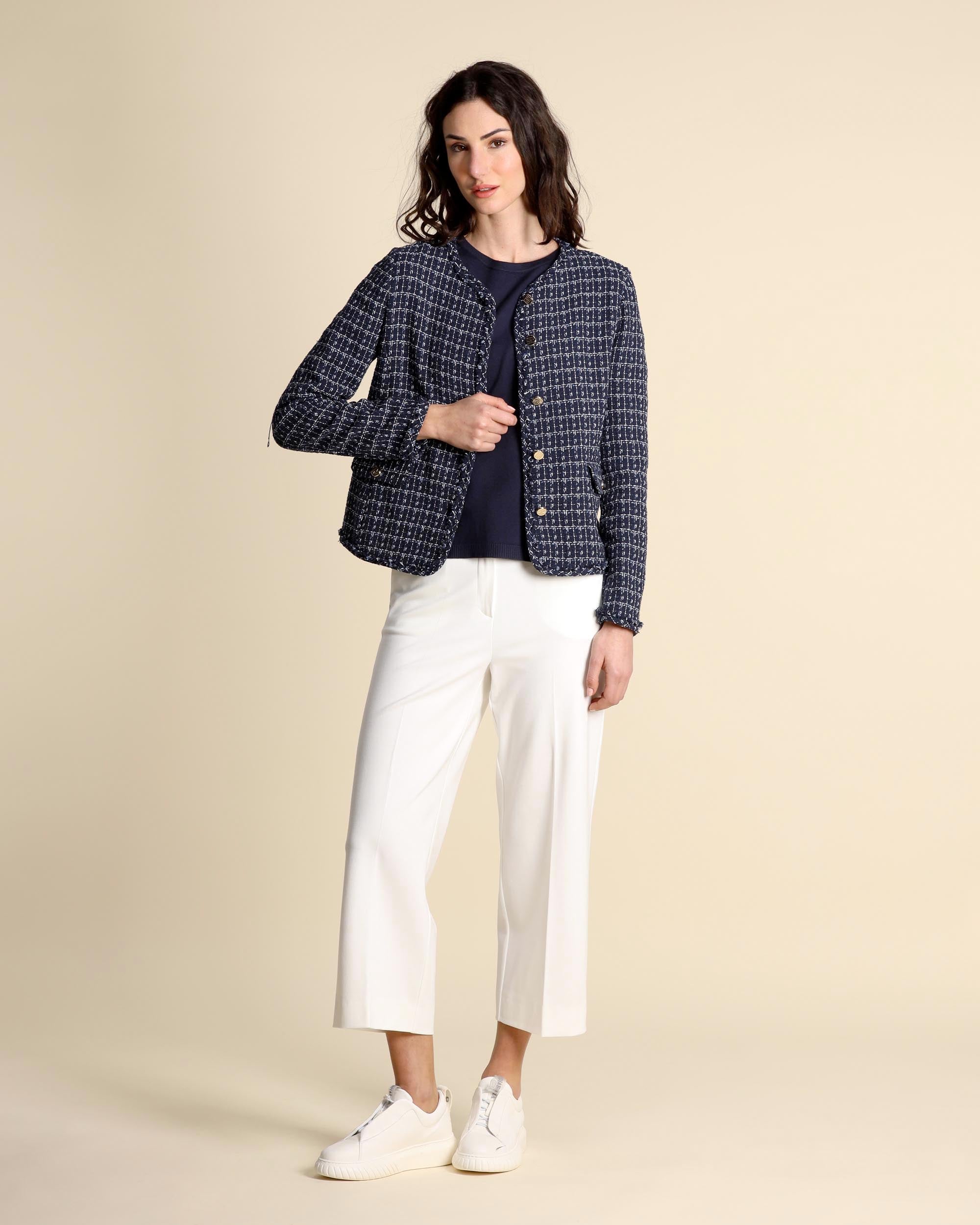 Blaue, garngefärbte Webjacke aus einem Baumwollmischgewebe (mindestens 50 % recycelte Baumwolle), Rundhalsausschnitt, leicht taillierte Passform, Verschluss mit personalisierten Knöpfen, Pattentaschen mit Knopf, lange Ärmel, ungefüttert, ausgefranste Kanten. Das Model trägt Größe 42 und hat folgende Maße: Körpergröße 177 cm, Brustumfang 86 cm, Taillenumfang 65 cm, Hüftumfang 93 cm. Damenkollektion Emme by Marella Frühjahr/Sommer 2026.