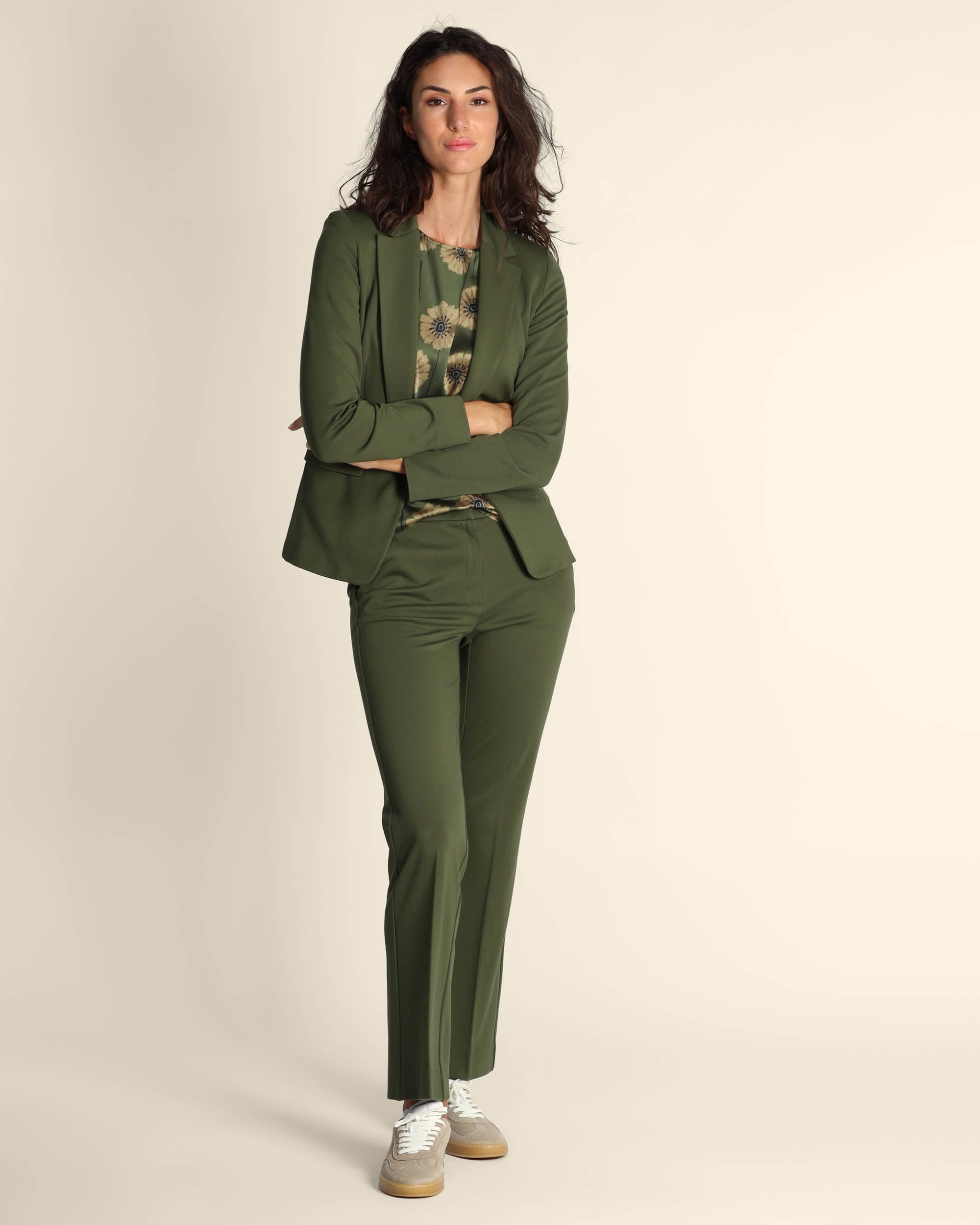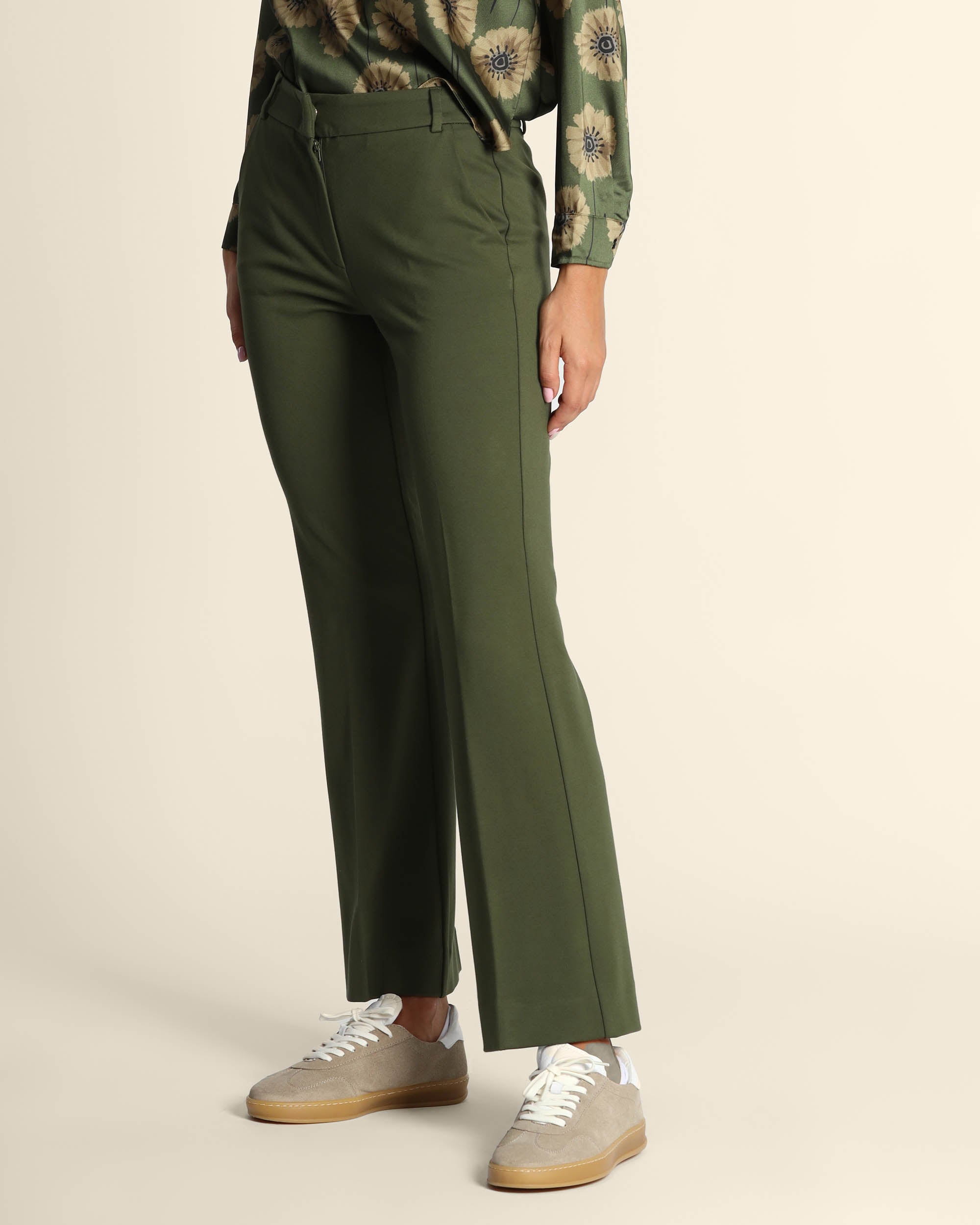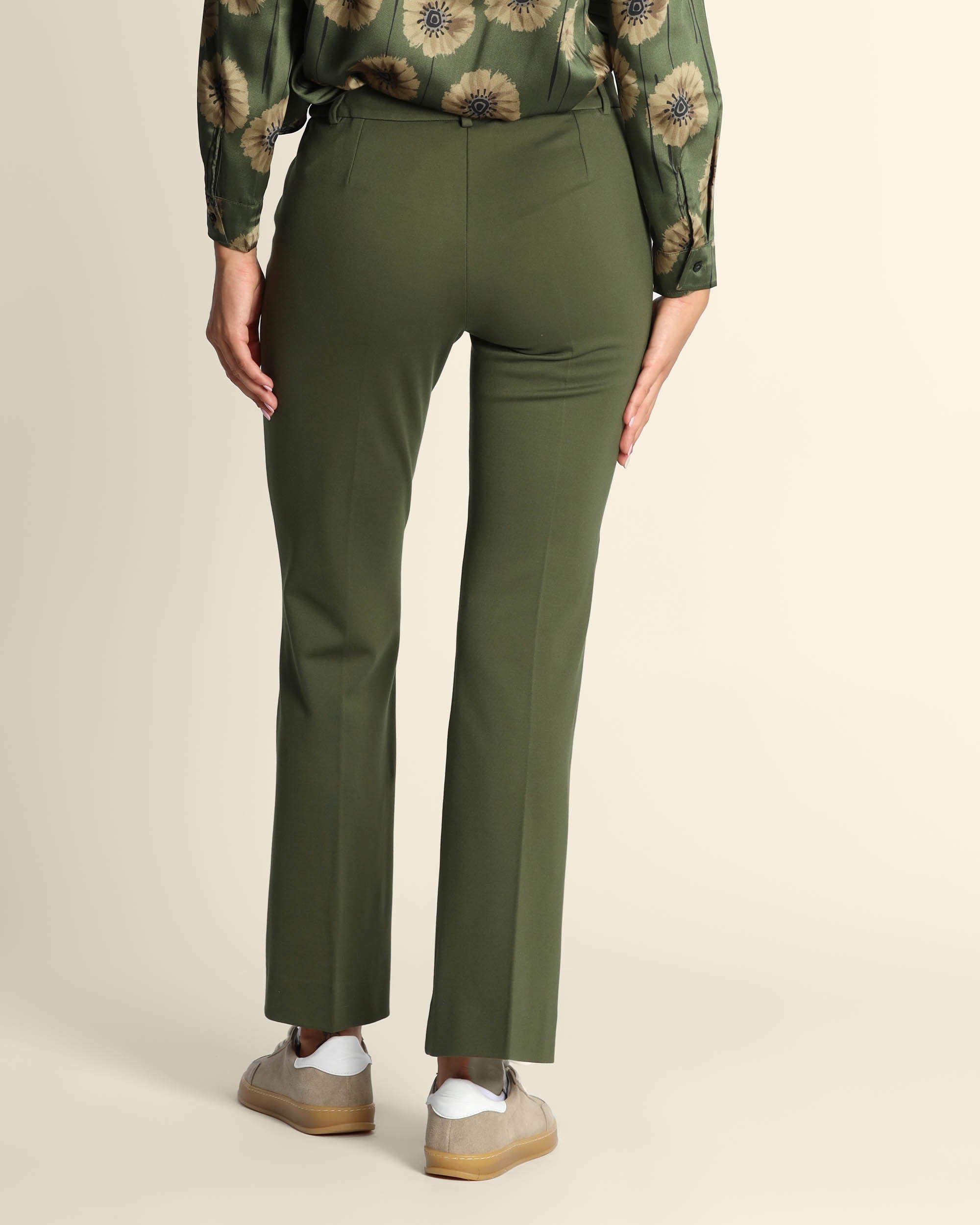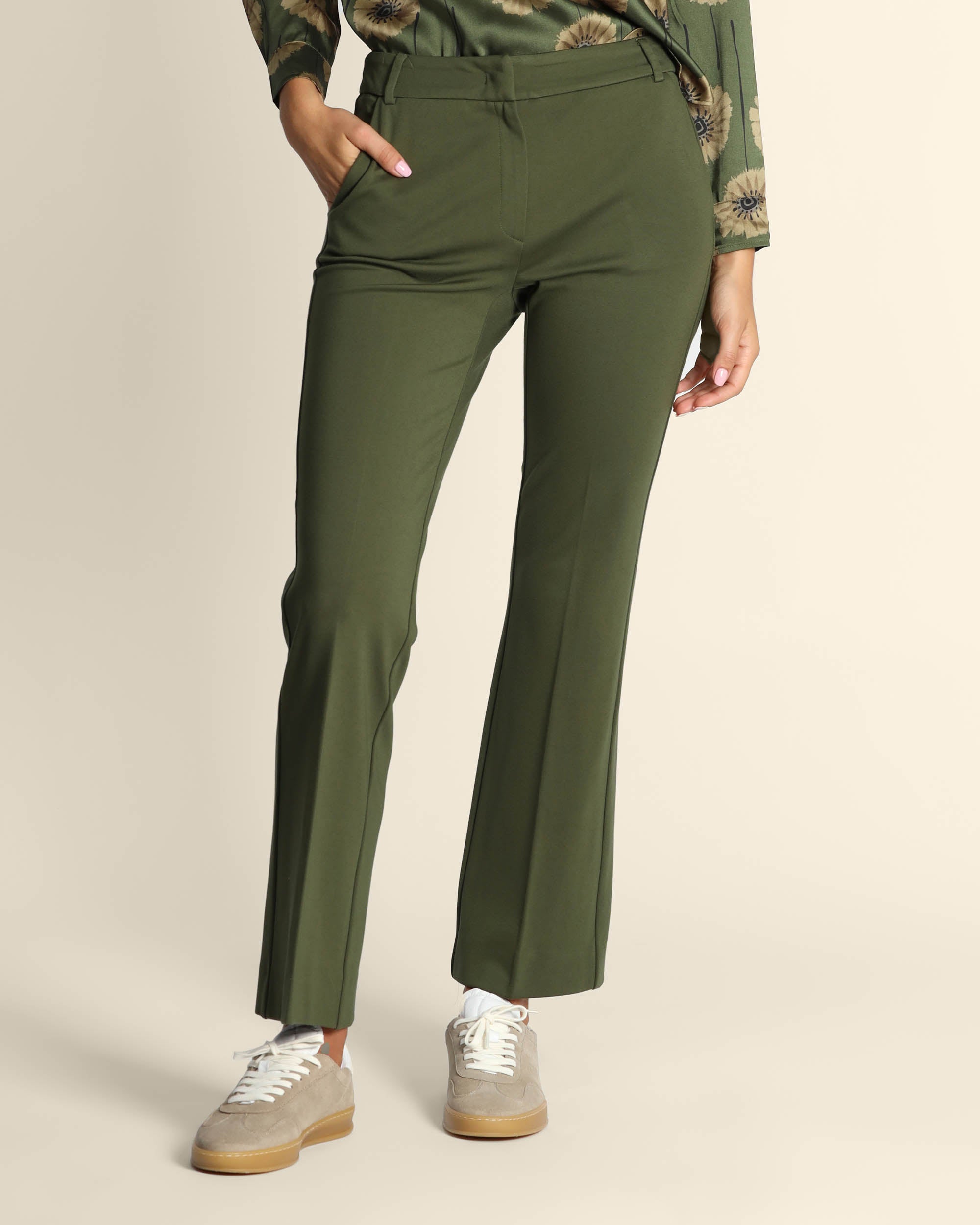 Pantaloni verdi in punto Milano di misto viscosa stretch, chiusura con gancio e zip nascosti, linea flare, tasche alla francese, piega stirata danti e dietro, la modella indossa una tg.S, la modella ha le seguenti misure: altezza 178, seno 86,vita 65, fianchi 93, collezione donna Emme by Marella Autunno Inverno 2025/26