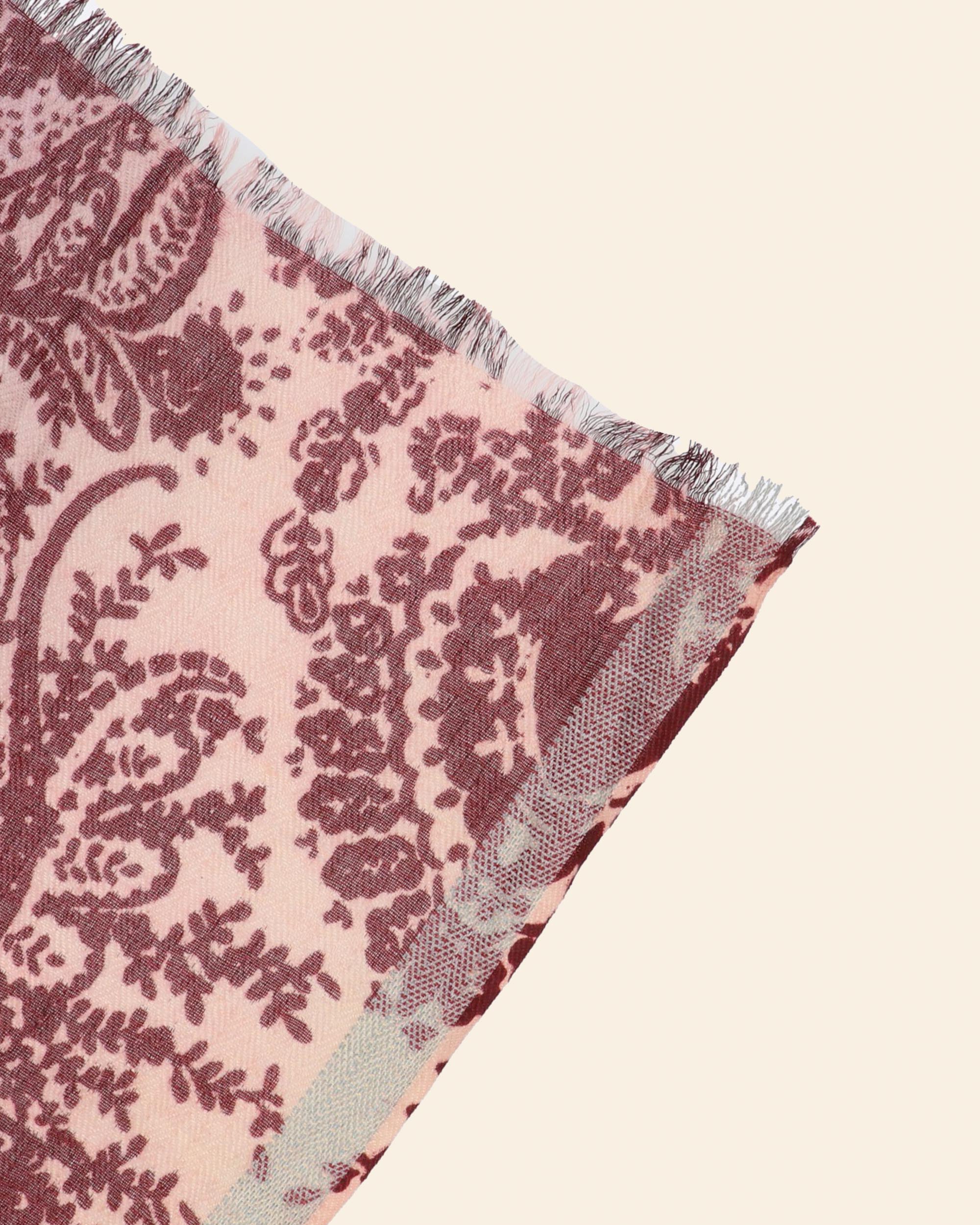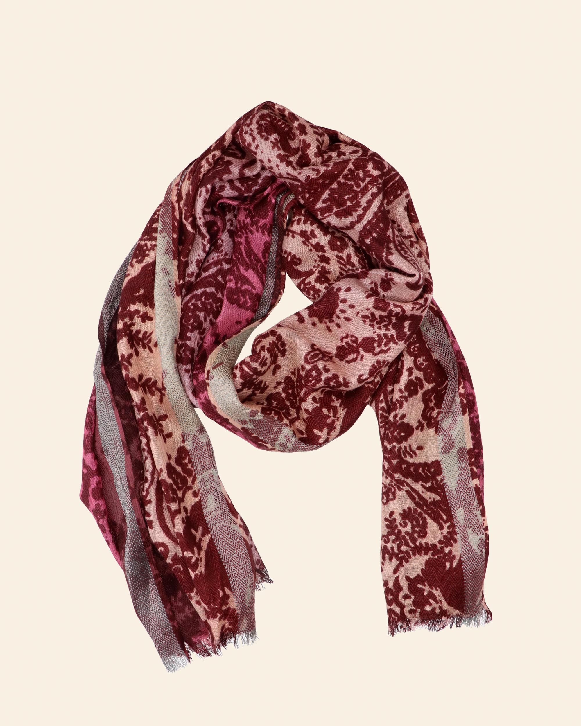 Stola in 100% lana a fantasia bordeaux, fucsia e beige, misura 90 cm x 200 cm, collezione donna Pyaar Autunno Inverno 2025/2026