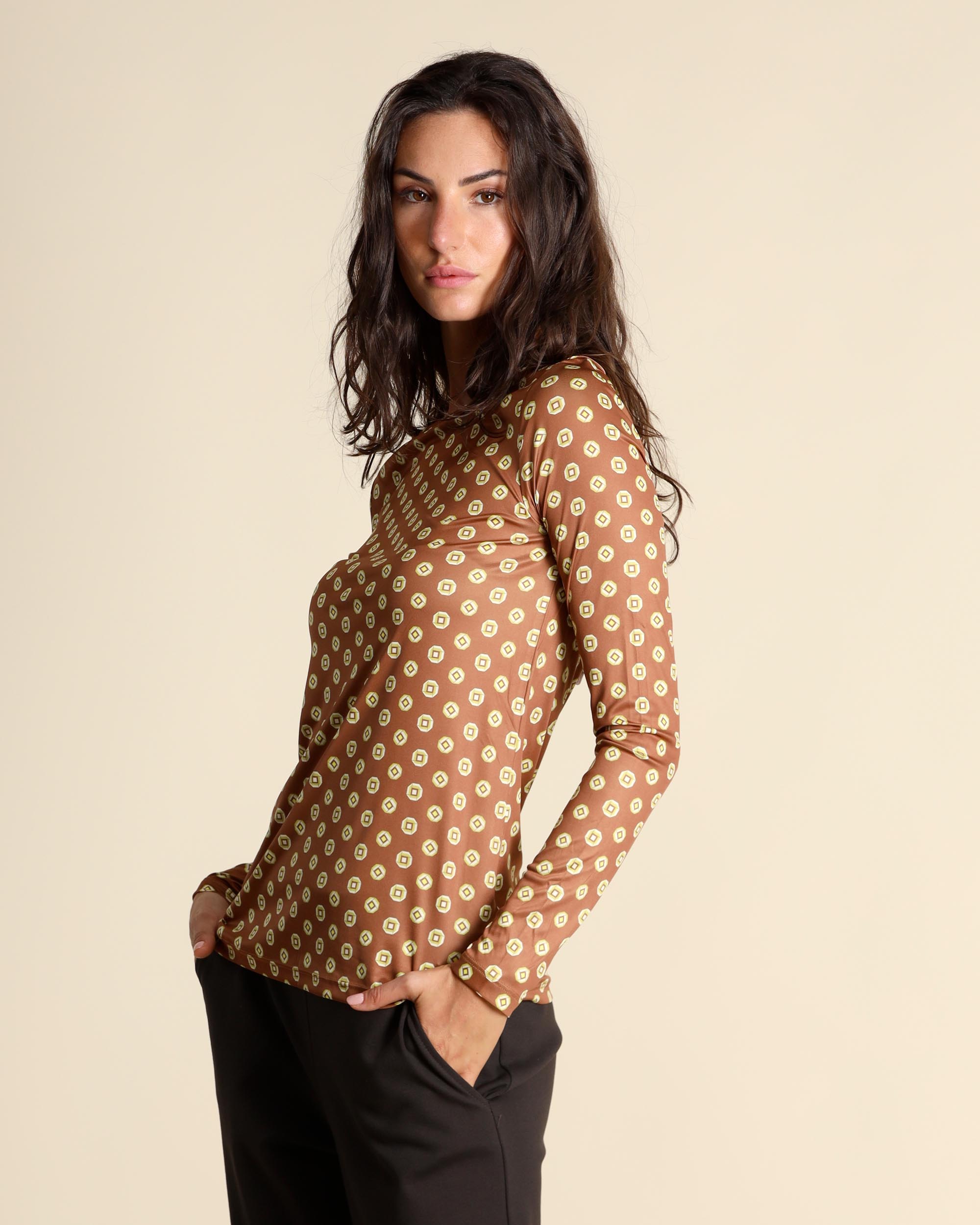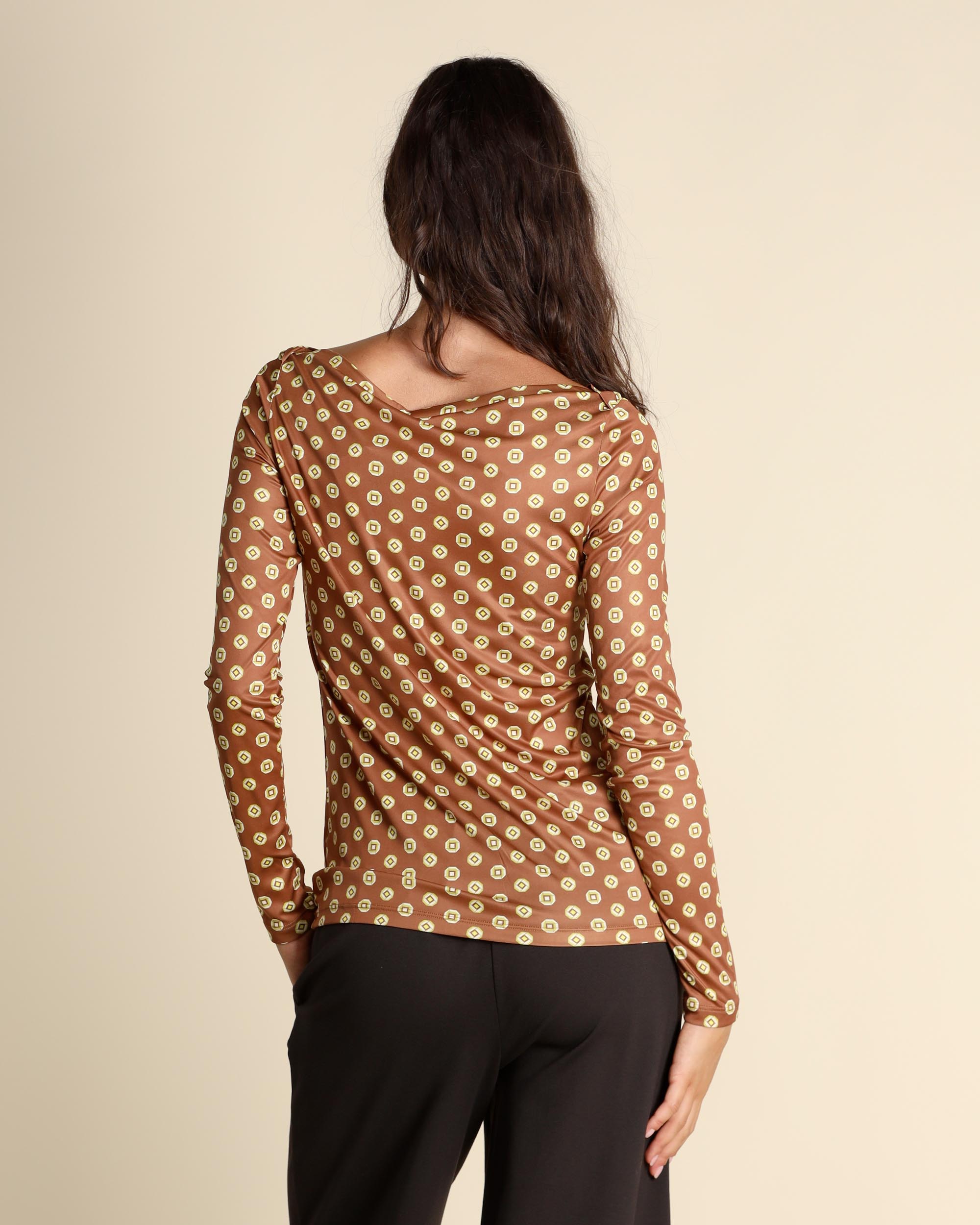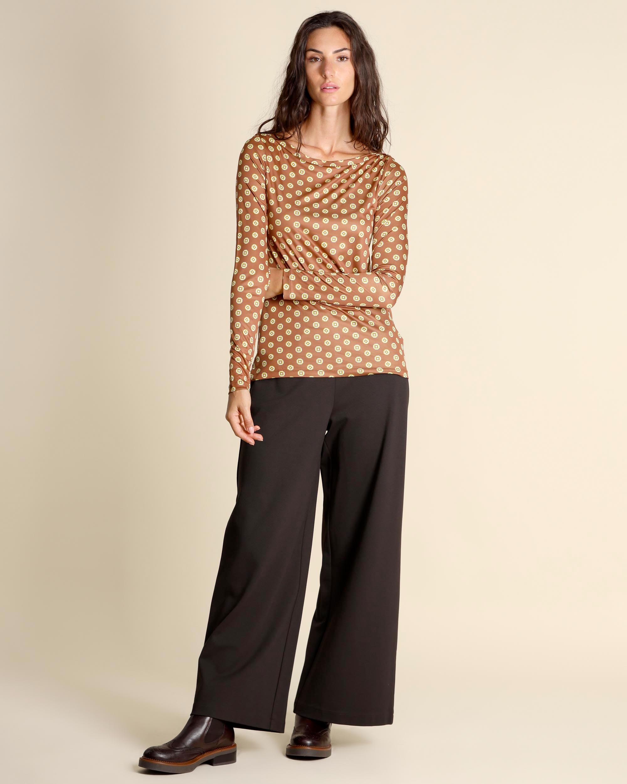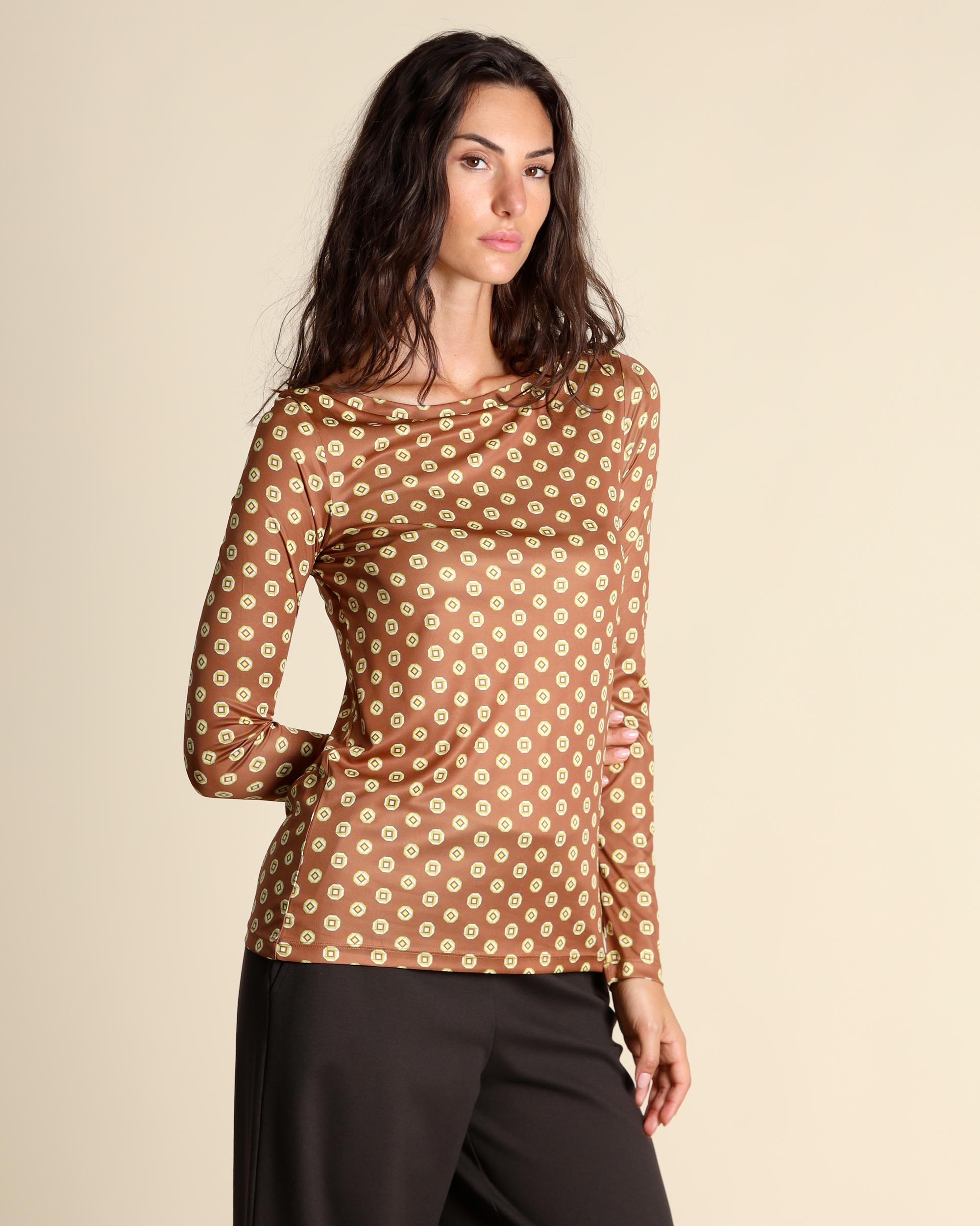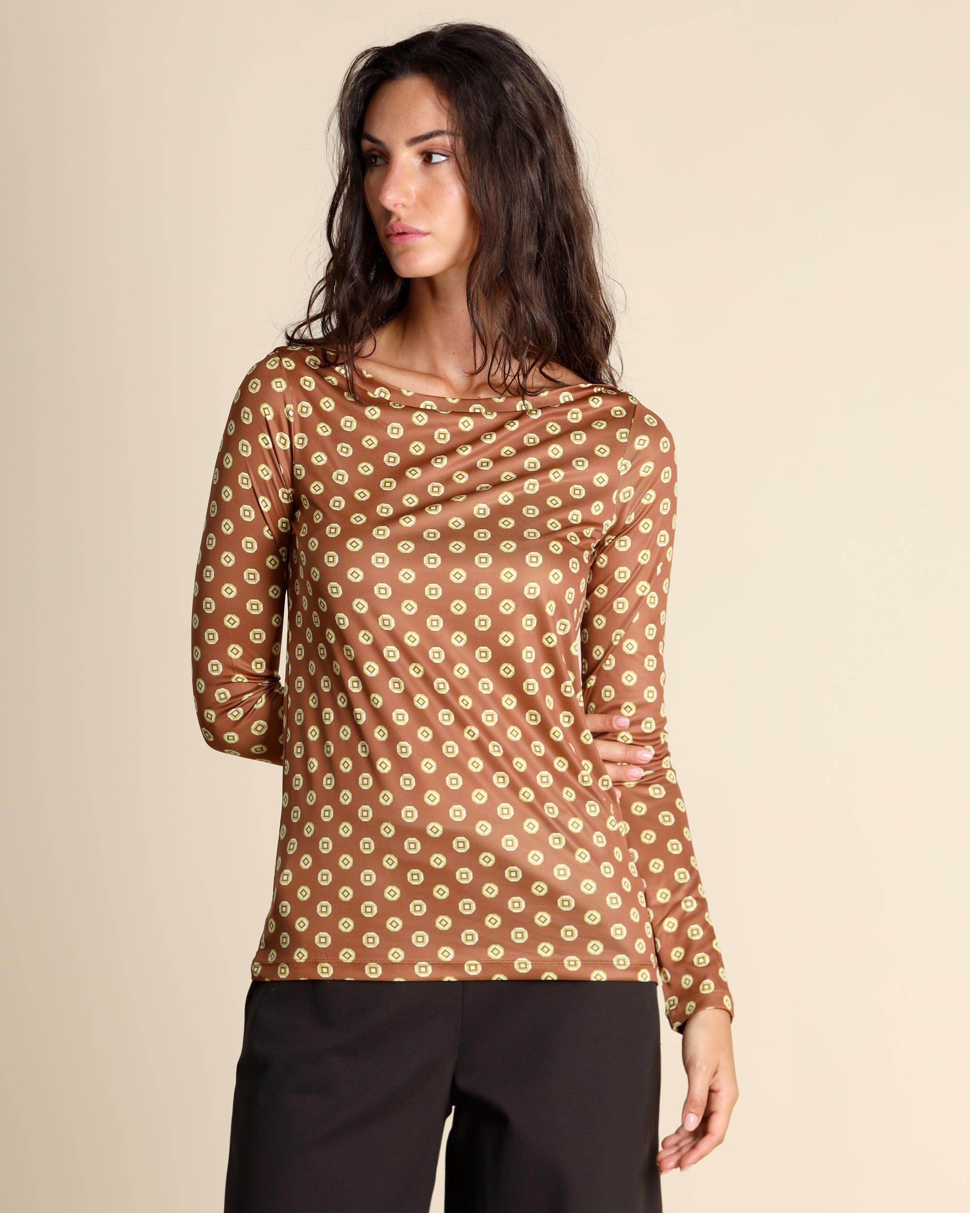 T shirt in jersey con micro stampa color cuoio, giallo e crema, scollo a barchetta, maniche lunghe, linea semiaderente, la modella indossa una tg.42, la modella ha le seguenti misure: altezza 178, seno 86,vita 65, fianchi 93, collezione donna Maliparmi Autunno Inverno 2025/26