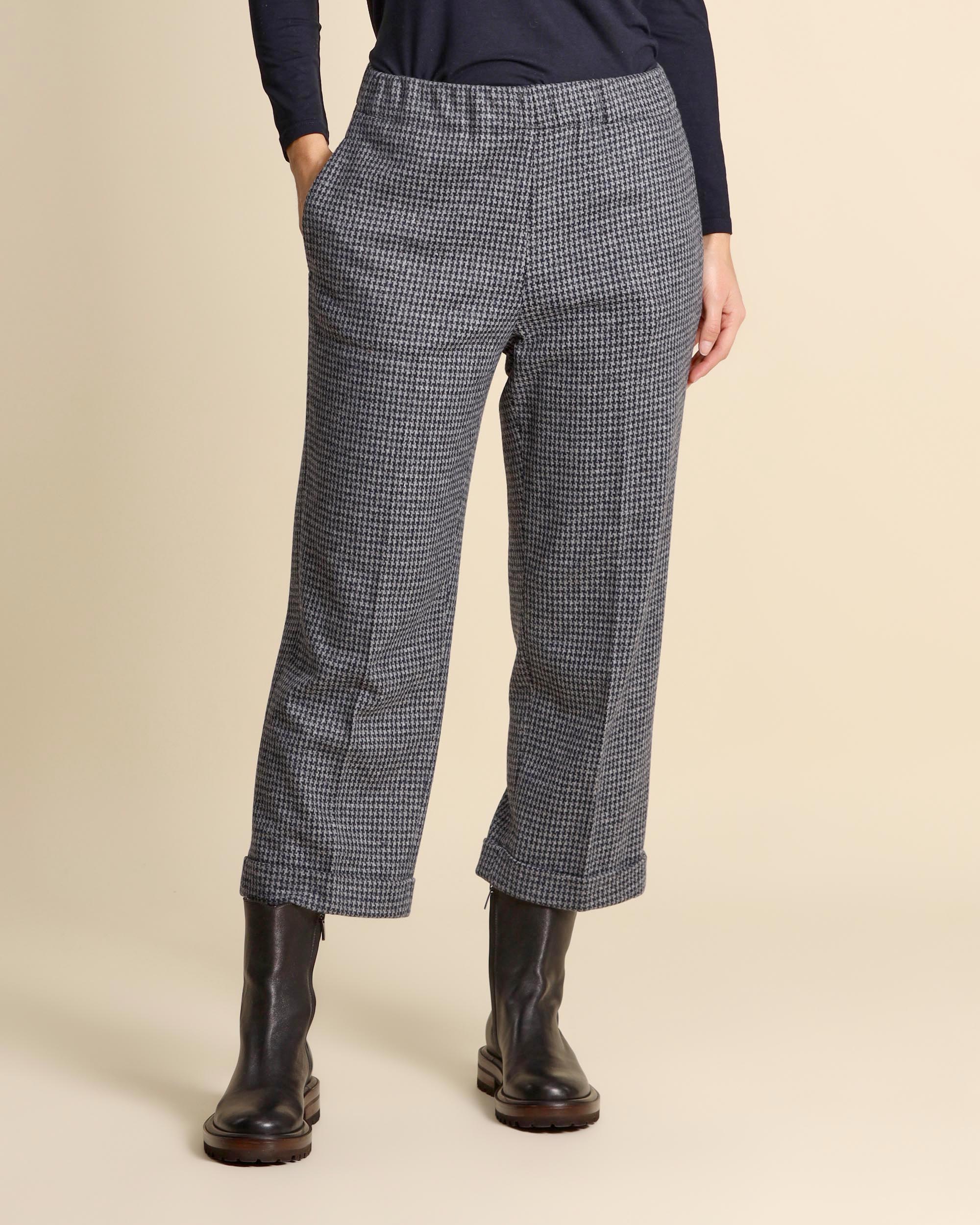 Pantaloni pied de poule grigio in misto lana e cashmere, vita elastica, tasche inserite sul fianco, linea dritta morbida, piega stirata, risvolto al fondo, made in Italy, la modella indossa una tg.42, la modella ha le seguenti misure: altezza 178, seno 86,vita 65, fianchi 93, collezione donna Liviana Conti Autunno Inverno 2025/26