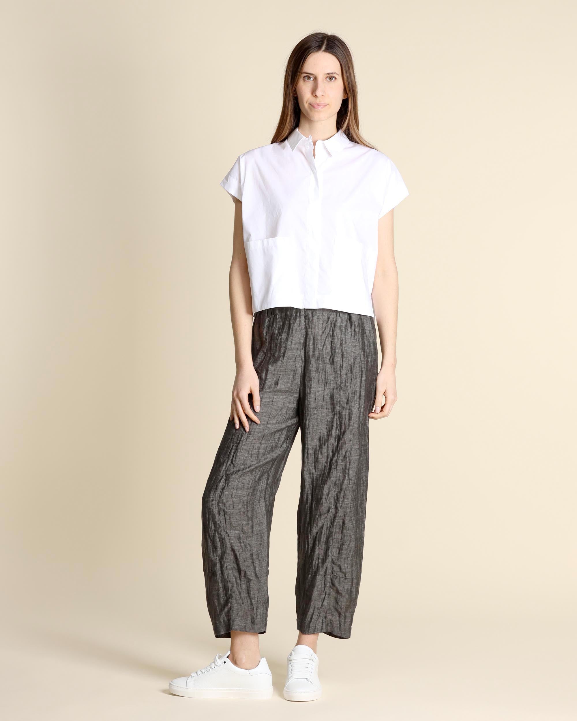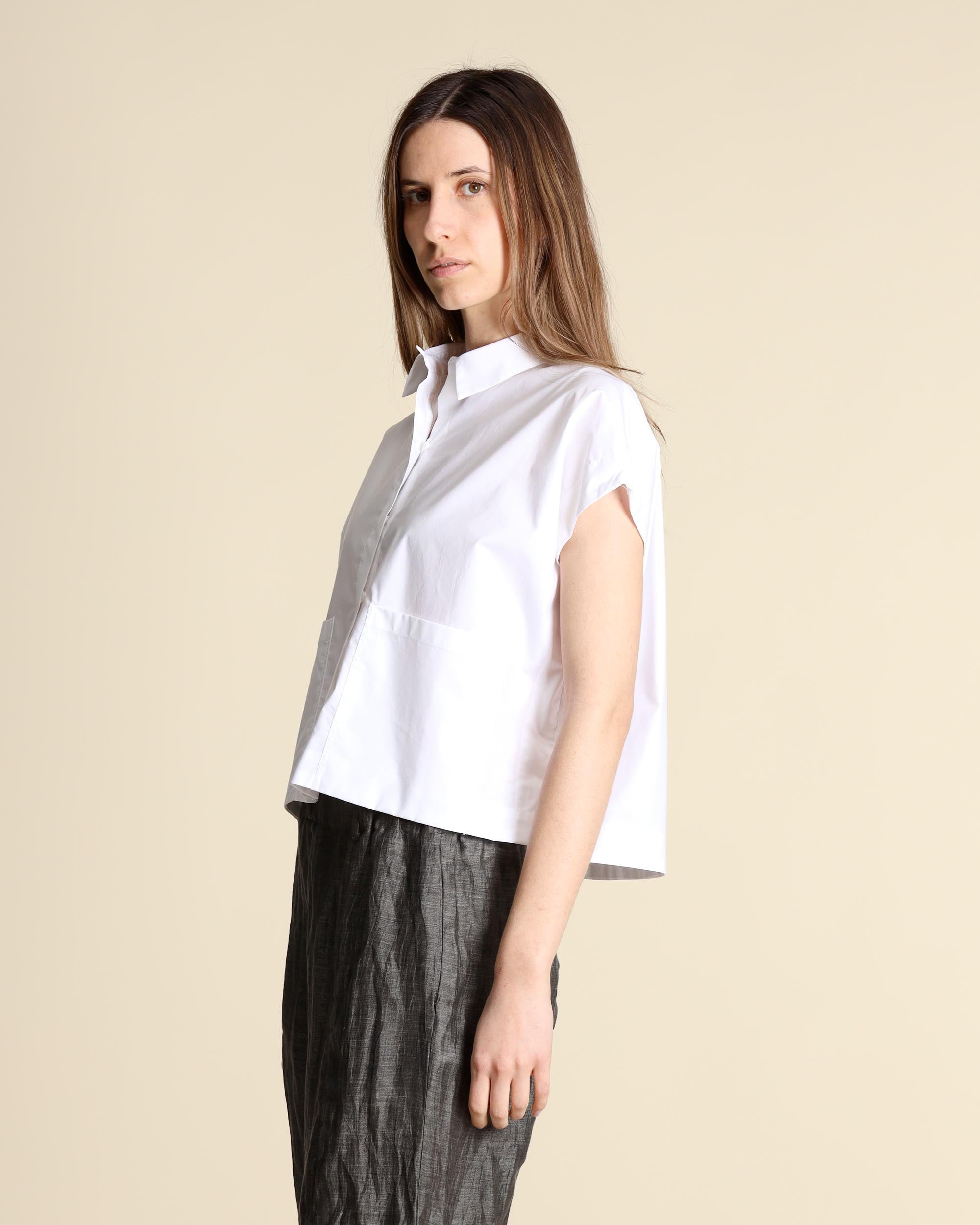 Camicia bianca in popeline di cotone, maniche ad aletta, collo a camicia, chiusura con bottoni, tasche applicate, linea boxy, la modella indossa una tg.S, la modella ha le seguenti misure: altezza 177, seno 86,vita 65, fianchi 93, collezione donna Niù Primavera Estate 2026