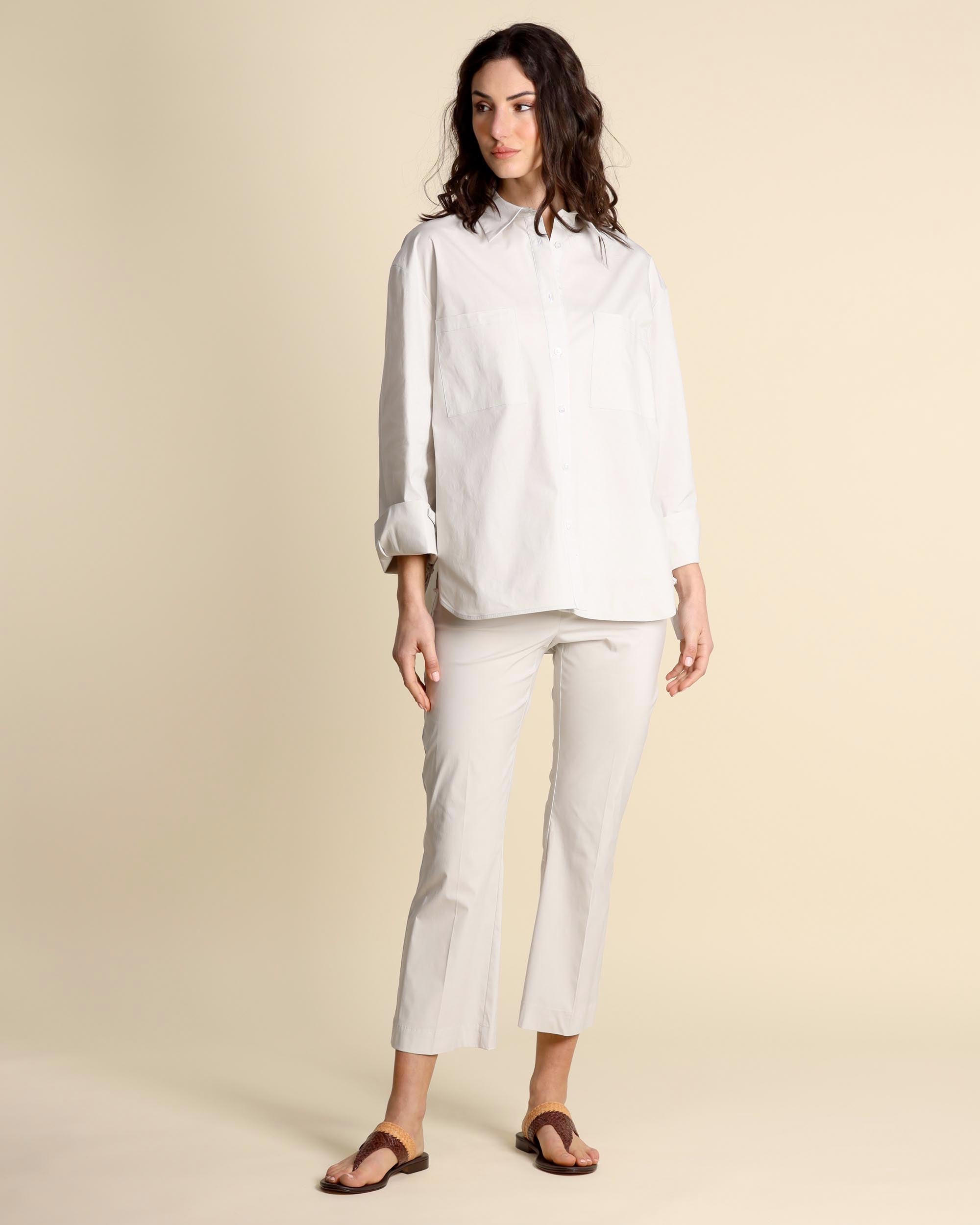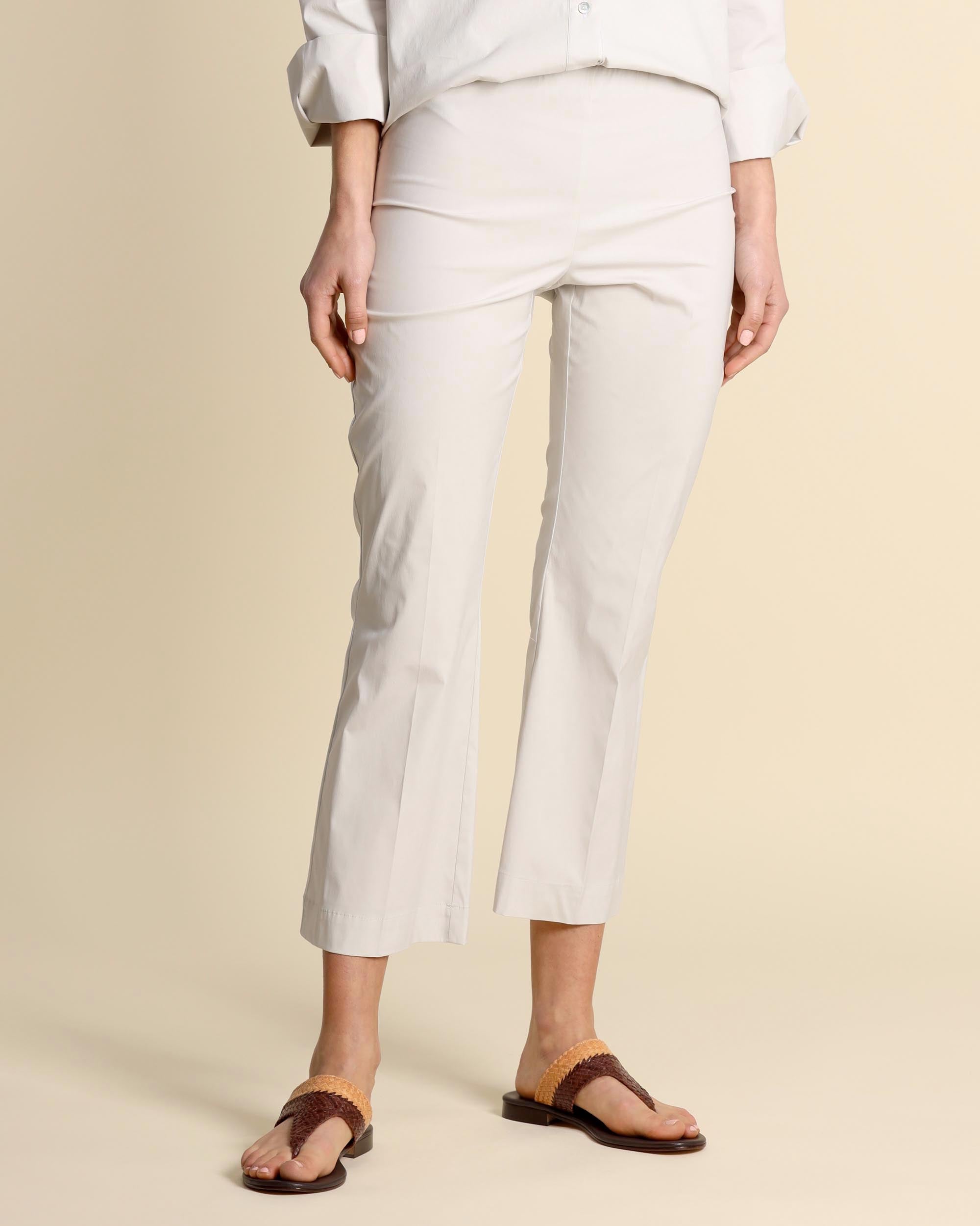 Chalk-colored trousers in stretch cotton blend poplin, elastic waist, fitted line with a slight trumpet at the bottom, made in Italy, the model is wearing a size 42, the model has the following measurements: height 178, bust 86, waist 65, hips 93, Liviana Conti women's collection Spring Summer 2026