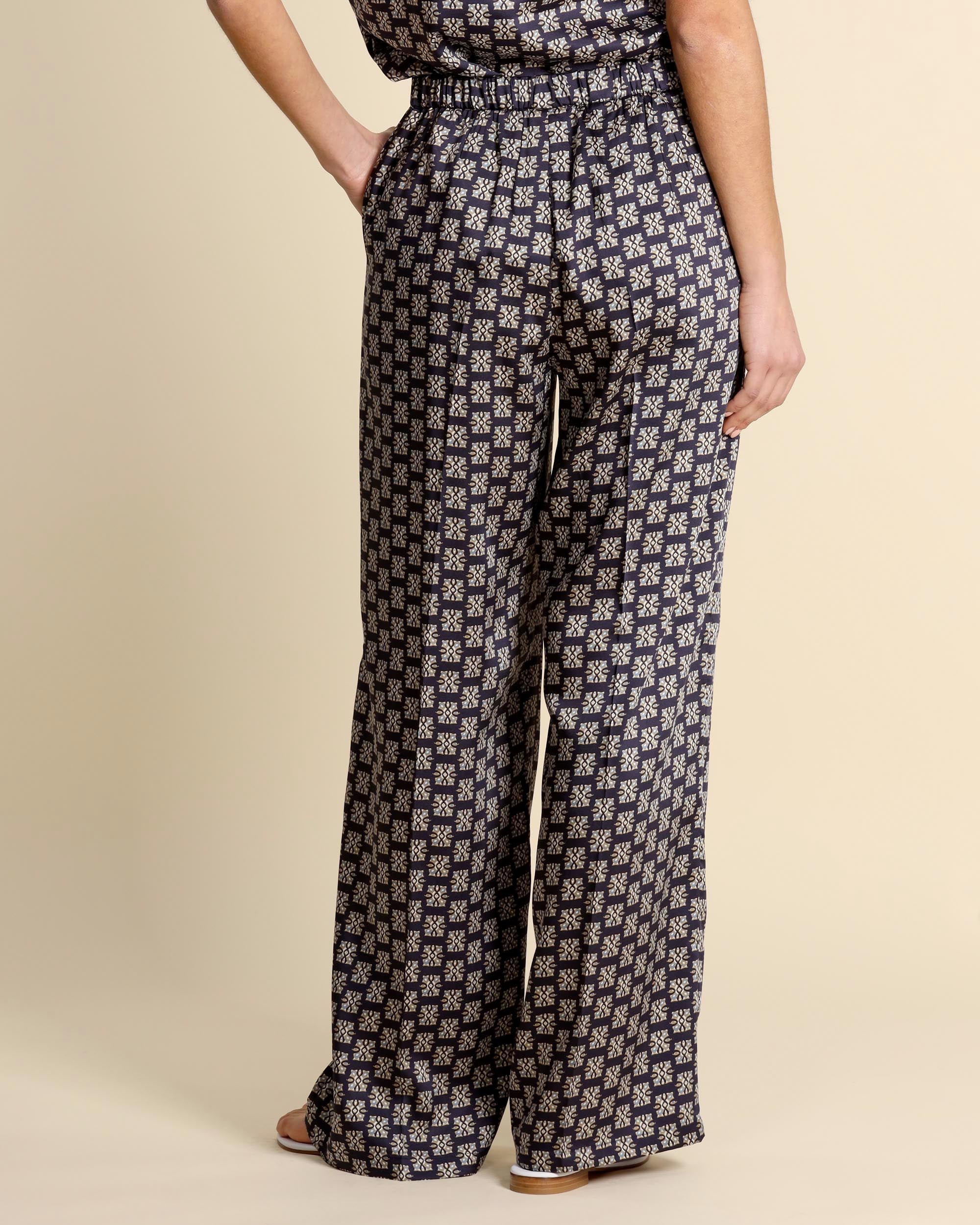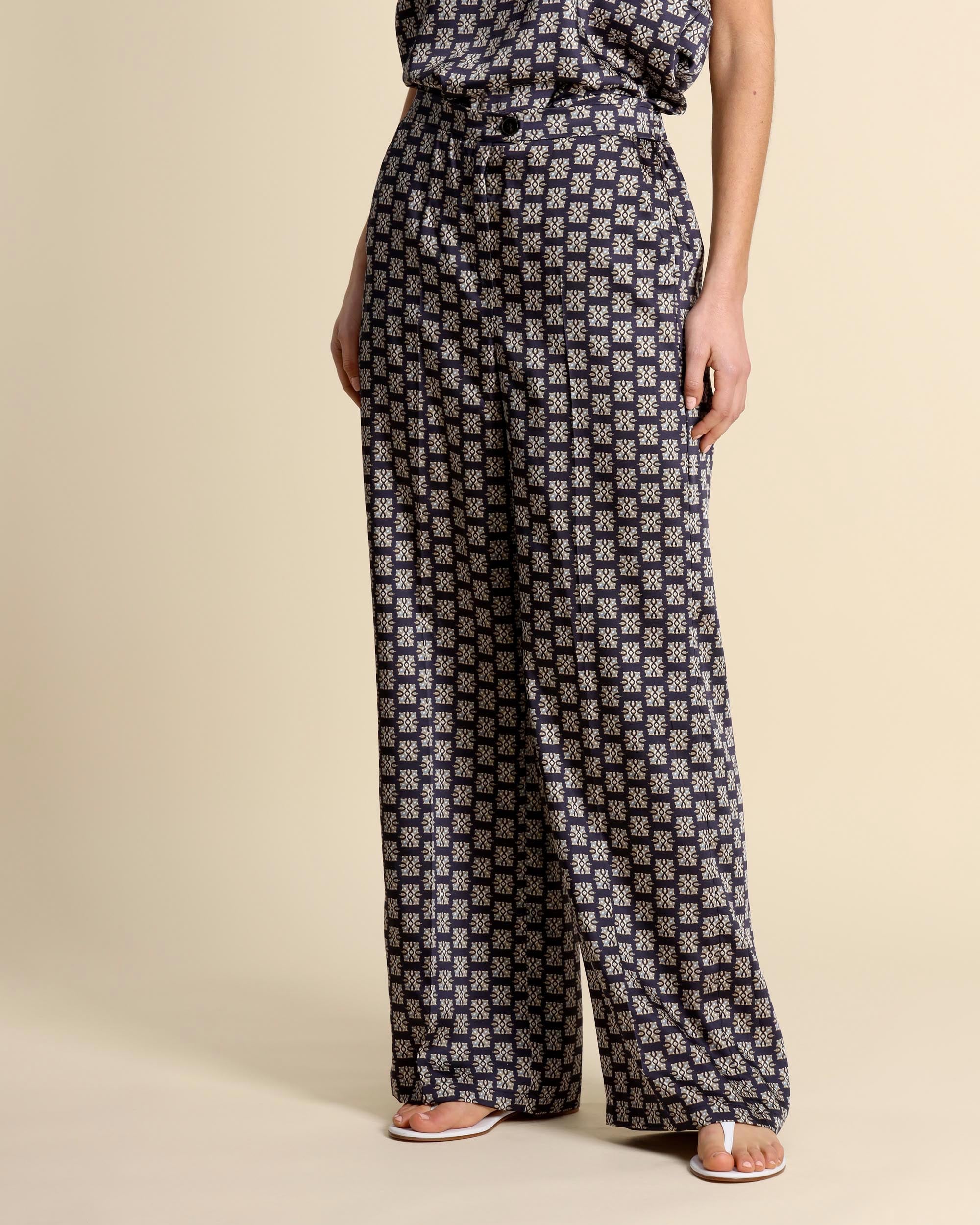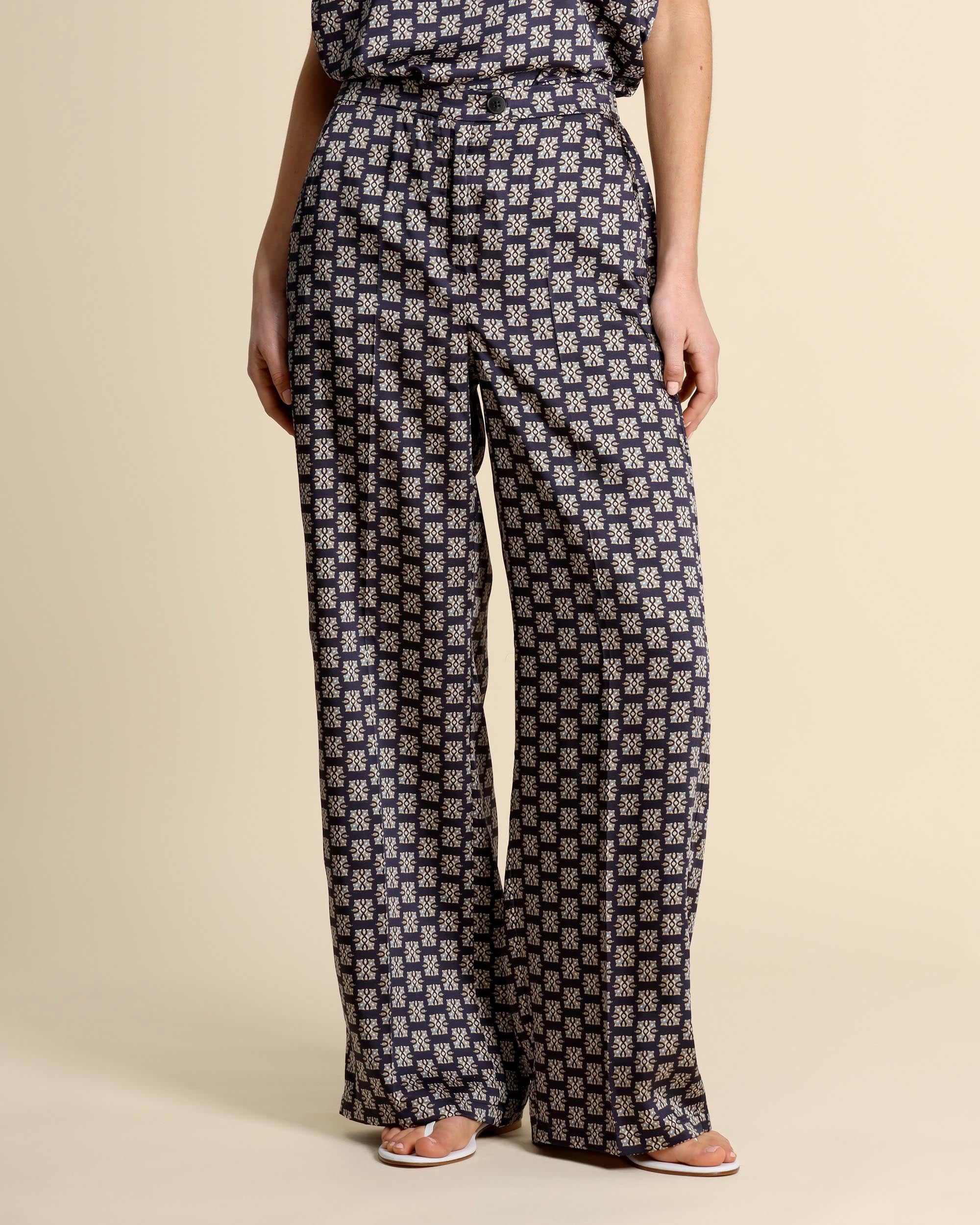 Blue patterned twill trousers, button and hidden zip fastening, elasticated waist on the back, French pockets, wide fit, pressed crease, the model is wearing a size 42, the model has the following measurements: height 177, bust 86, waist 65, hips 93, Emme by Marella women's collection Spring Summer 2026