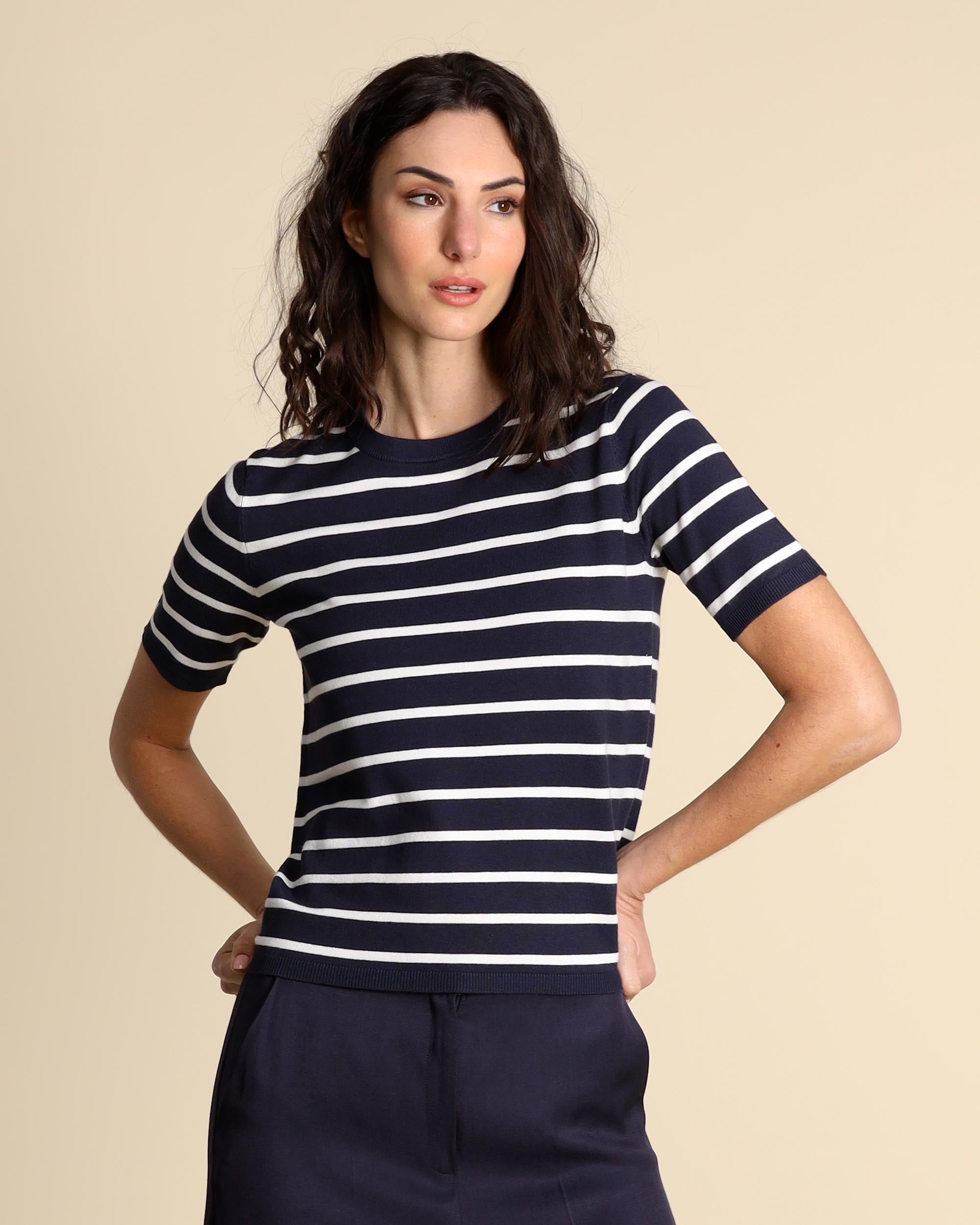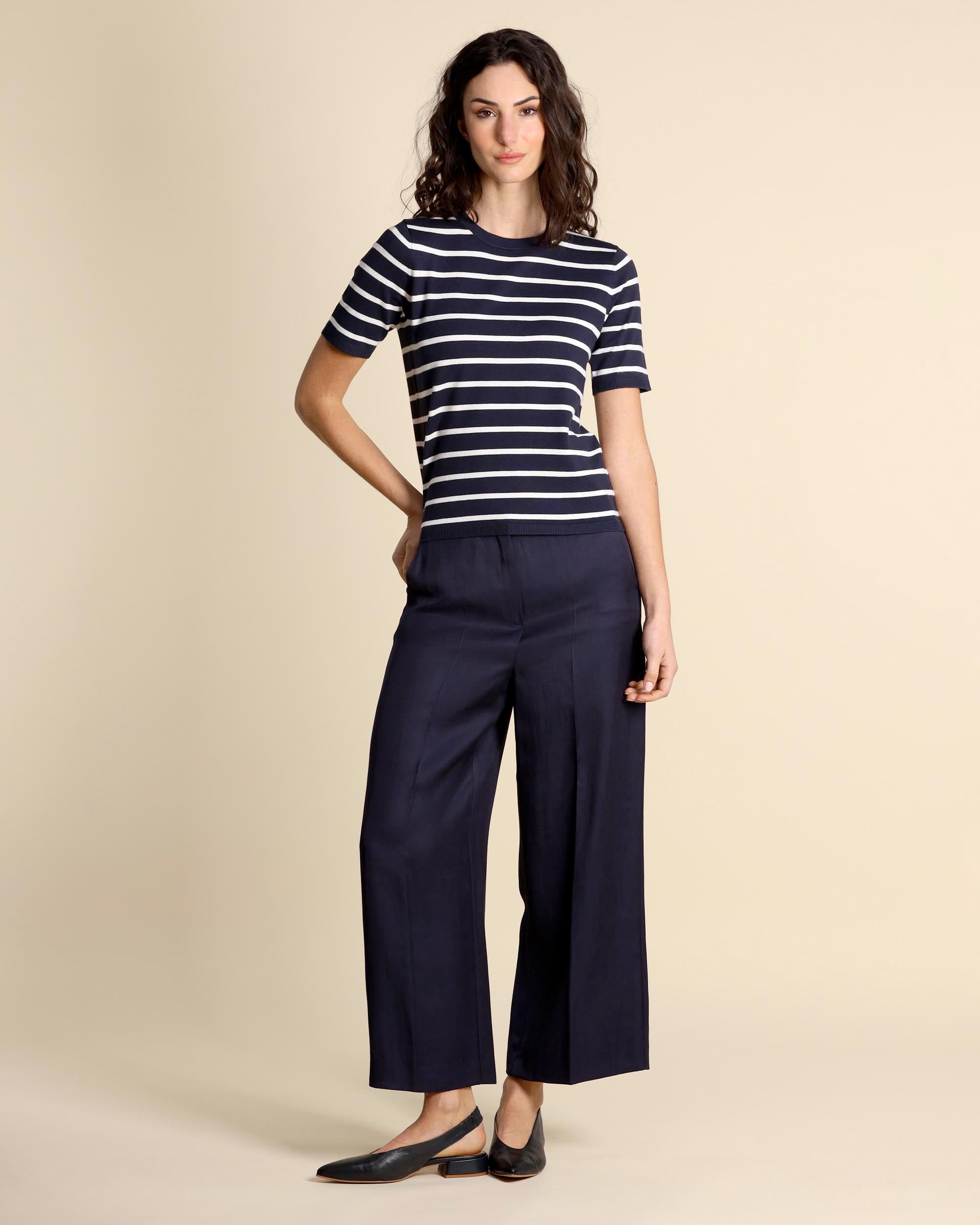 Blue stretch viscose sweater with white stripes, round neckline, straight fit, short sleeves, the model is wearing a size S, the model has the following measurements: height 177, breast 86, waist 65, hips 93, women's collection Emme by Marella Spring Summer 2026