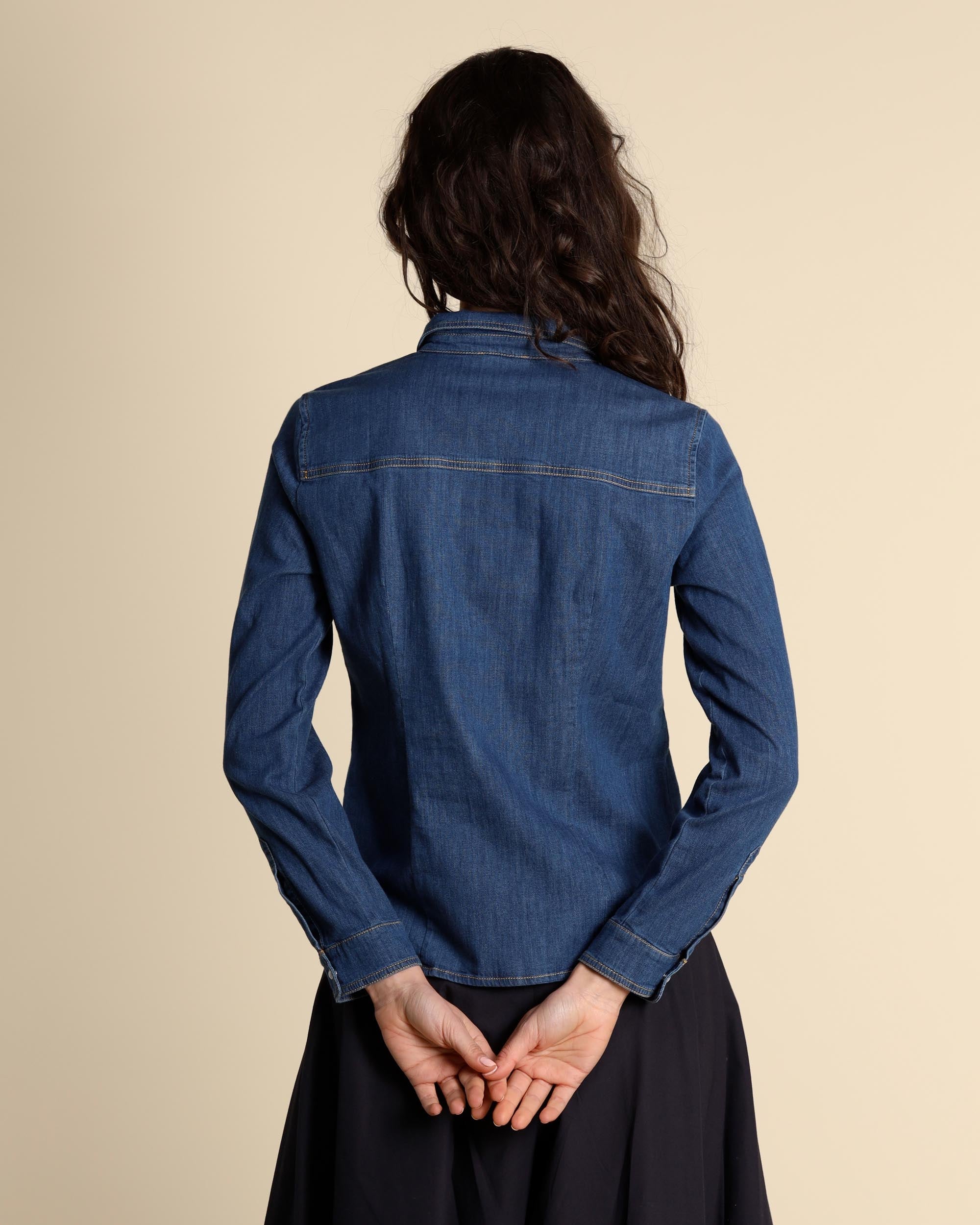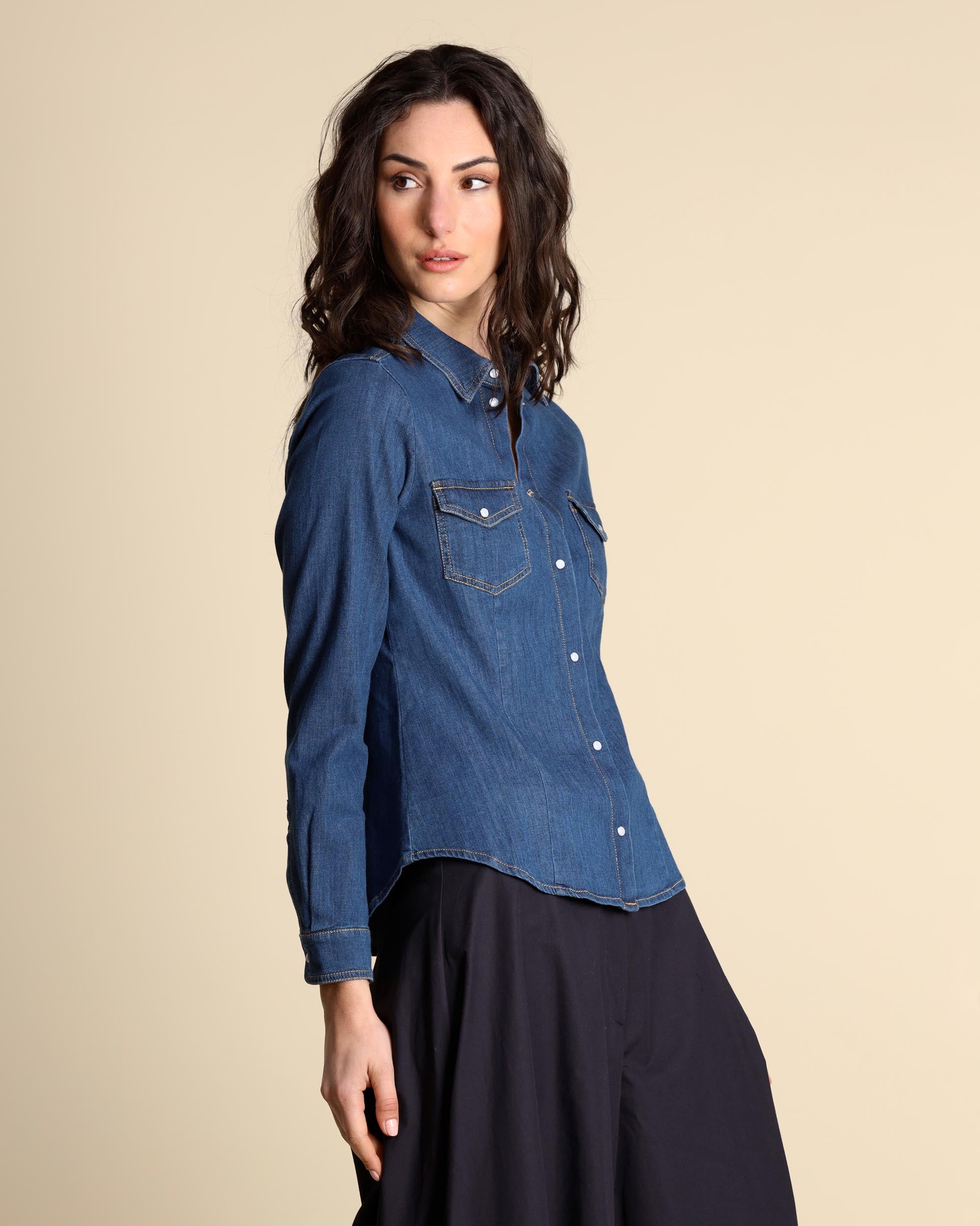 Light blue garment-treated cotton denim shirt, shirt collar, long sleeves with cuffs, snap button closure, semi-fitted fit, patch pockets with flap and button, rounded hem, the model is wearing a size 42, the model has the following measurements: height 177, bust 86, waist 65, hips 93, Emme by Marella women's collection Spring Summer 2026