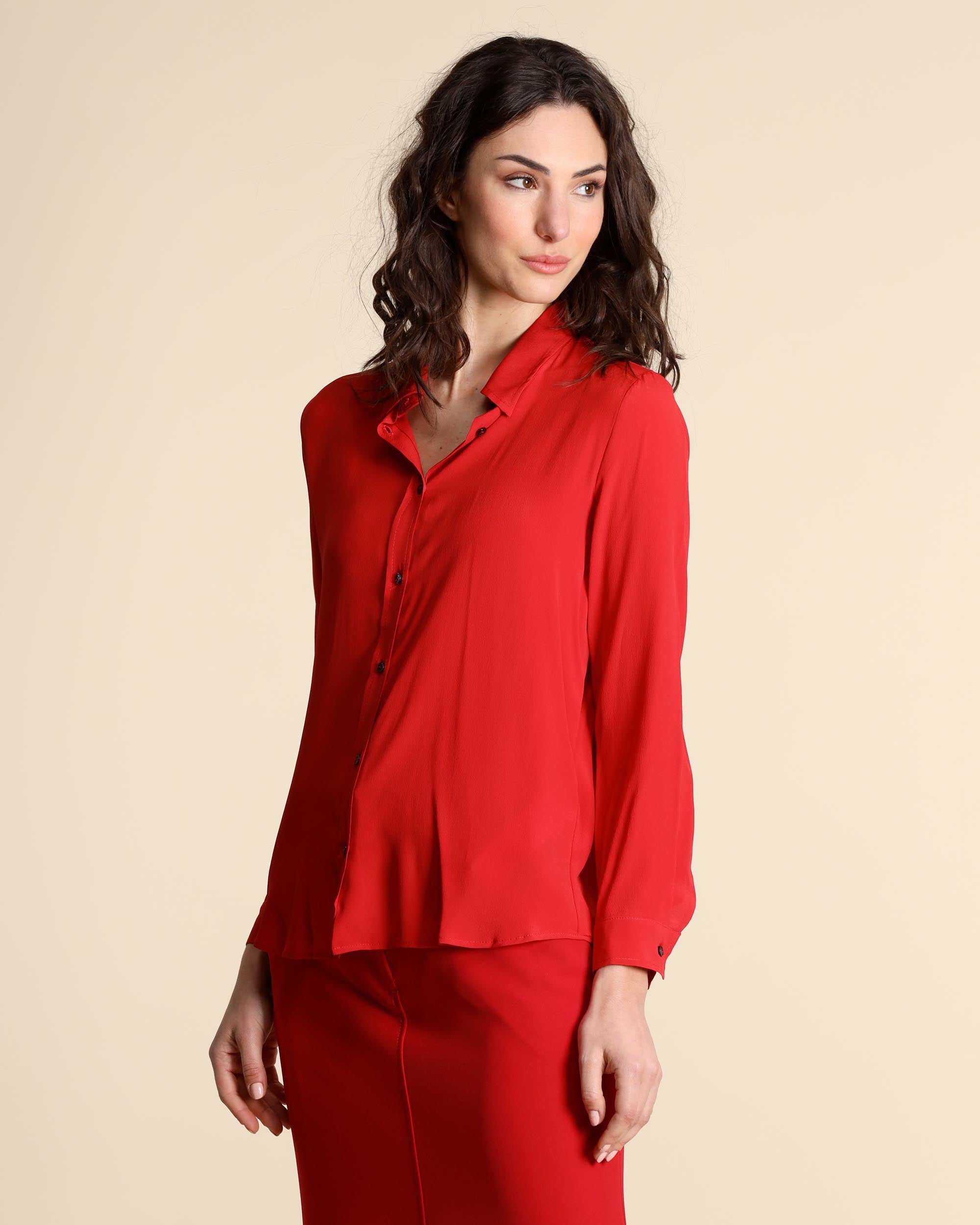 Red silk blend crepe shirt, shirt collar, straight fit, button closure, long sleeves with cuffs, the model is wearing a size 42, the model has the following measurements: height 177, bust 86, waist 65, hips 93, Emme by Marella women's collection Spring Summer 2026