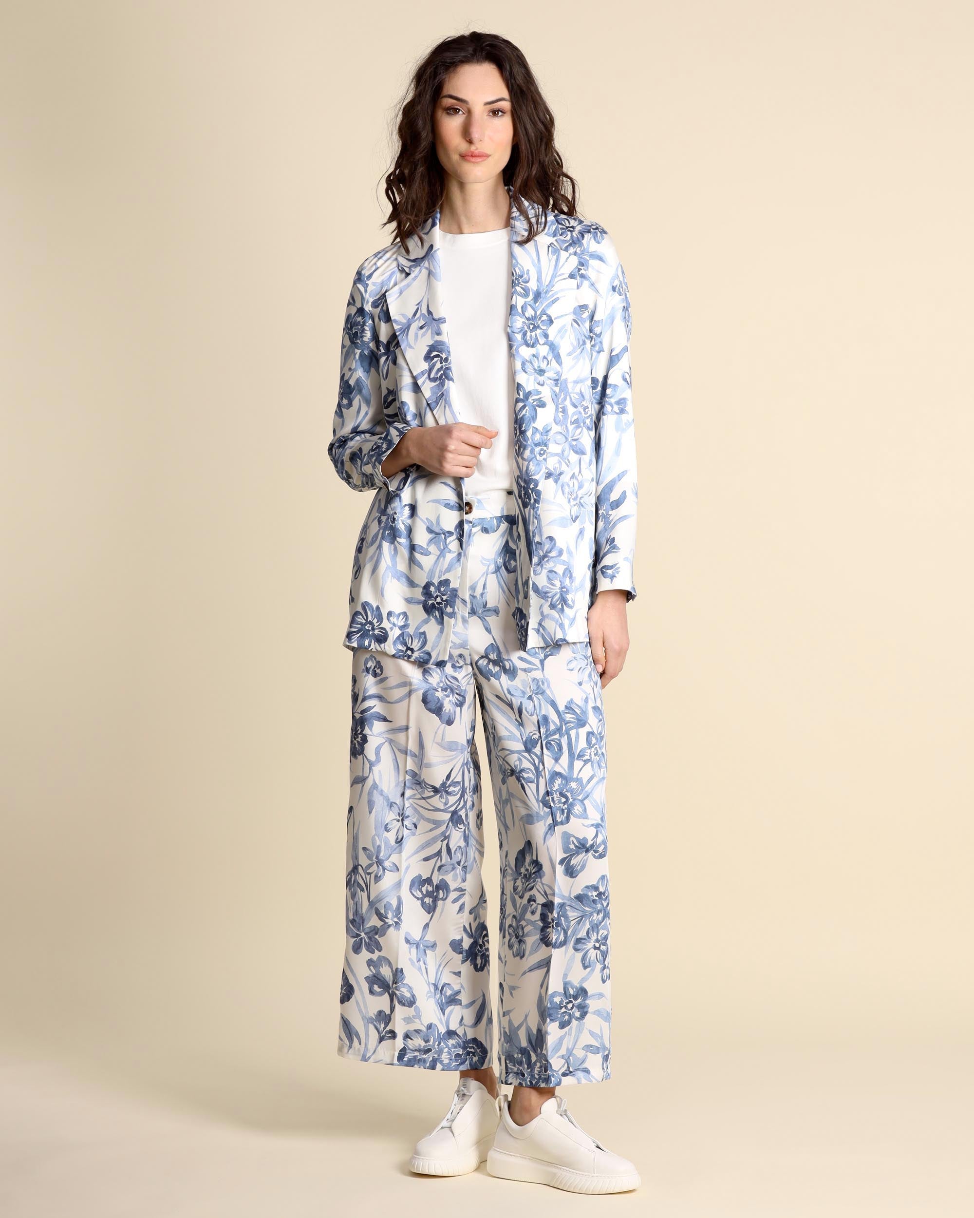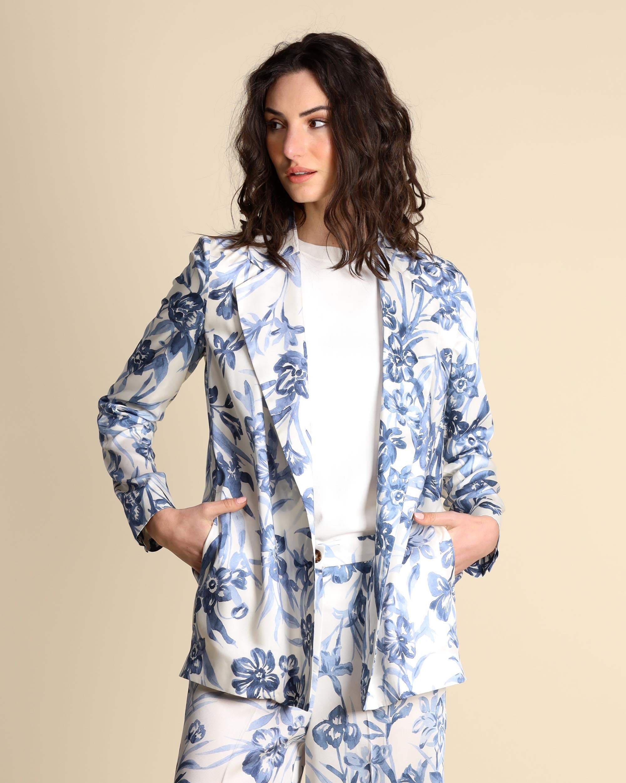 Ivory printed twill jacket, at least 50% recycled polyester, lapel collar, straight fit, no buttons, inset side pockets, long sleeves, lined, the model is wearing a size 42, the model has the following measurements: height 177, bust 86, waist 65, hips 93, Emme by Marella women's collection Spring Summer 2026