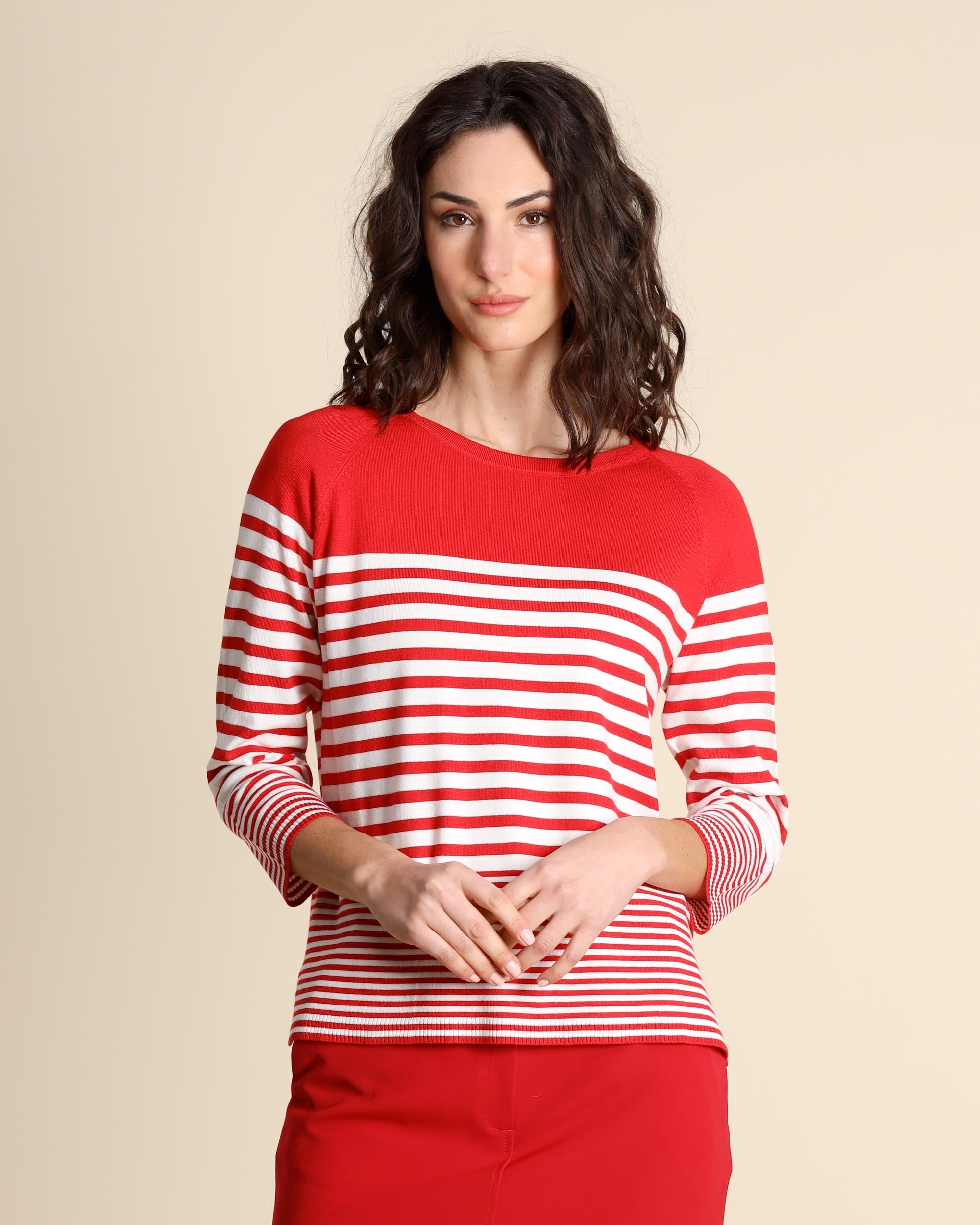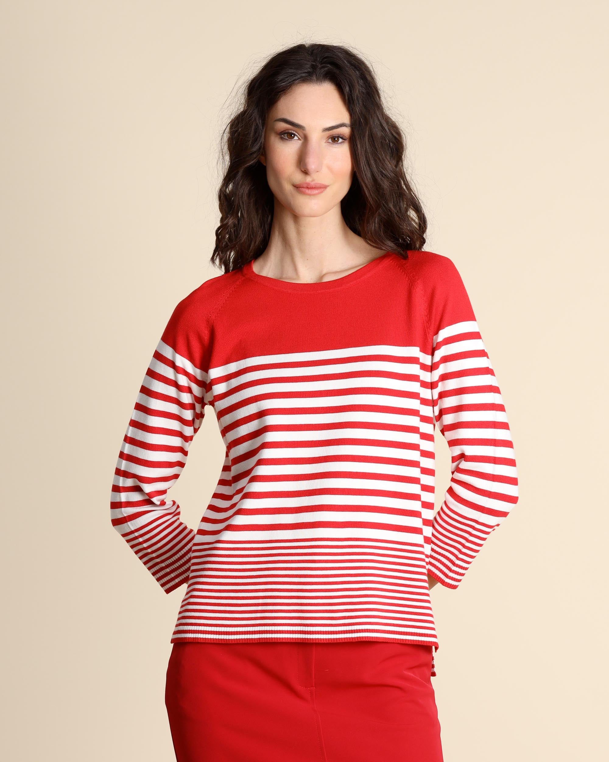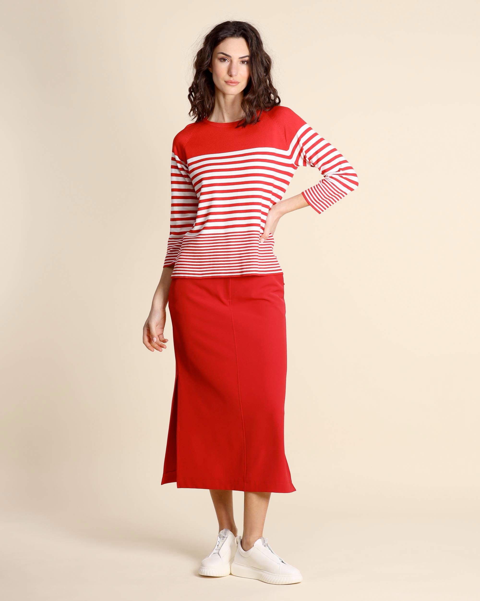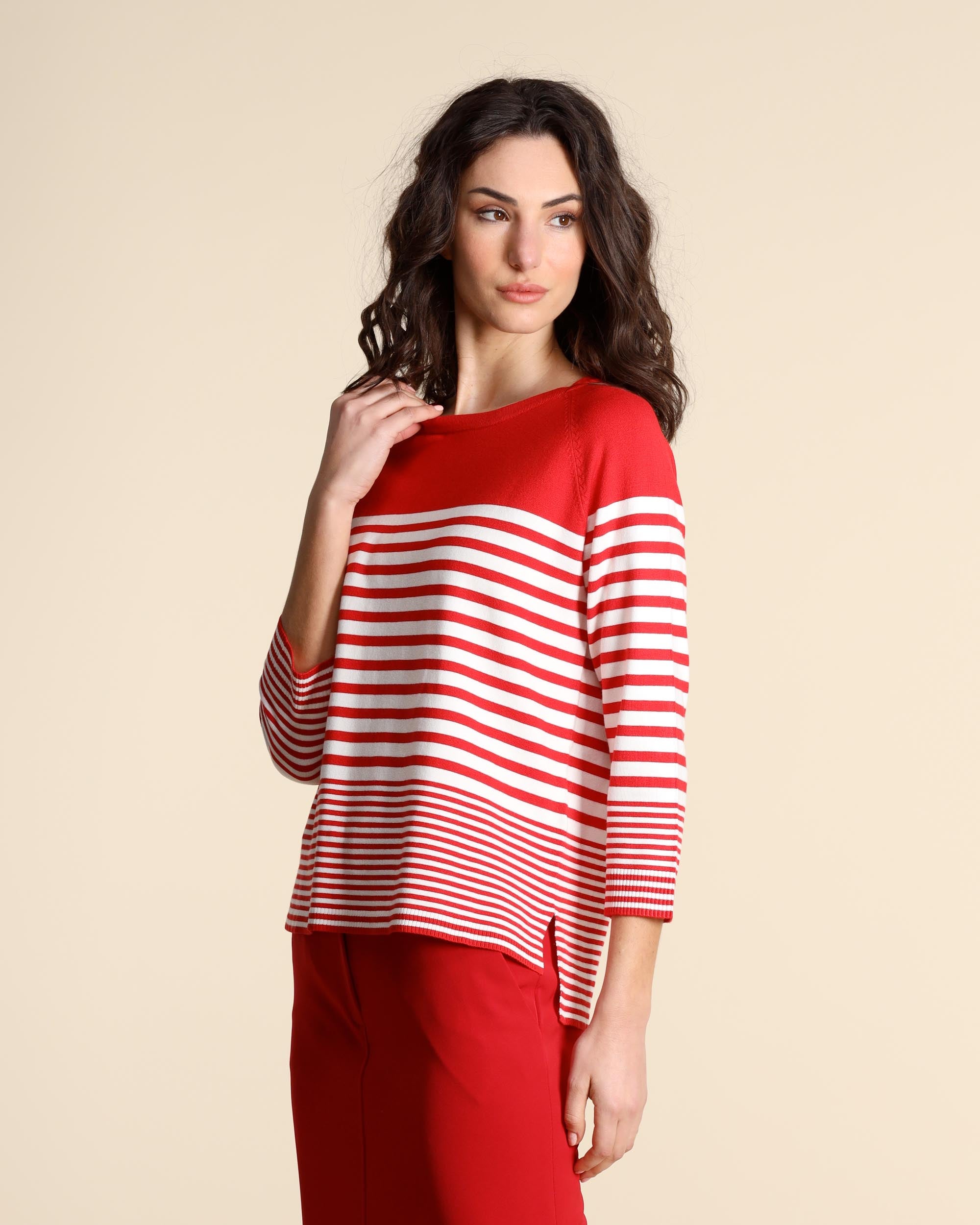 Red stretch viscose sweater with white stripes, rounded neck, straight fit, raglan elbow-length sleeves, side slits, longer hem at the back, the model is wearing a size S, the model has the following measurements: height 177, bust 86, waist 65, hips 93, Emme by Marella women's collection Spring Summer 2026