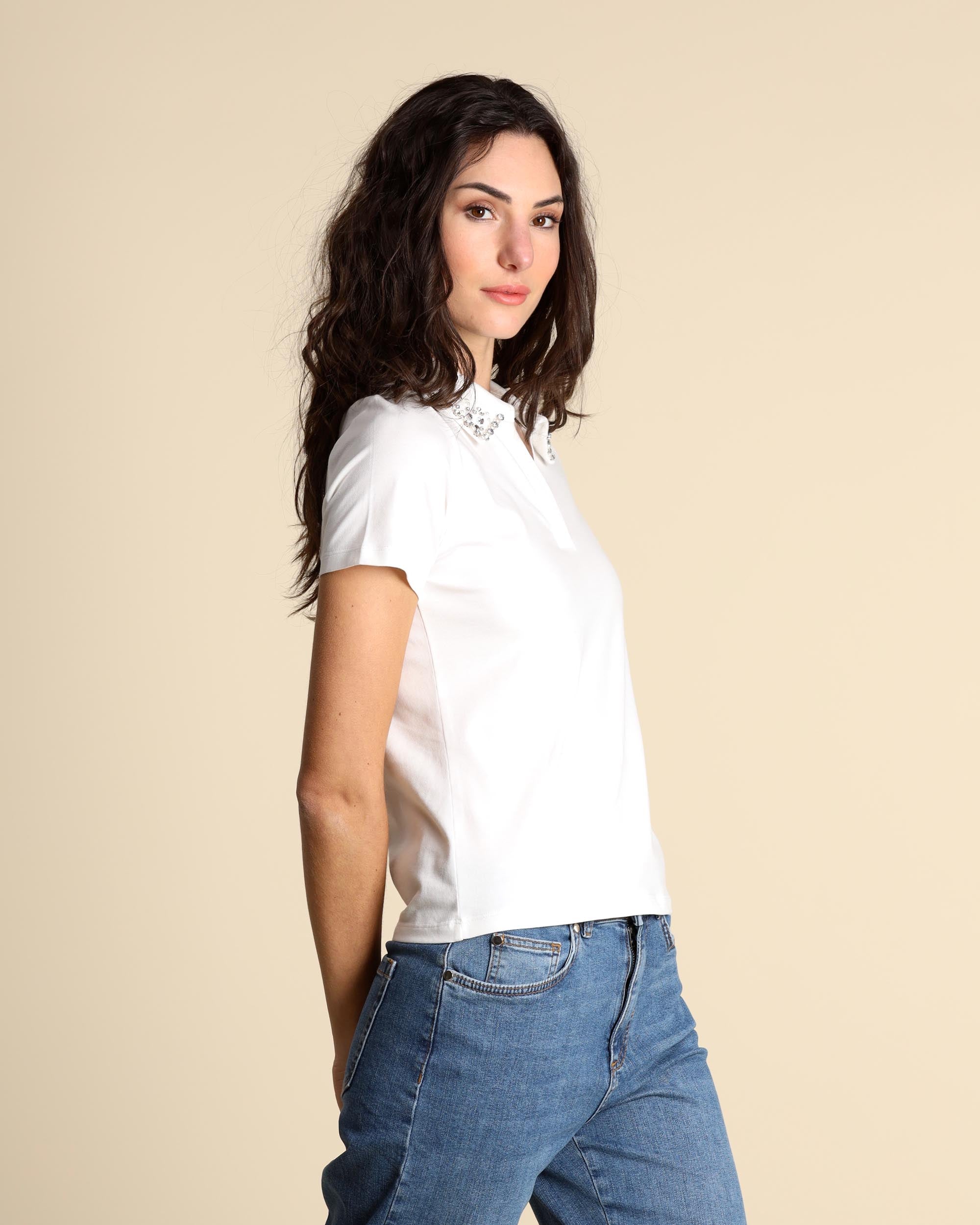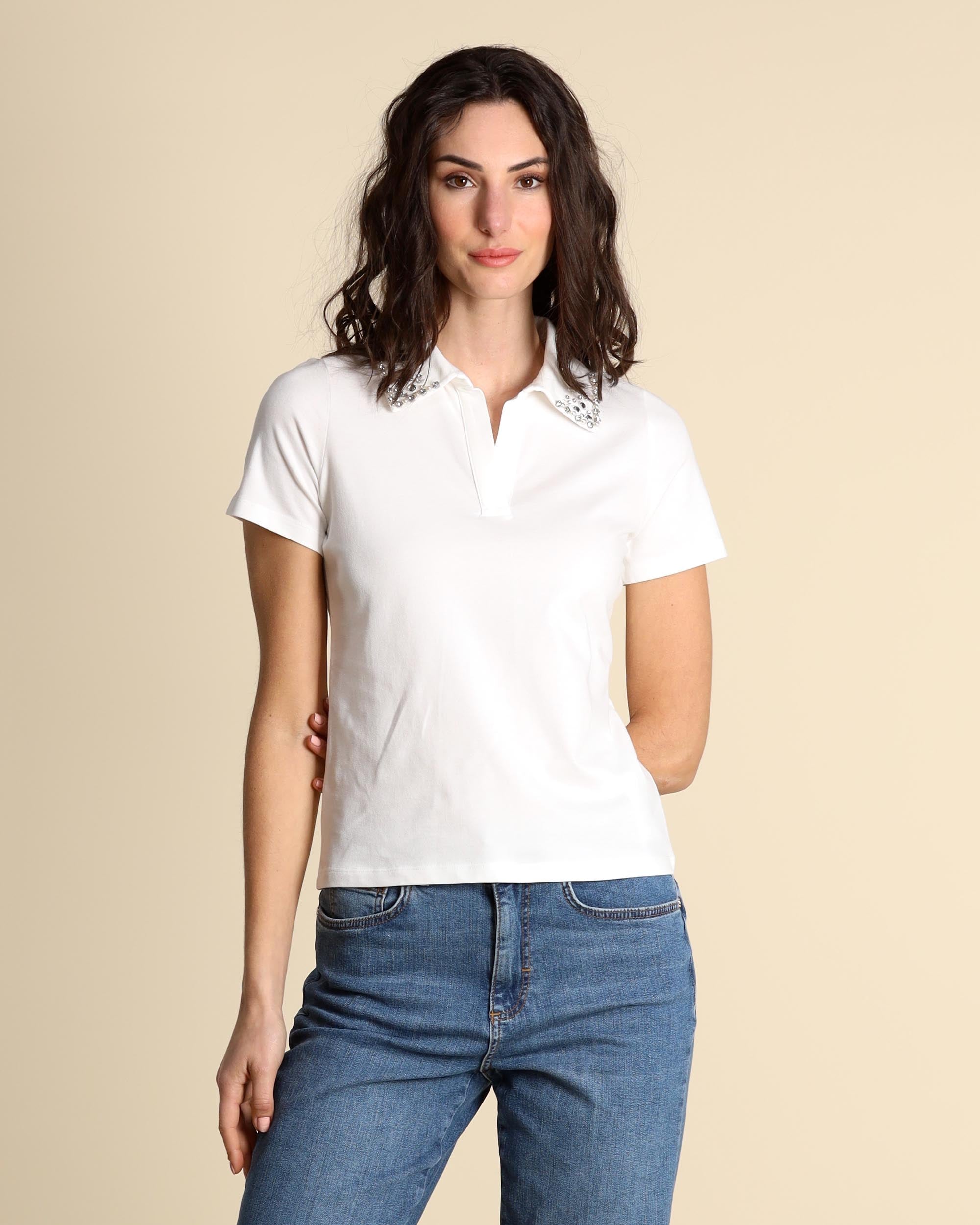 Milk-colored cotton pique polo shirt, polo collar with pearls and crystals, straight fit, short sleeves, the model is wearing a size S, the model has the following measurements: height 177, bust 86, waist 65, hips 93, Emme by Marella women's collection Spring Summer 2026