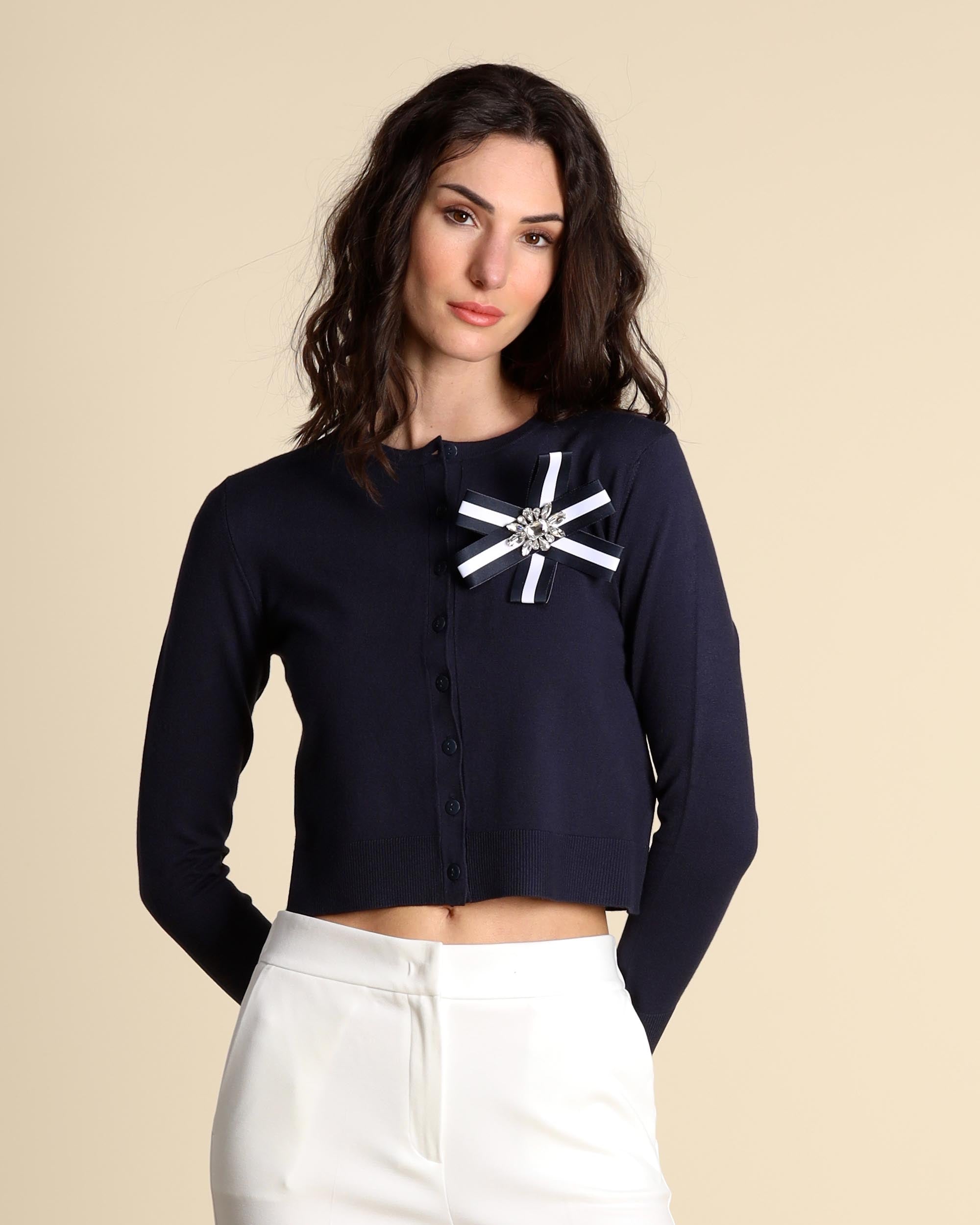 Blue cardigan in stretch viscose blend, round neckline, button closure, straight fit, long sleeves, removable cockade brooch with jewels, the model is wearing a size S, the model has the following measurements: height 177, bust 86, waist 65, hips 93, Emme by Marella women's collection Spring Summer 2026