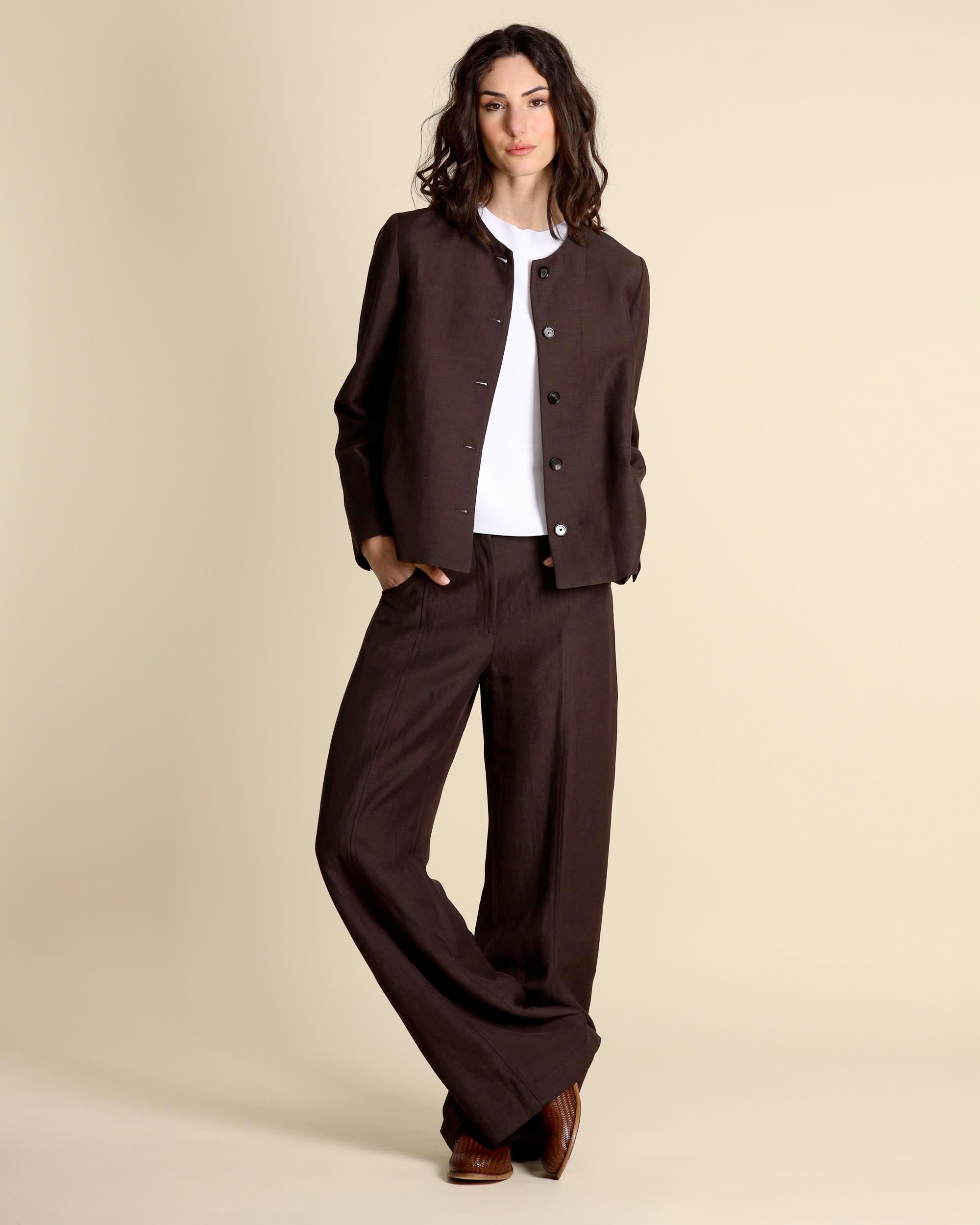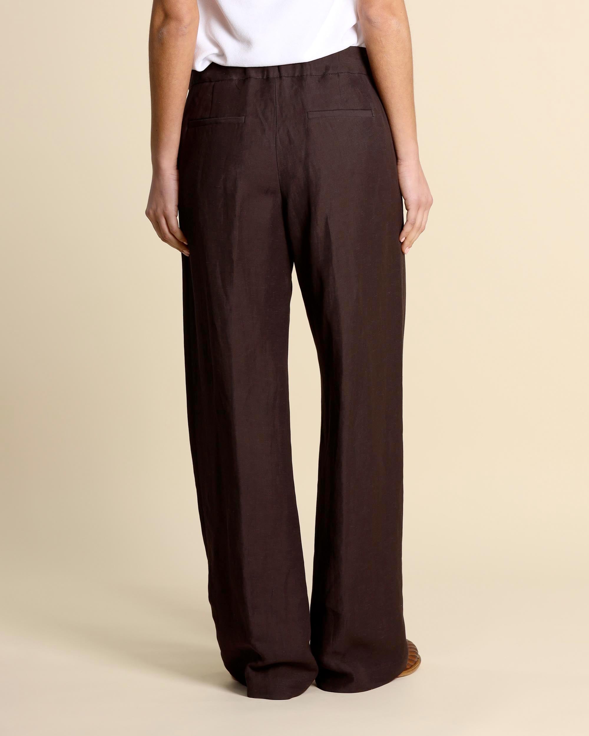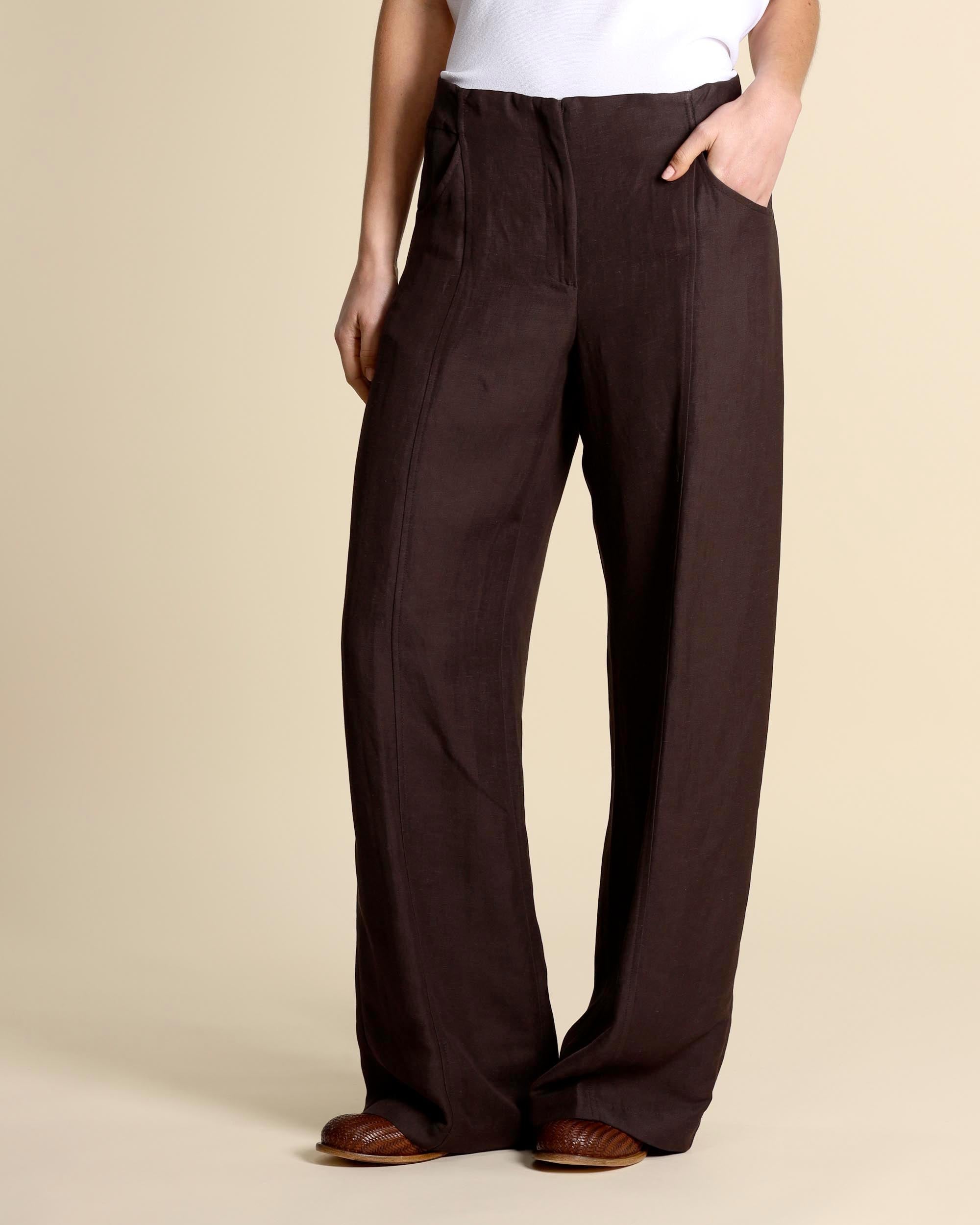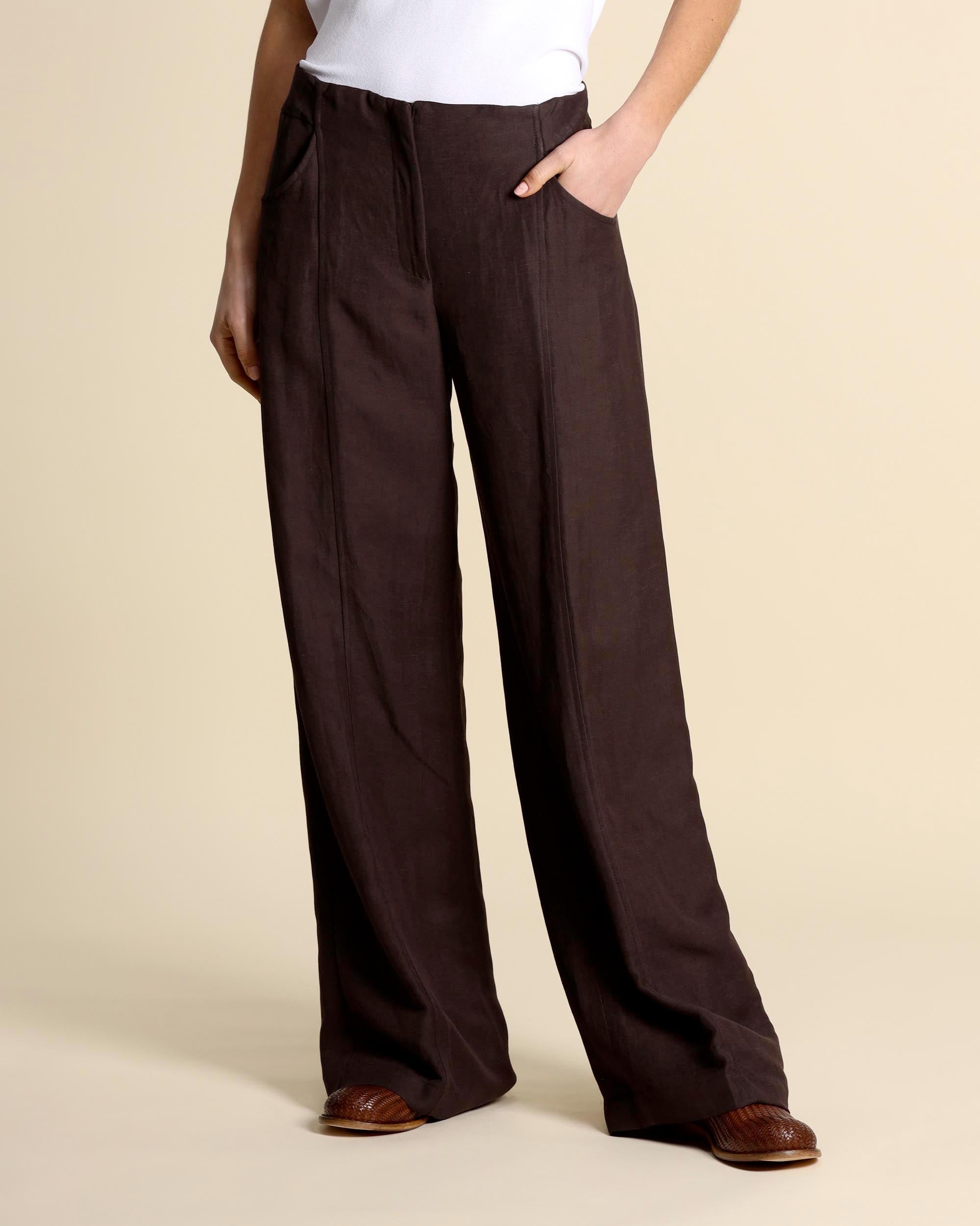 Brown viscose and linen trousers, elastic waist at the back, hidden zip fastening, palazzo fit, slash pockets on the front and welt pockets on the back, made in Italy, the model is wearing a size 42, the model has the following measurements: height 178, bust 86, waist 65, hips 93, Liviana Conti women's collection Spring Summer 2026