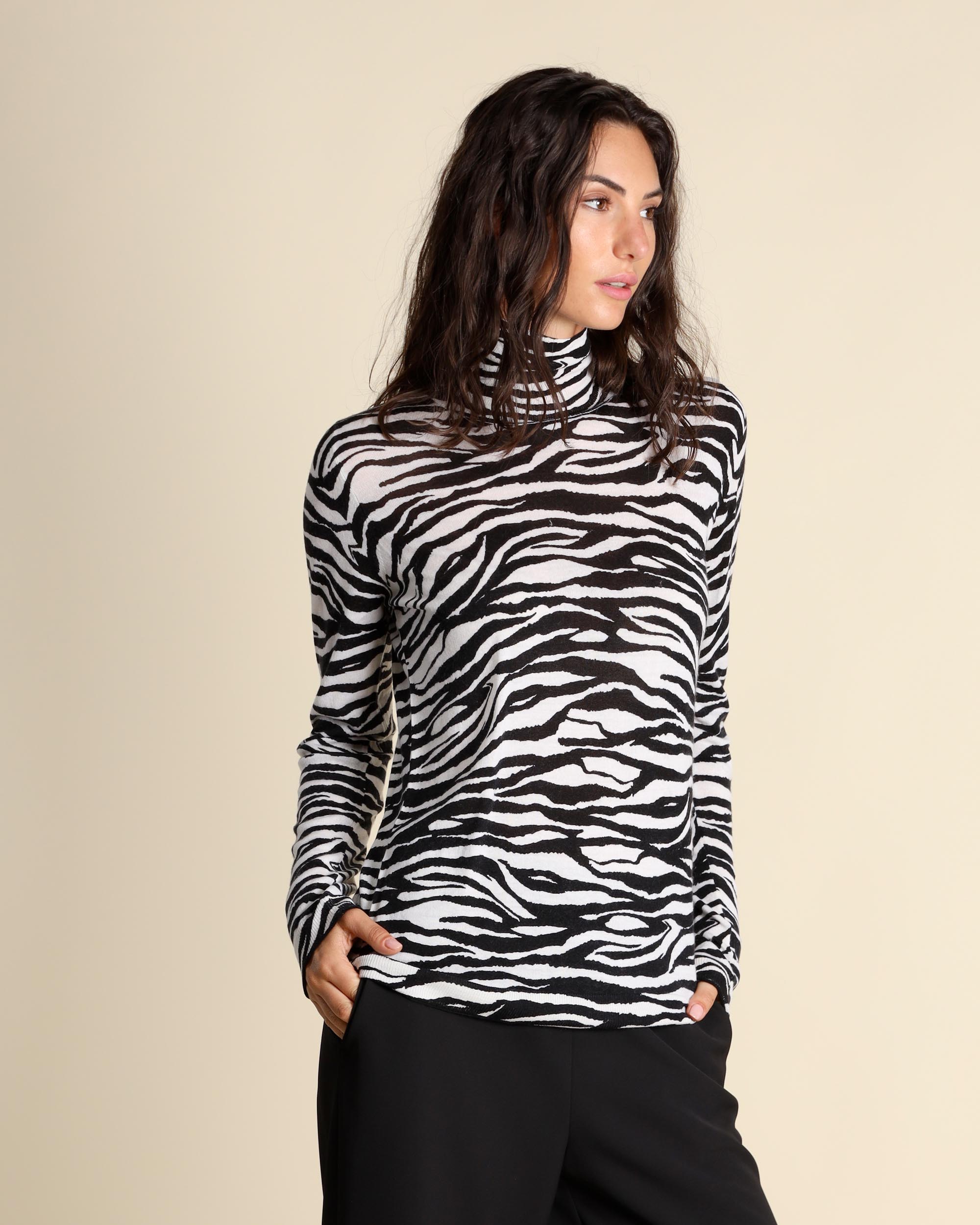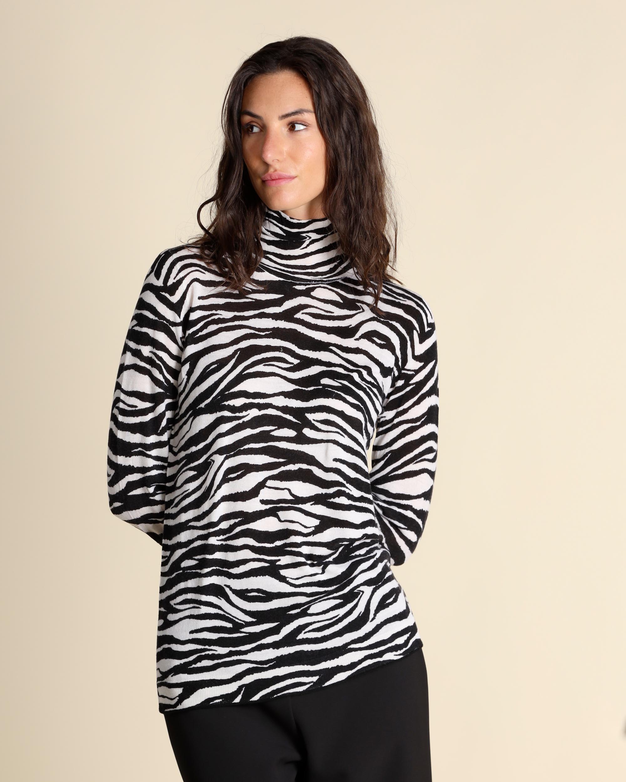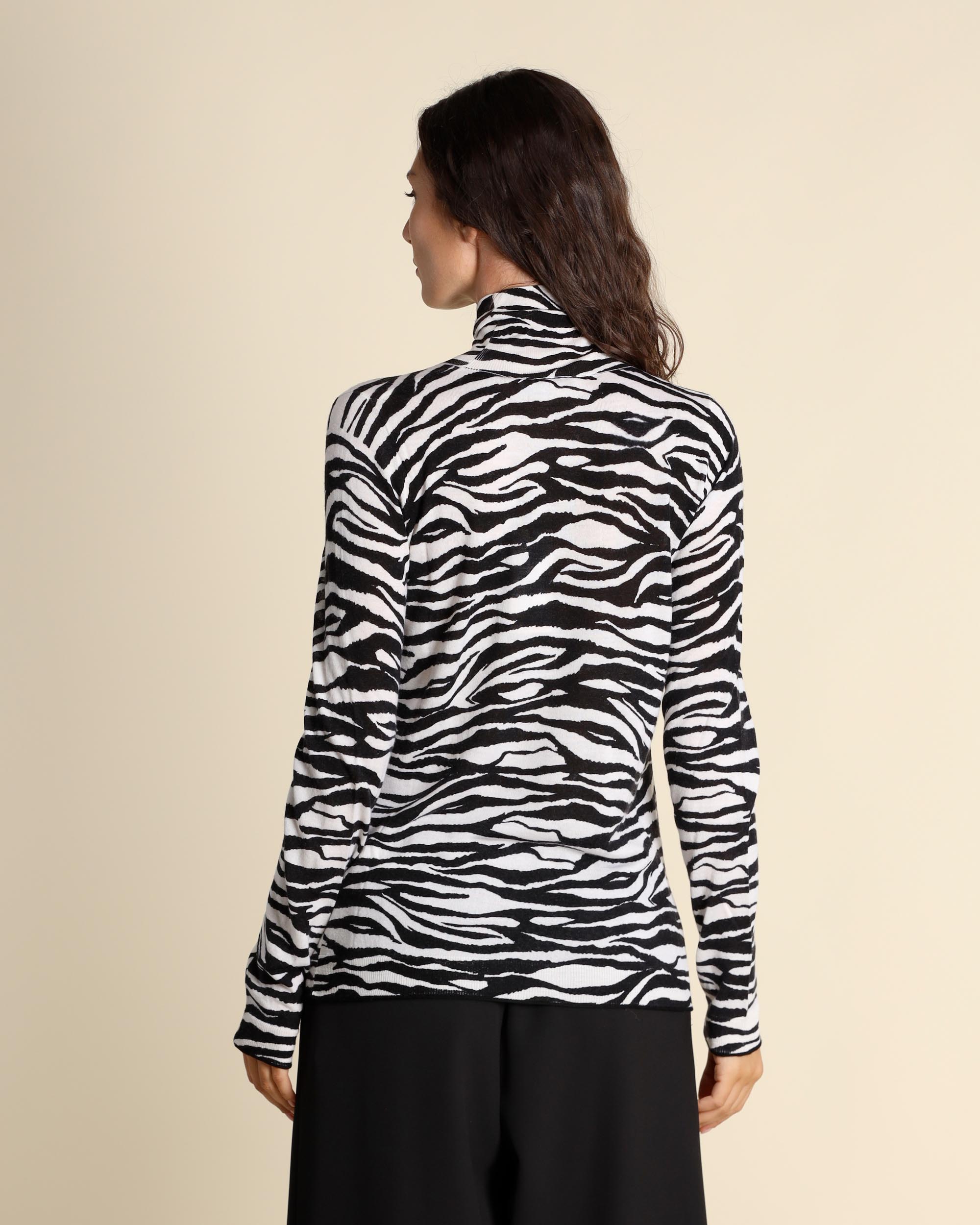 Black and white jacquard sweater in shaved wool, high neck, long sleeves, straight fit, the model wears a size S, the model has the following measurements: height 178, breast 86, waist 65, hips 93, Maliparmi women's collection Autumn Winter 2025/26