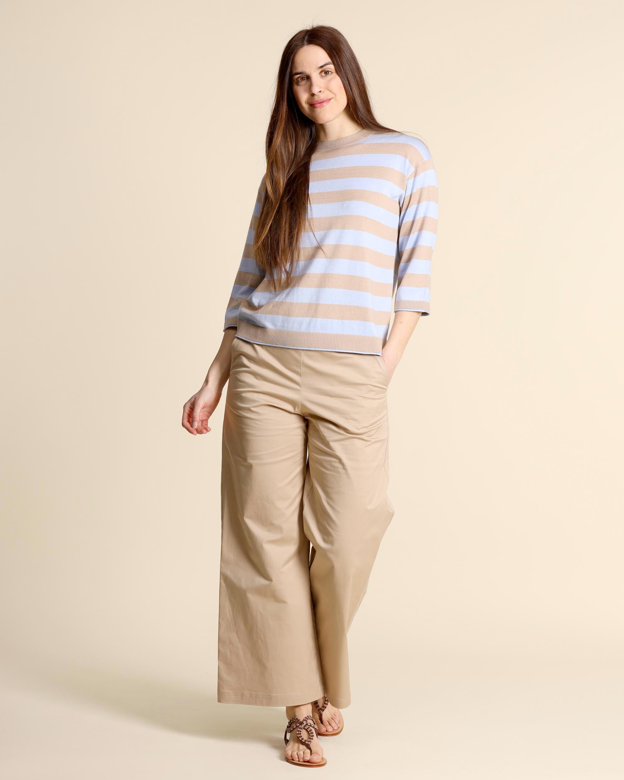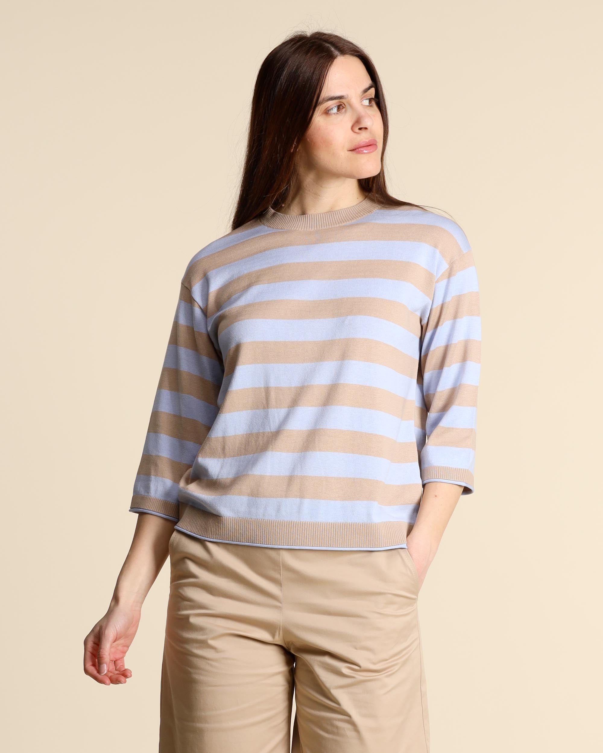 Maglia in seta e cotone a righe beige e azzurre, scollo tondo, maniche tre quarti, linea dritta, la modella indossa una tg.S, la modella ha le seguenti misure: altezza 177, seno 86,vita 65, fianchi 93, collezione donna Maliparmi Primavera Estate 2026