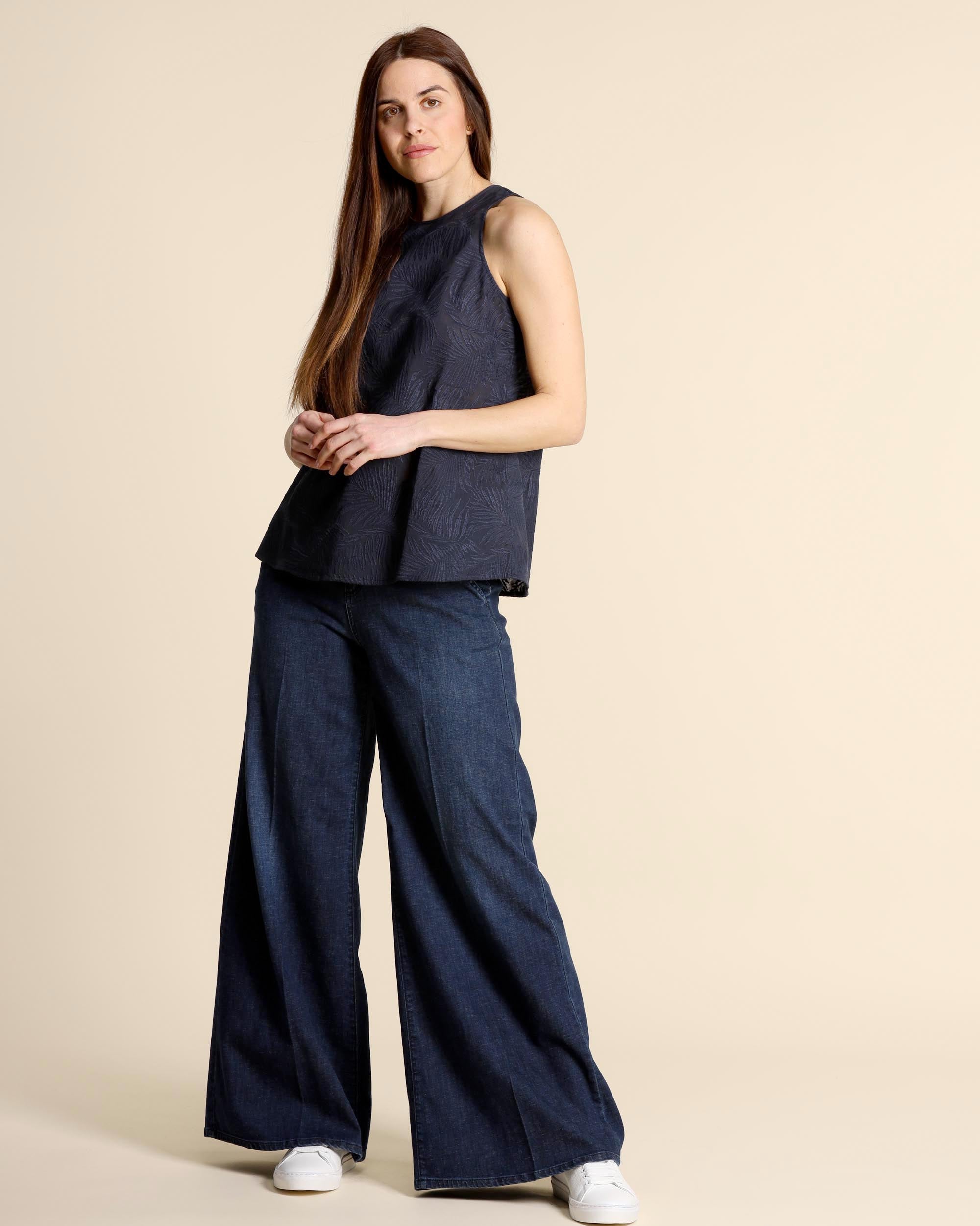 Top ricamato blu in mussola di cotone, scollo tondo con apertura a goccia sul dietro, senza maniche, linea morbida, la modella indossa una tg.42, la modella ha le seguenti misure: altezza 177, seno 86,vita 65, fianchi 93, collezione donna Pennyblack Primavera Estate 2026