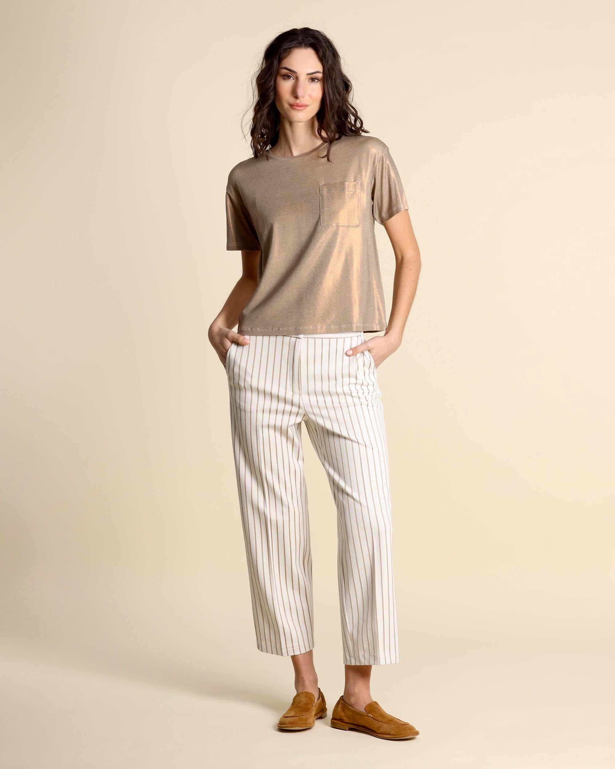Bronze laminated jersey T-shirt, round neck, short sleeves, soft fit, patch pocket, the model is wearing a size S, the model has the following measurements: height 177, bust 86, waist 65, hips 93, Pennyblack Spring Summer 2026 women's collection