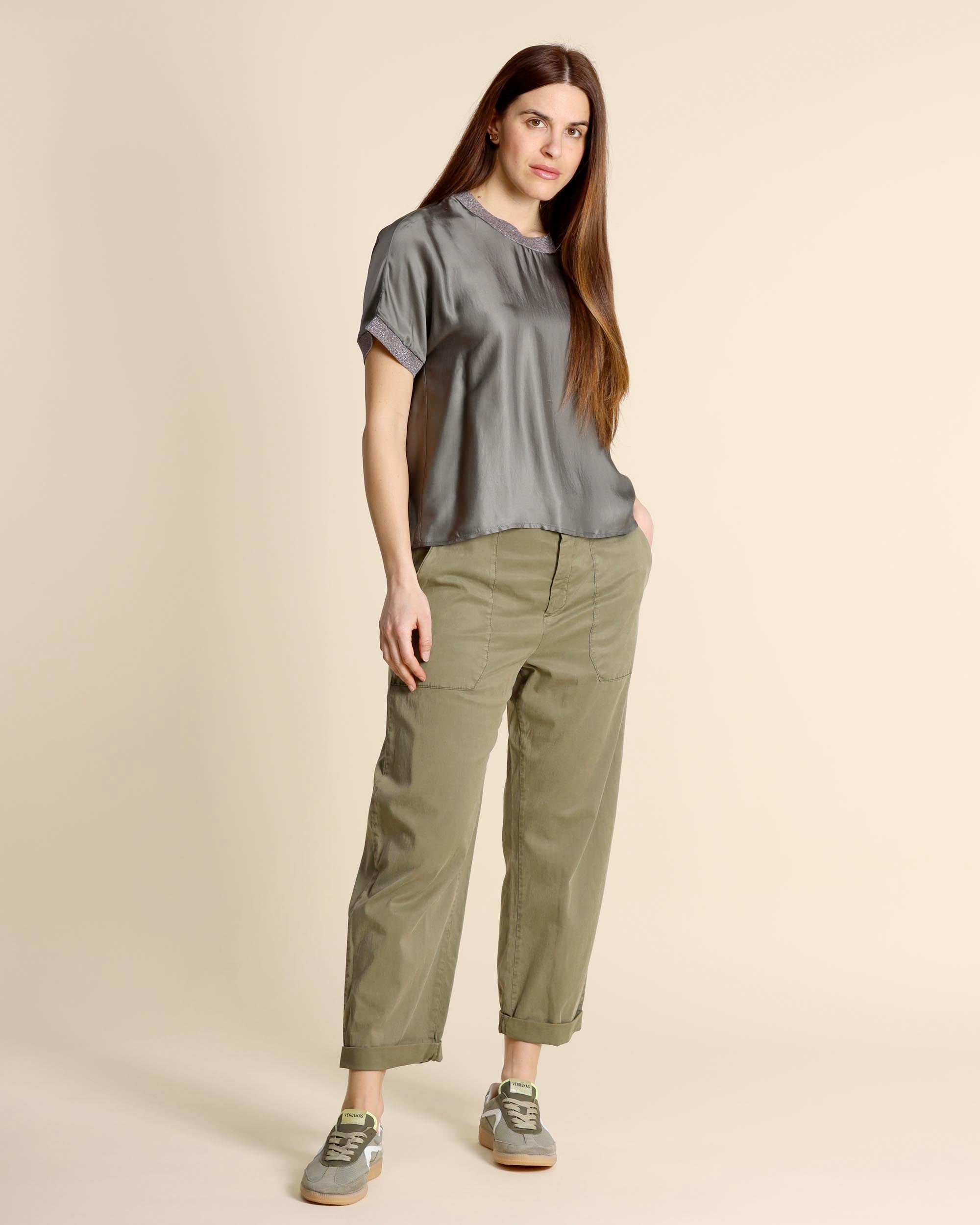 Blusa color grigio canna di fucile in raso di viscosa, scollo tondo, profili in maglia, maniche corte, linea morbida, made in Italy, la modella indossa una tg.42, la modella ha le seguenti misure: altezza 177, seno 86,vita 65, fianchi 93, collezione donna Collection Privee Primavera Estate 2026