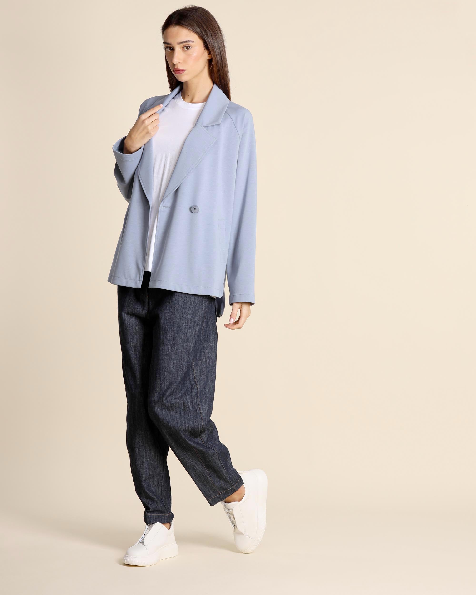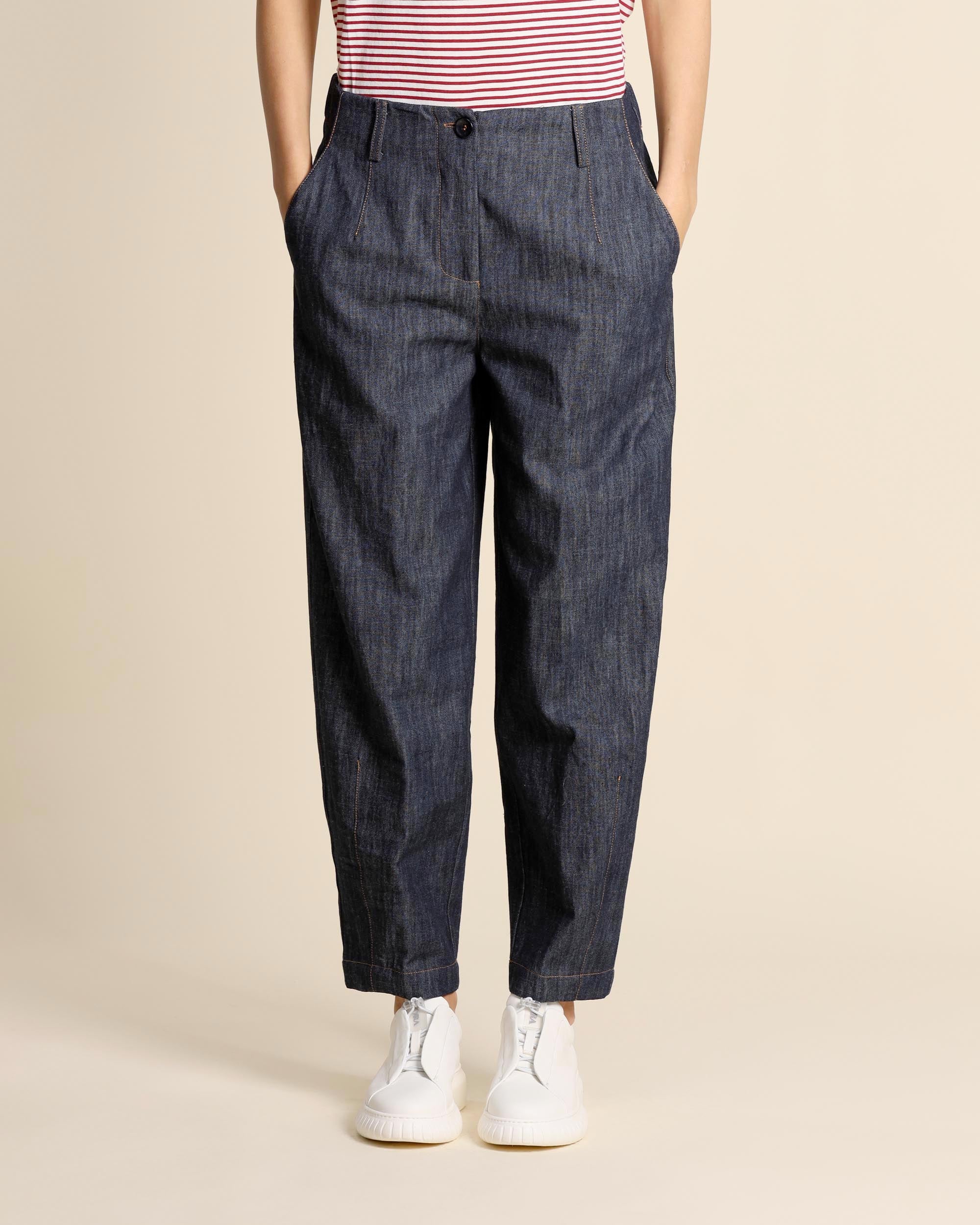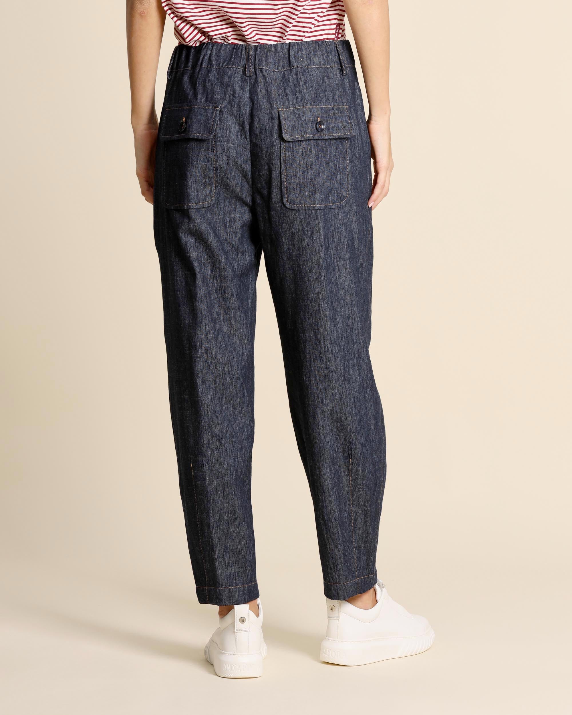 Pantalon bleu en denim de coton léger, fermeture par bouton et zip caché, taille élastique à l’arrière, poches italiennes à l’avant et poches à rabat avec bouton à l’arrière, coupe droite légèrement plus étroite en bas, coutures contrastées, fabriqué en Italie, le mannequin porte une taille 42, le mannequin a les mensurations suivantes : hauteur 177, poitrine 86, taille 65, hanches 93, collection femme Alessia Santi Printemps Été 2026