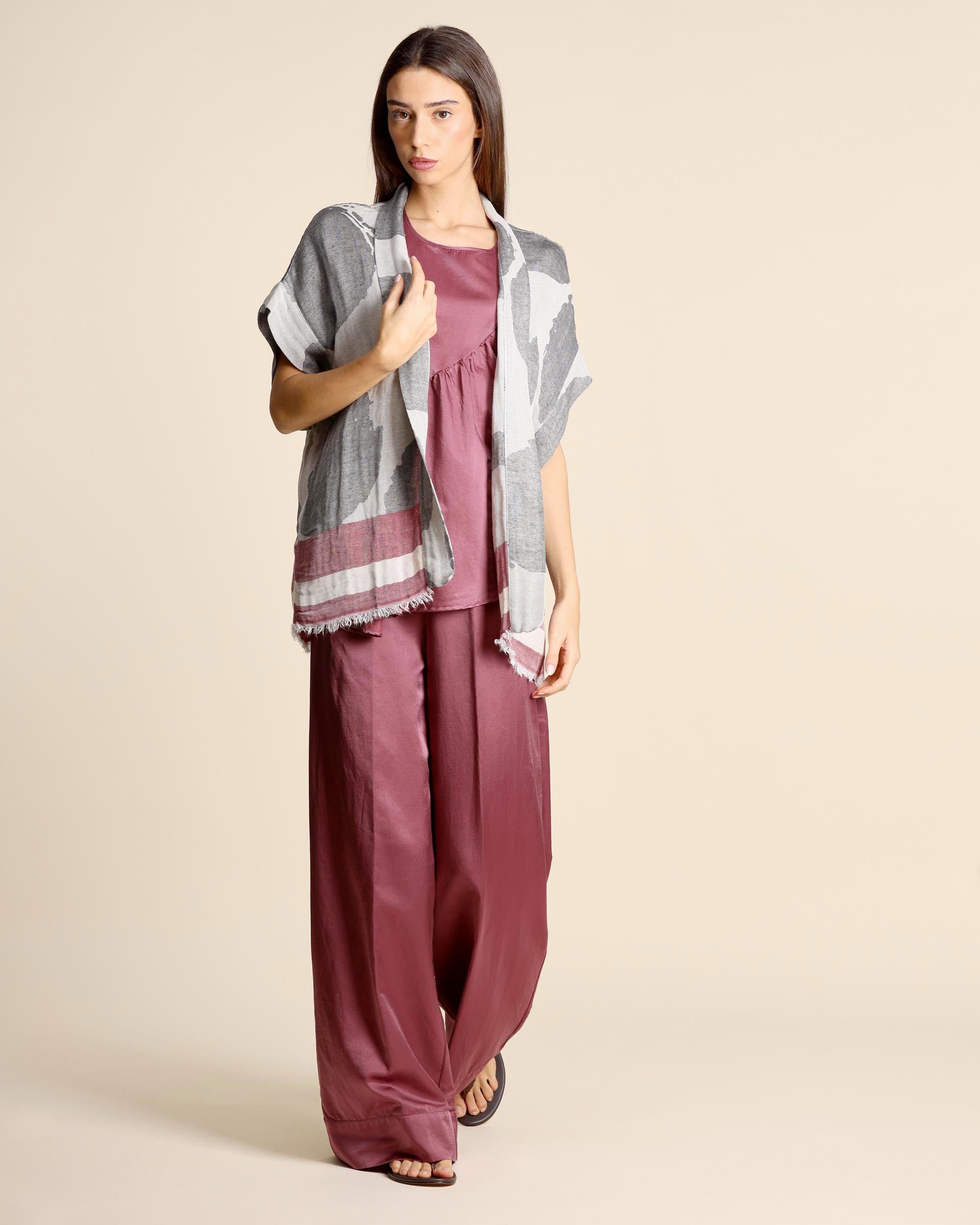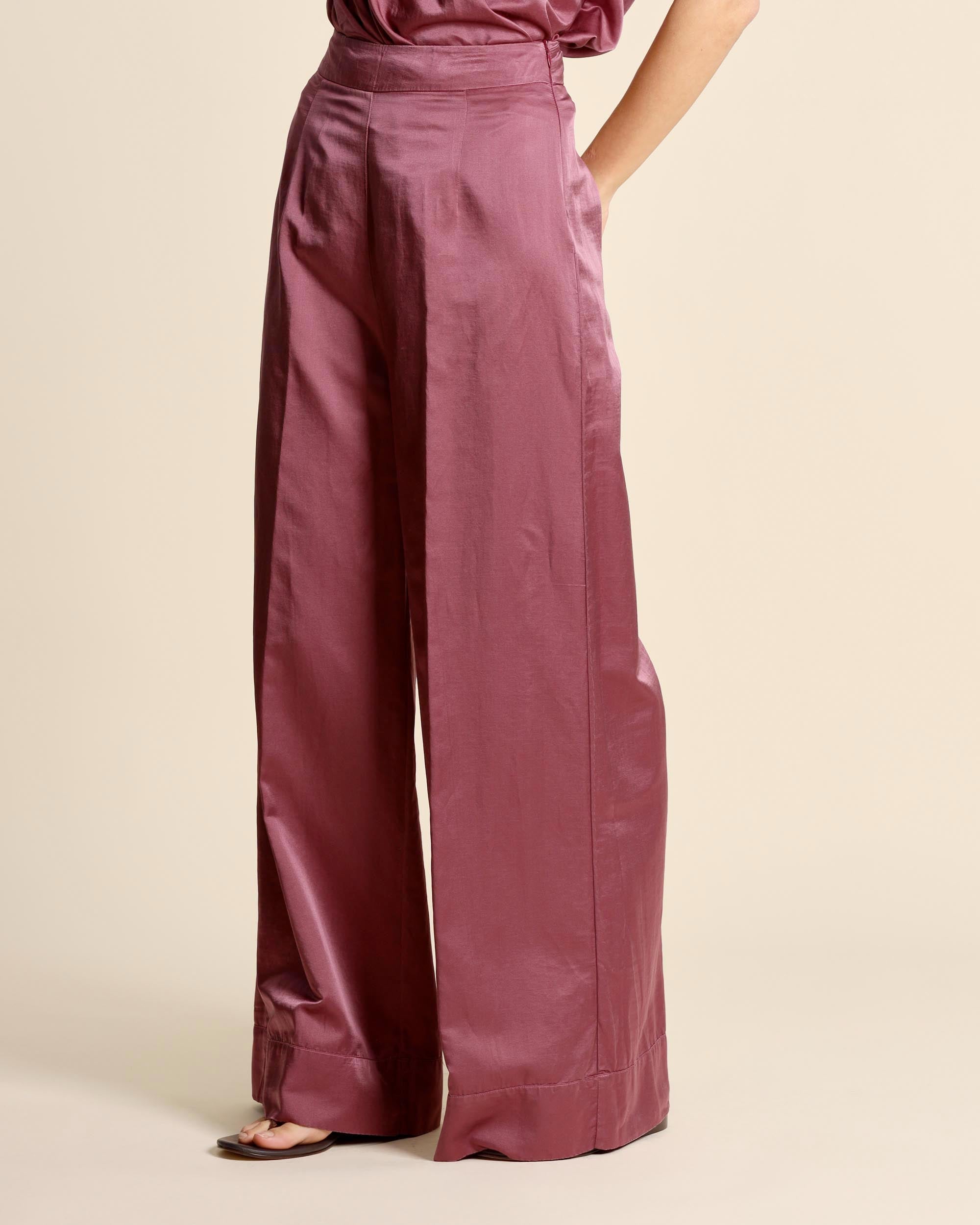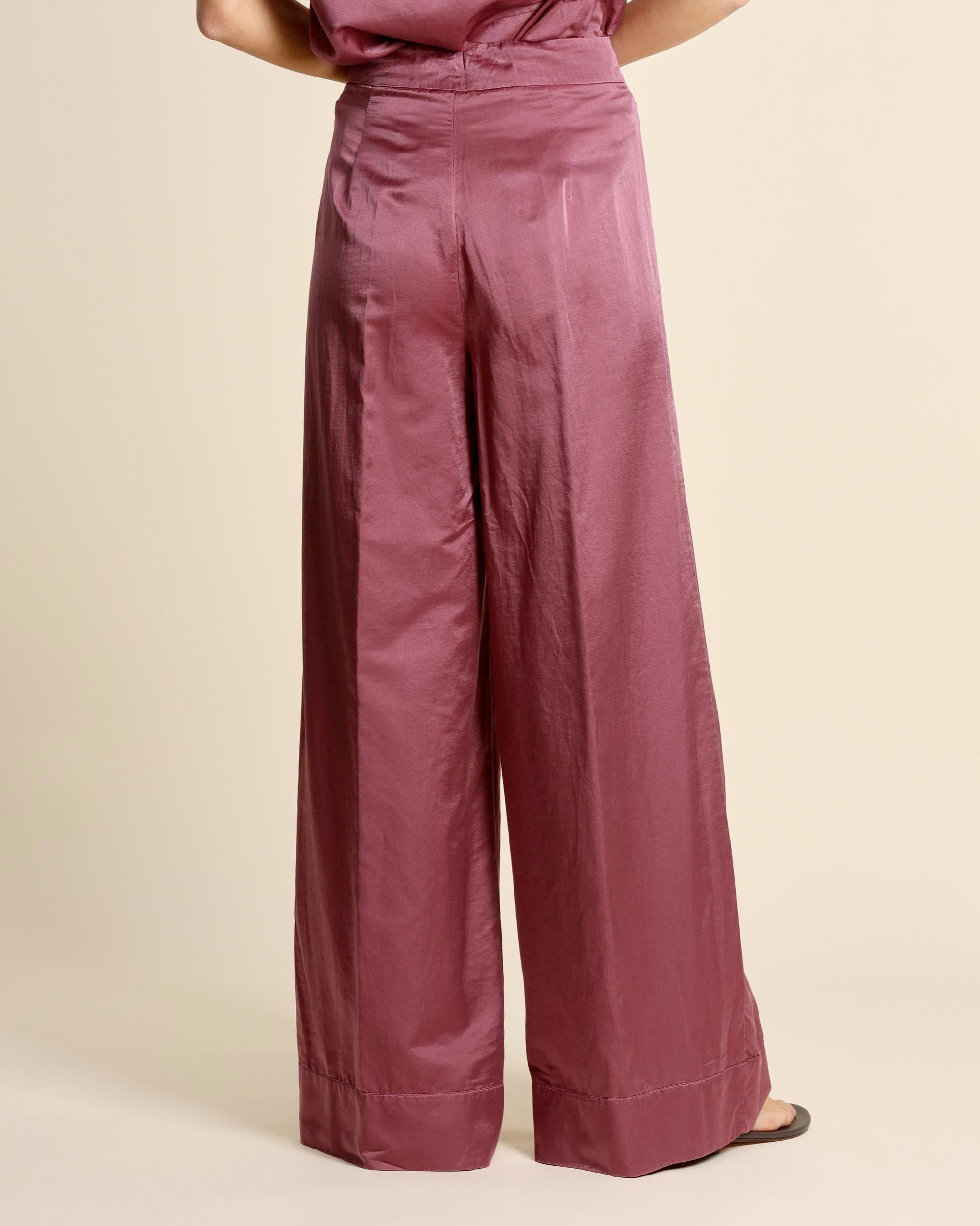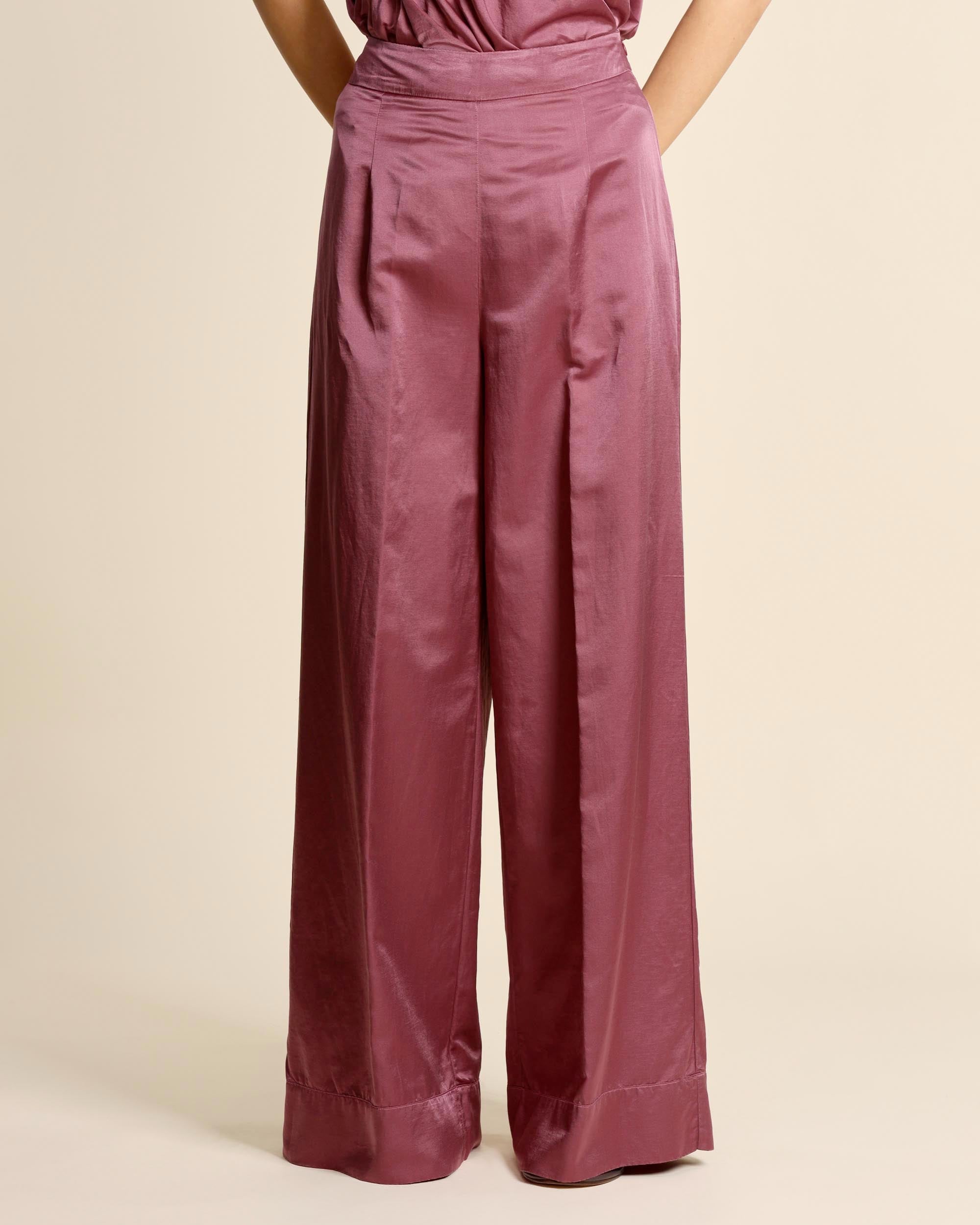 Pantalon en satin de coton et soie couleur oignon, fermeture latérale avec zip invisible sur le côté, coupe ample, made in Italy, le mannequin porte une taille 42, le mannequin a les mensurations suivantes : hauteur 177, poitrine 86, taille 65, hanches 93, collection femme Alessia Santi Printemps Été 2026