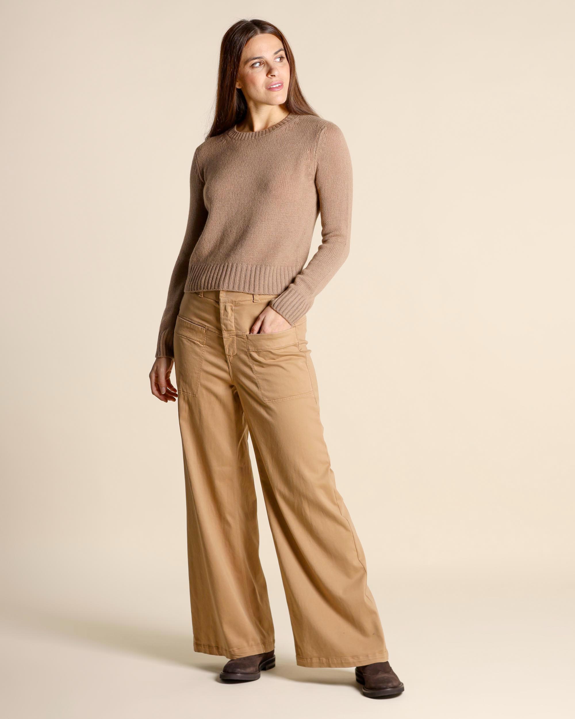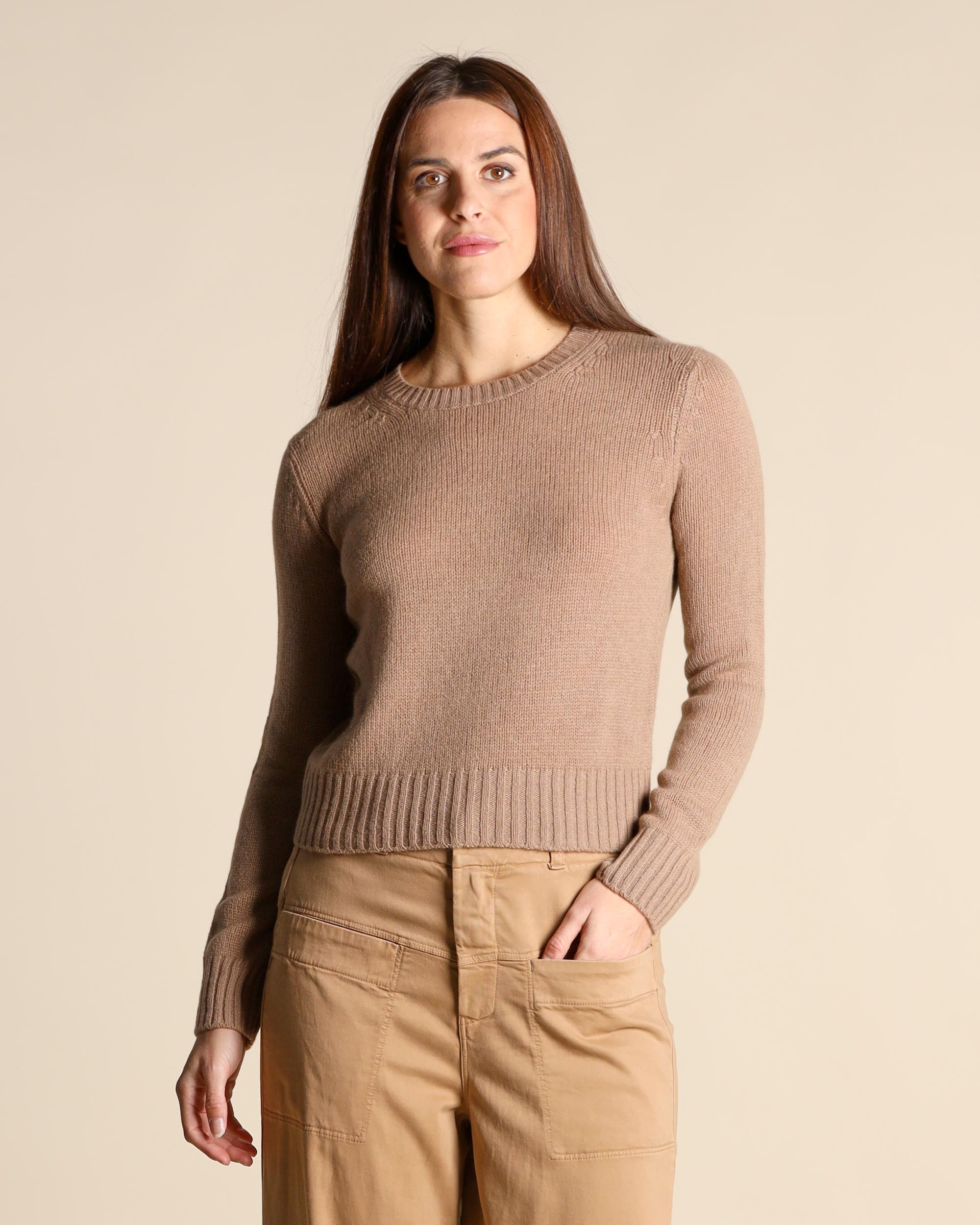 Maglia color biscotto in cashmere con lavorazione a due fili, gr.194, maniche lunghe, scollo tondo, linea dritta, la modella indossa una tg.S, la modella ha le seguenti misure: altezza 179, seno 84, vita 63, fianchi 94, collezione donna Be You Autunno Inverno 2025/26