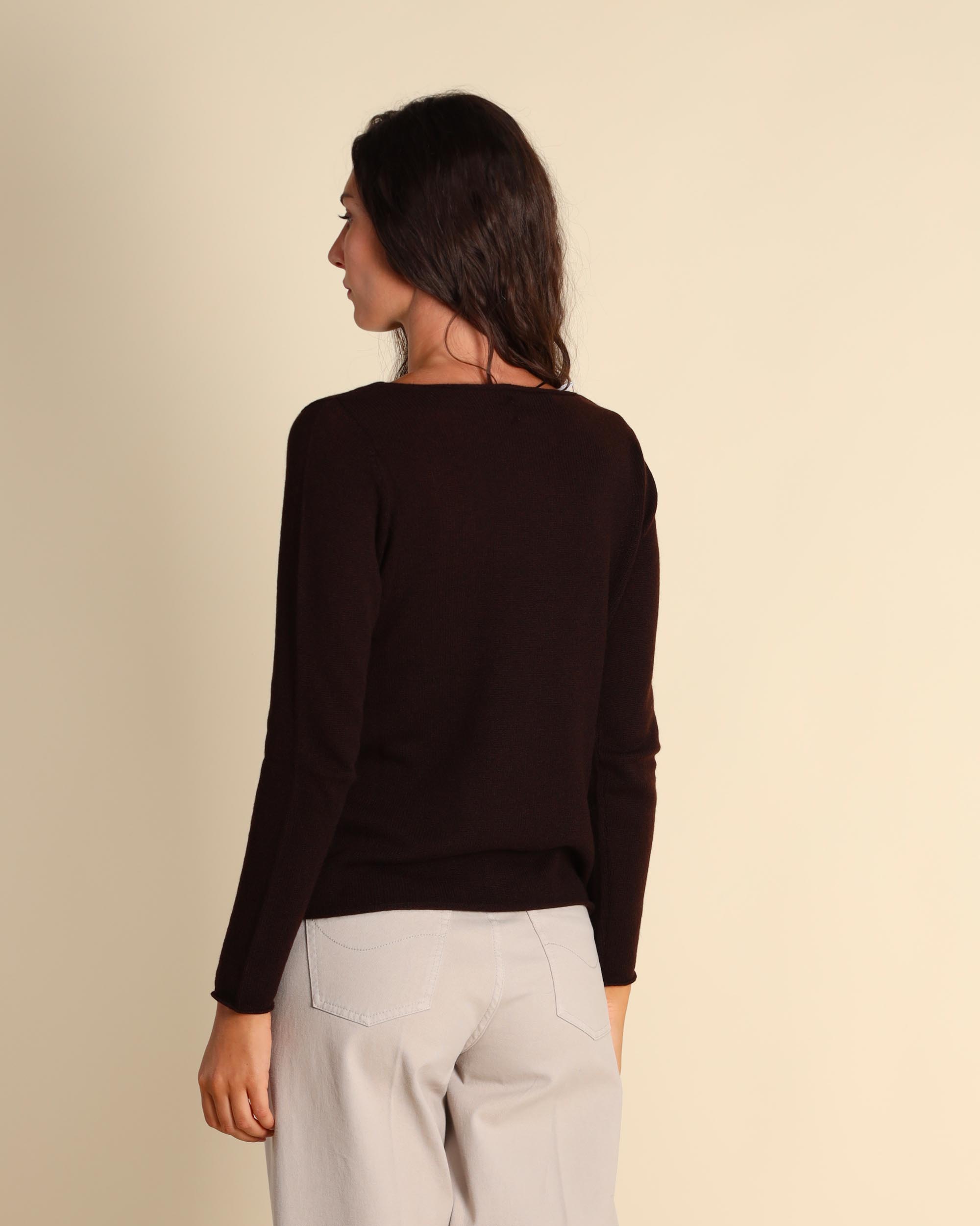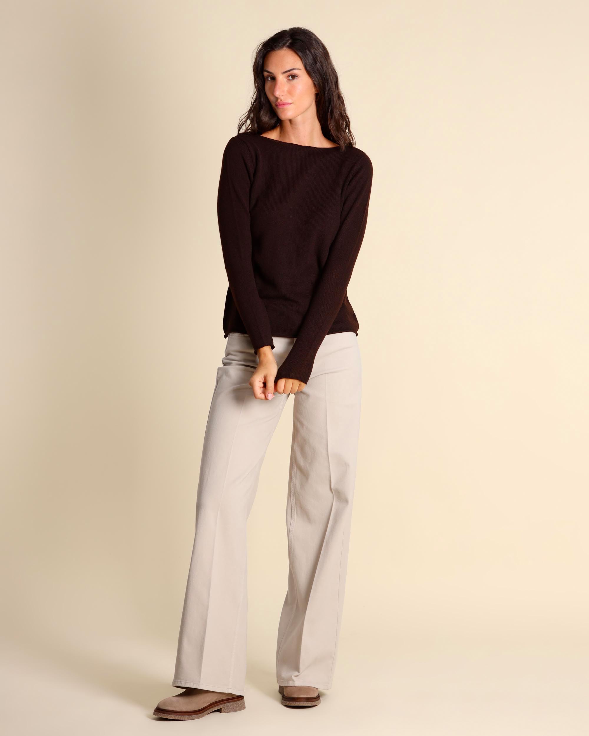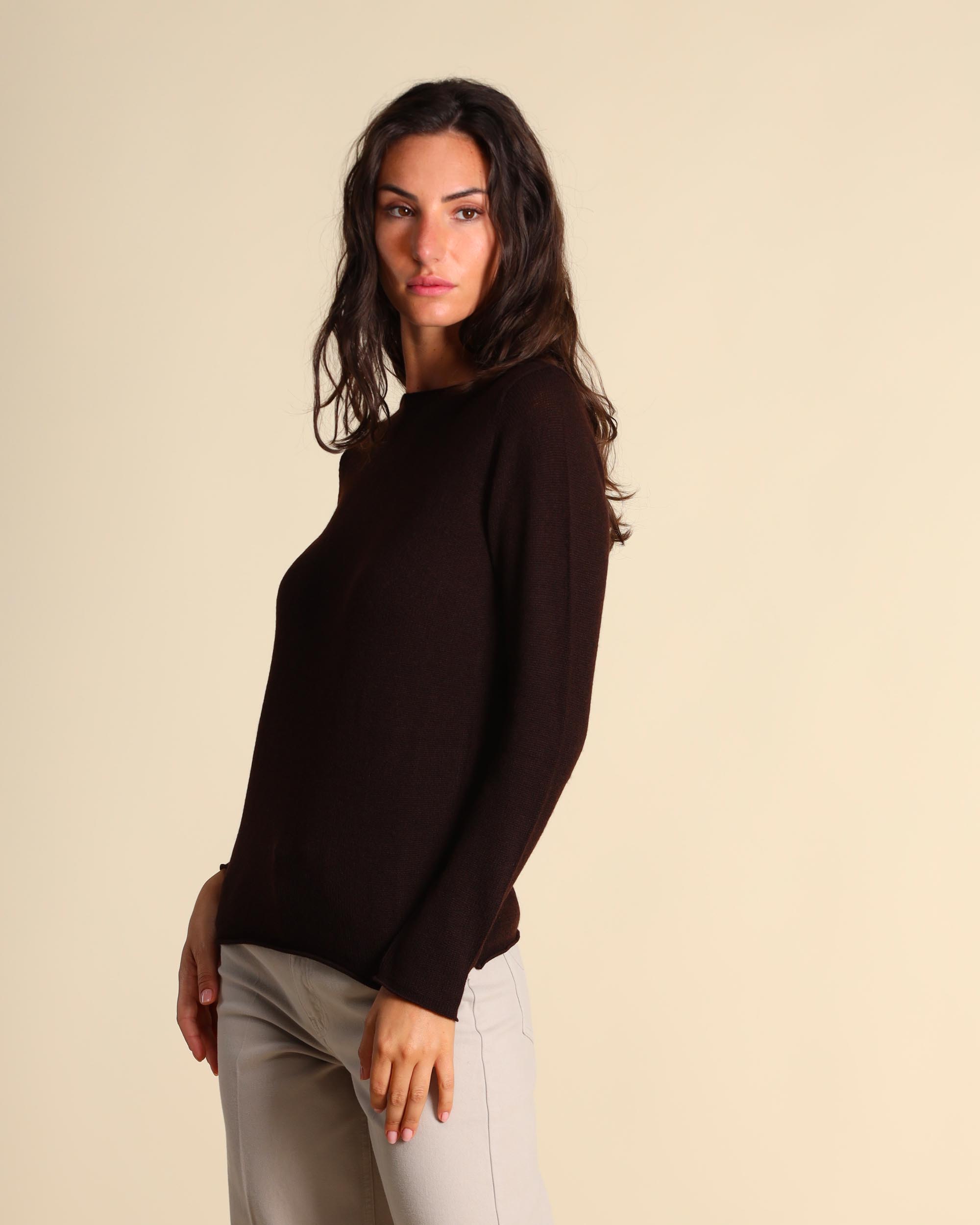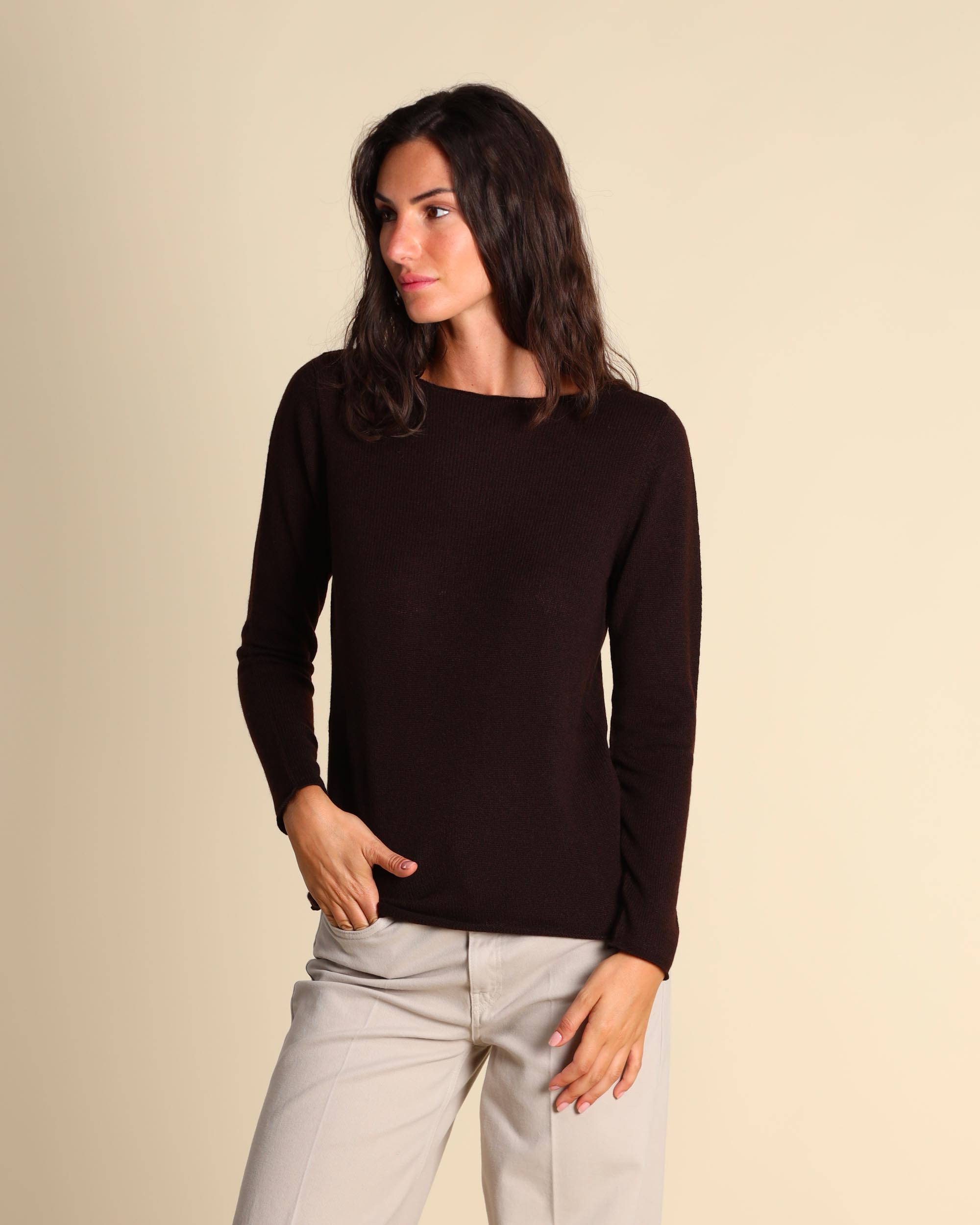 Maglia marrone in cashmere con lavorazione a nuvola, gr.141, maniche lunghe, scollo a barchetta, linea semiaderente, la modella indossa una tg.S, la modella ha le seguenti misure: altezza 179, seno 84, vita 63, fianchi 94, collezione donna Be You Autunno Inverno 2025/26