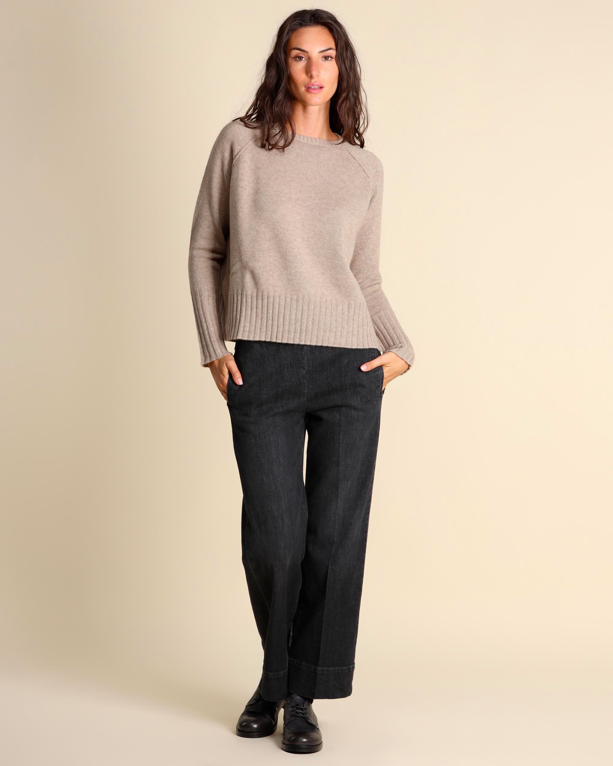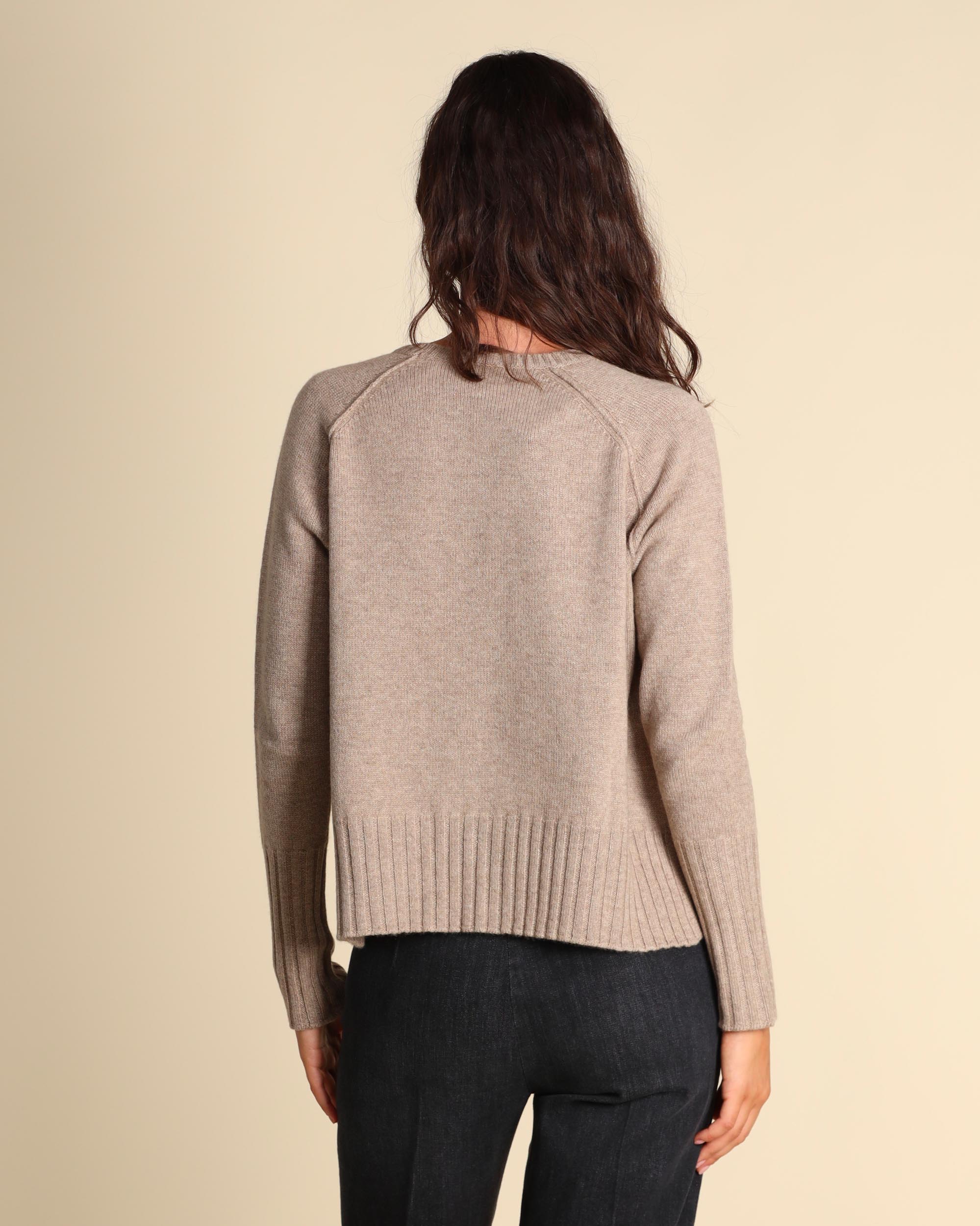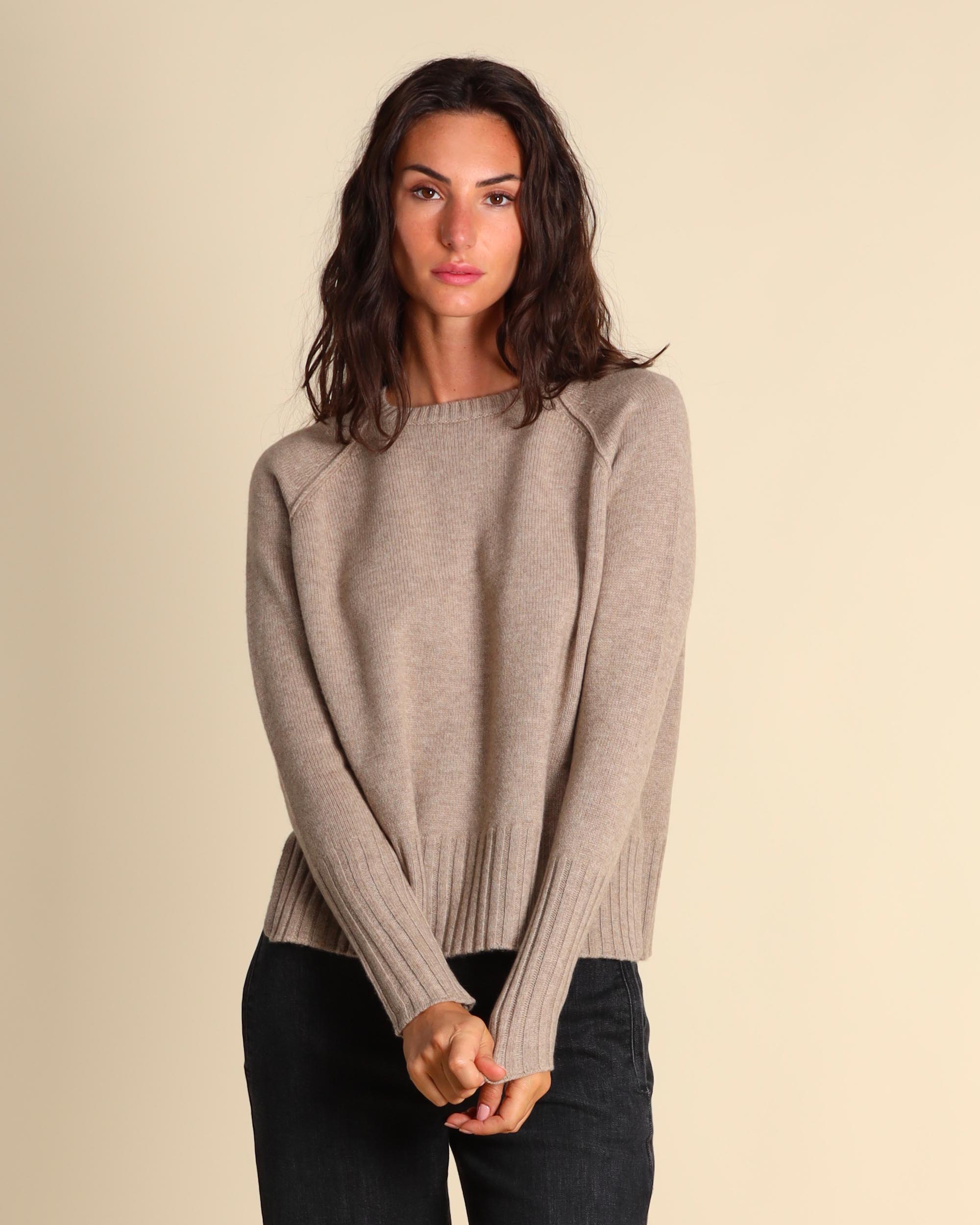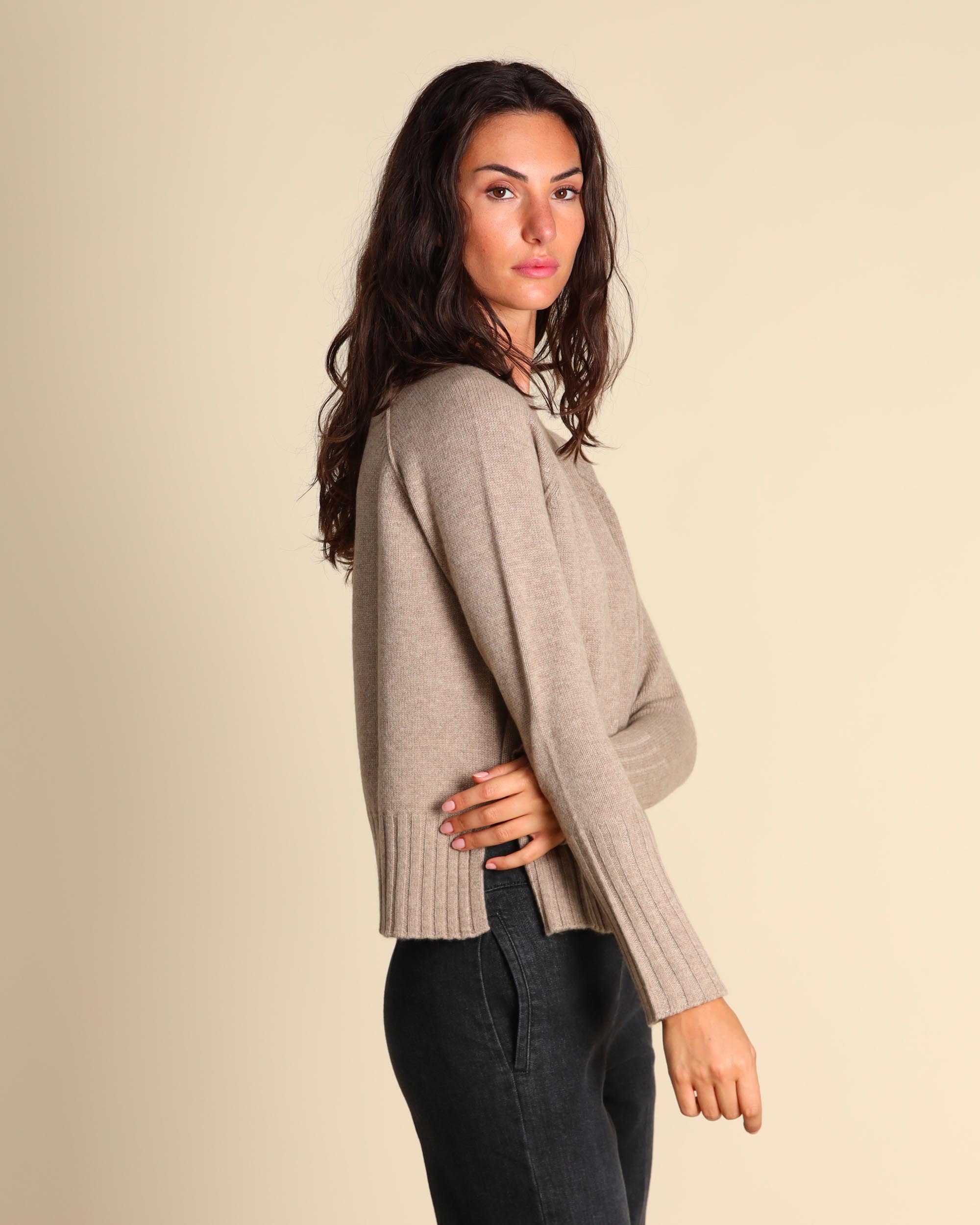 Maglia tortora in cashmere con lavorazione a due fili, gr.265, maniche lunghe raglan con risvolto, scollo tondo, linea ampia, spacchi laterali, la modella indossa una tg.S, la modella ha le seguenti misure: altezza 179, seno 84, vita 63, fianchi 94, collezione donna Be You Autunno Inverno 2025/26
