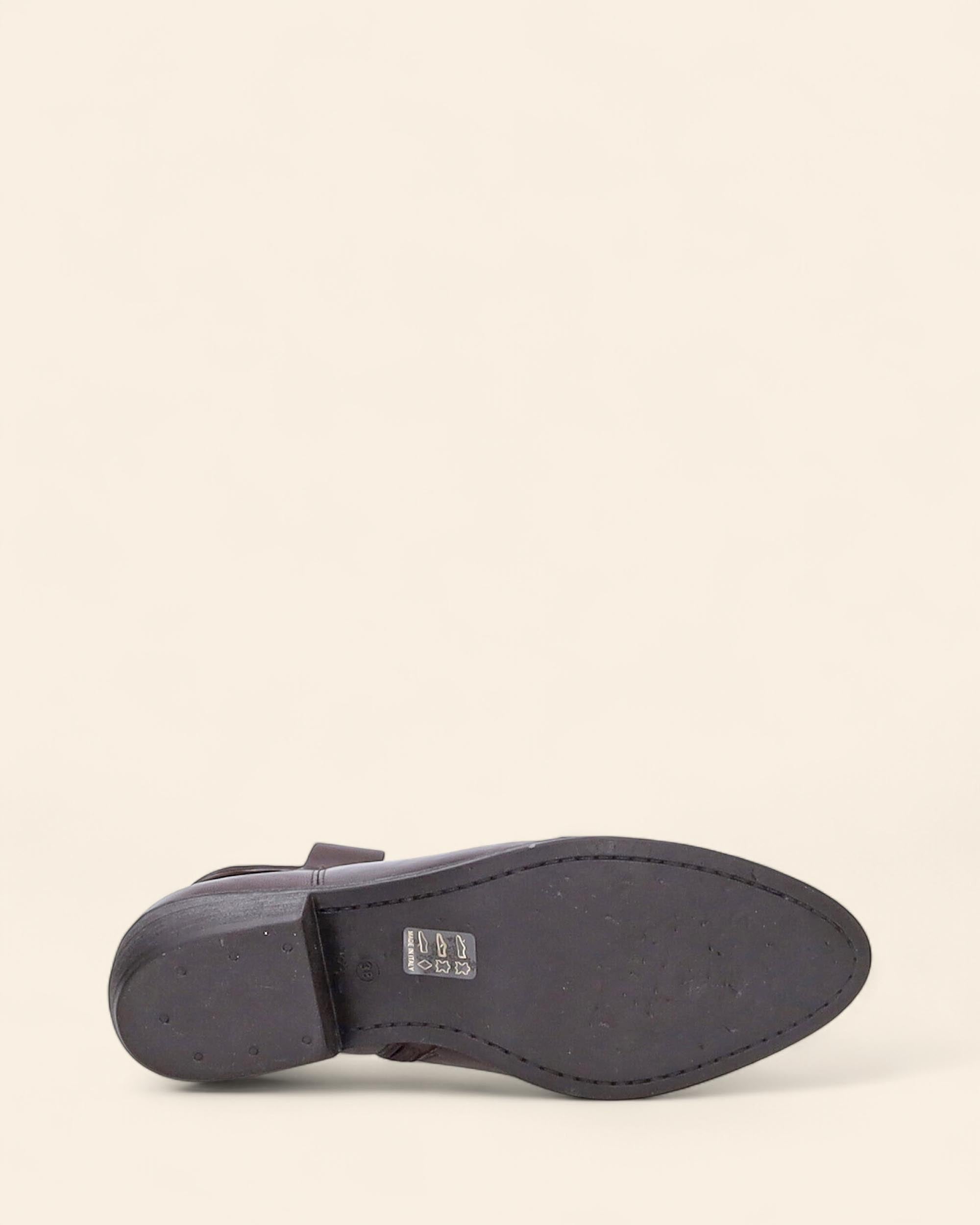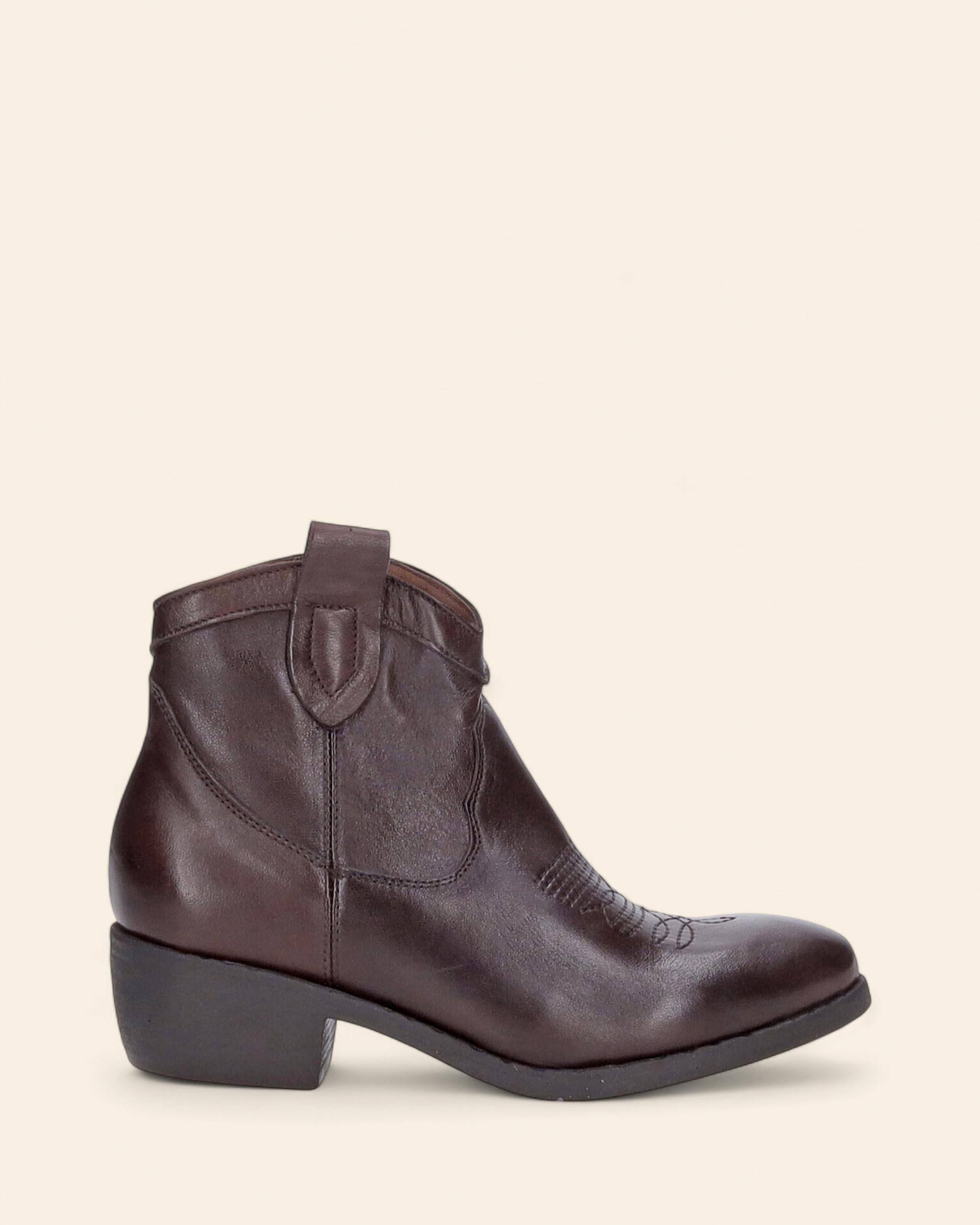 Sivaletti texani in pelle marrone, conciata esclusivamente al vegetale, suola in gomma, tacco 45mm, chiusura laterale con zip, dettaglio di impunture sulla tomaia, sottopiede in pelle, tirante laterale in pelle, made in Italy, collezione donna Creative Autunno Inverno 2025/2026