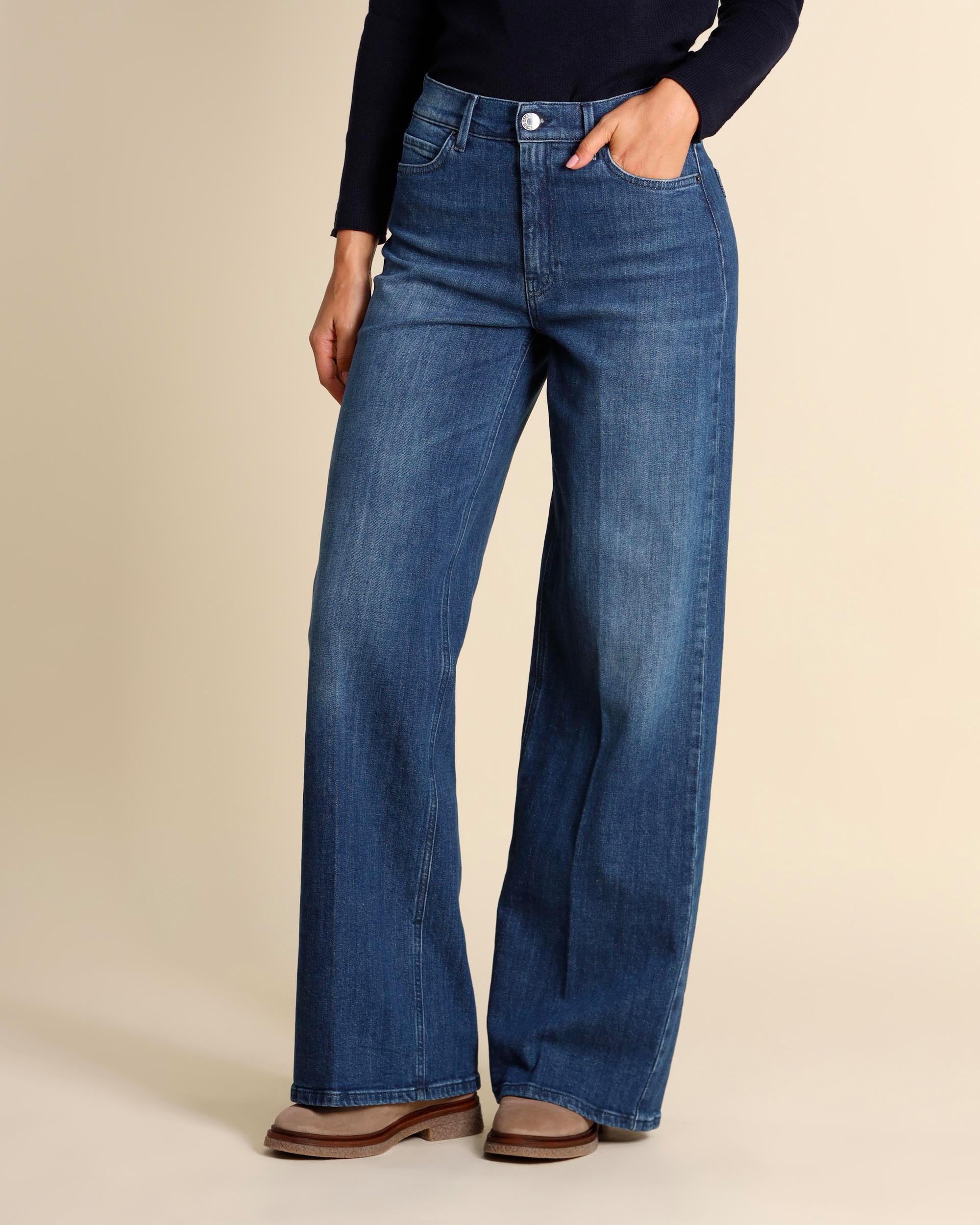 Jeans palazzo in denim di cotone stretch blu, chiusura con bottone a chiodo e zip nascosta, cinque tasche, linea ampia, made in Italy, la modella indossa una tg.28, la modella ha le seguenti misure: altezza 177, seno 87,vita 65, fianchi 93, collezione donna Cigala's Autunno Inverno 2025/26