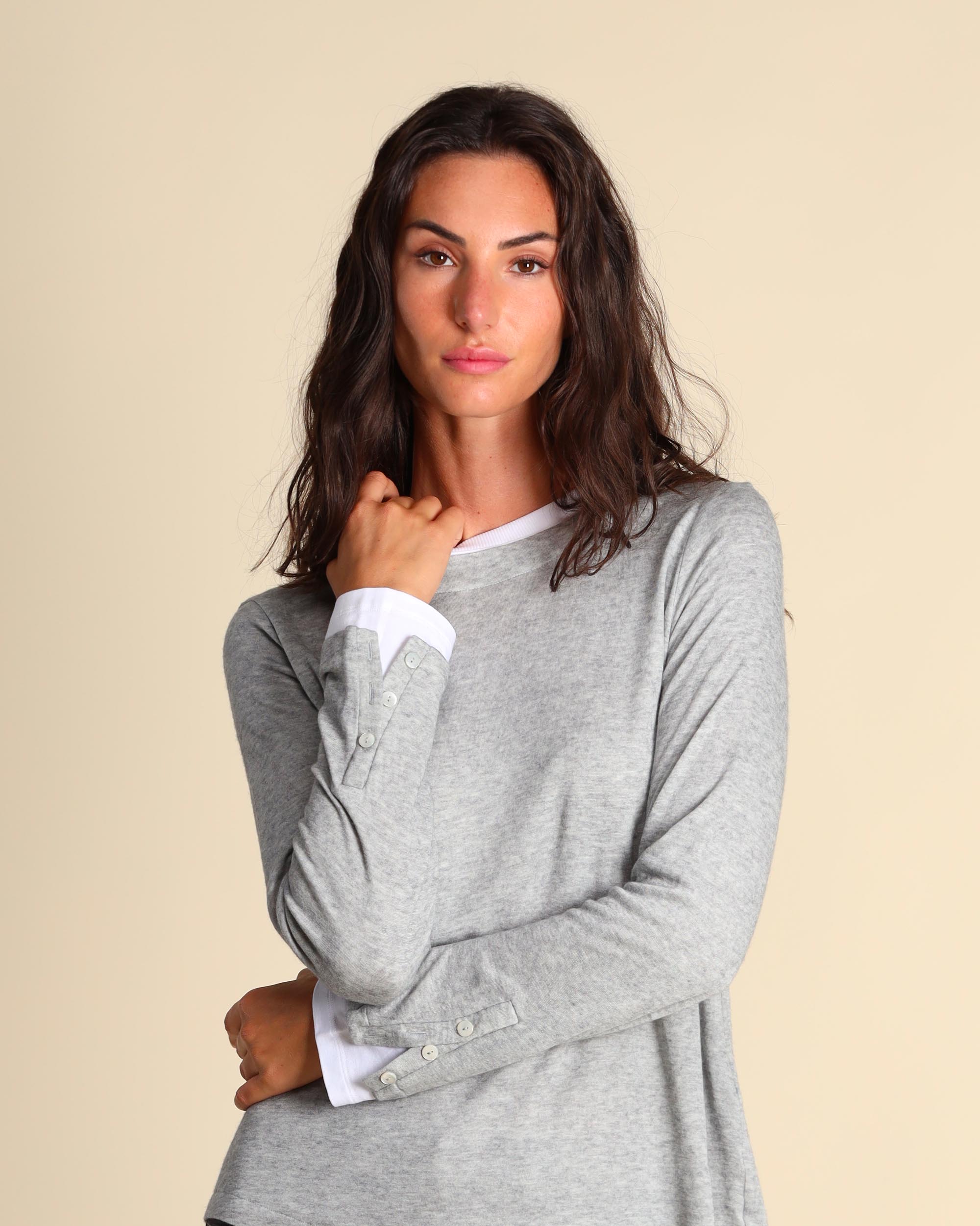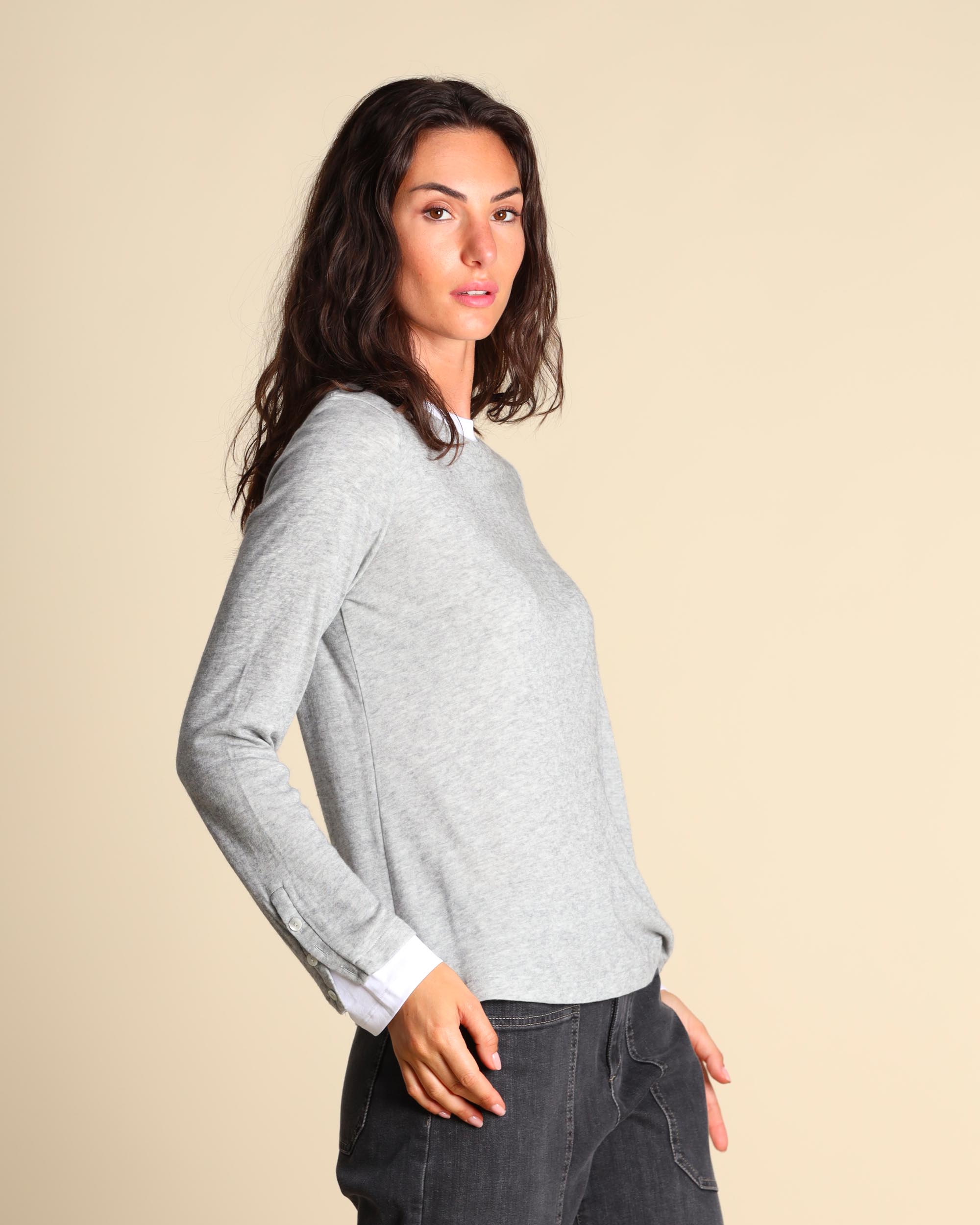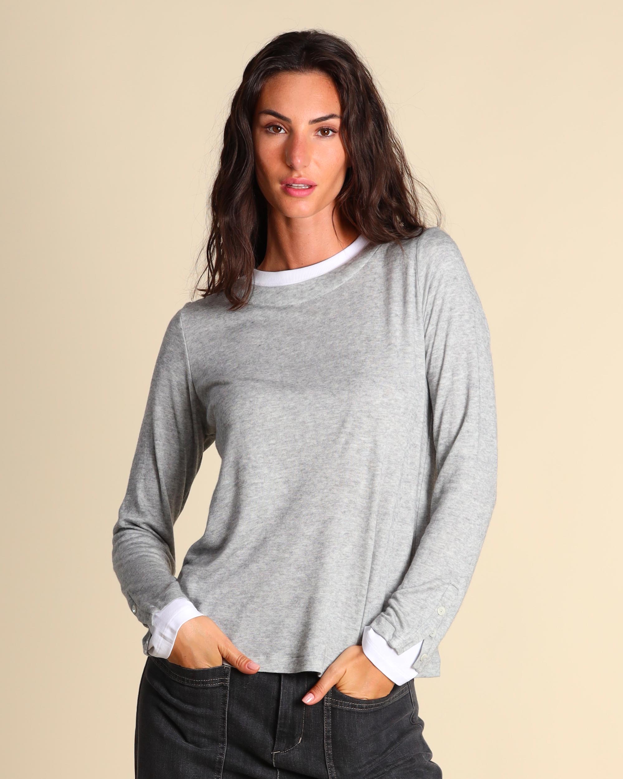 Maglia color ghiaccio melange in jersey di viscosa, modal e lana con dettagli in jersey bianco, scollo tondo, maniche lunghe con bottoni, linea dritta morbida, made in Italy, la modella indossa una tg.42, la modella ha le seguenti misure: altezza 179, seno 84, vita 63, fianchi 94, collezione donna Purotatto Autunno Inverno 2025/26