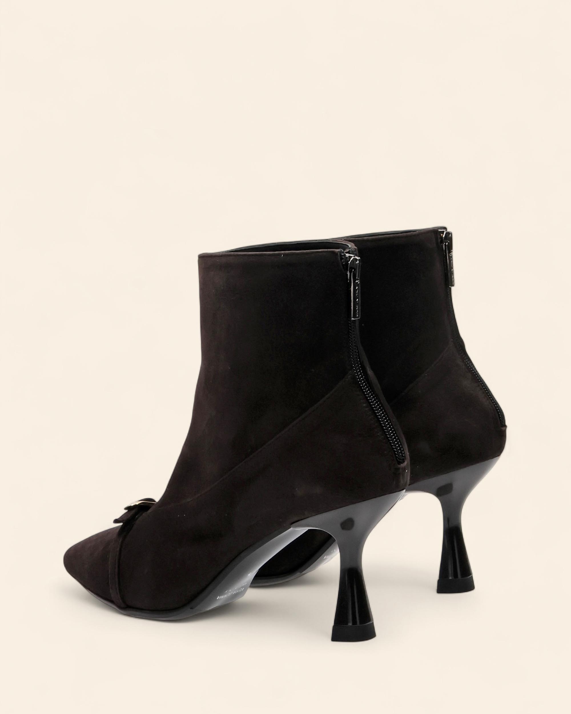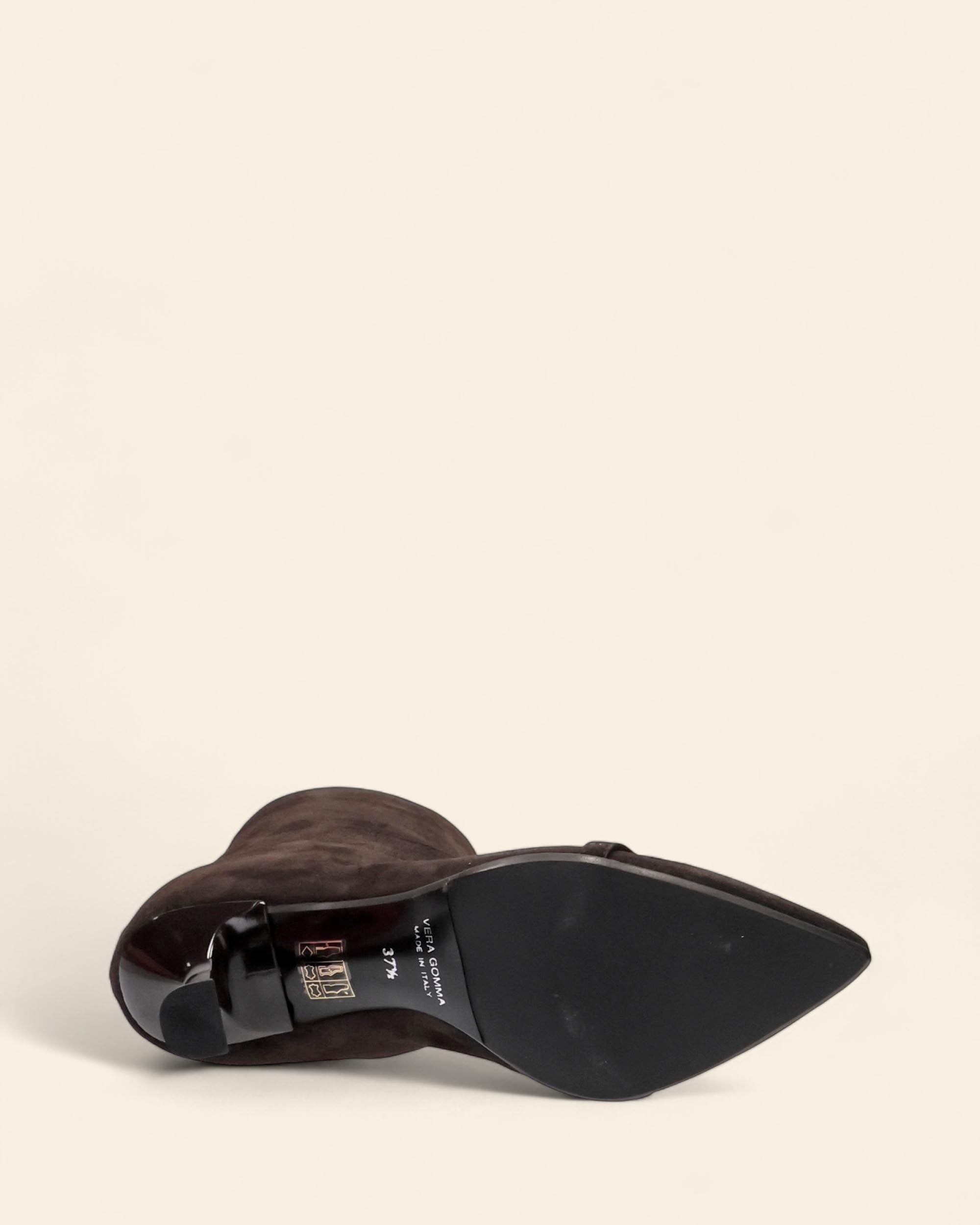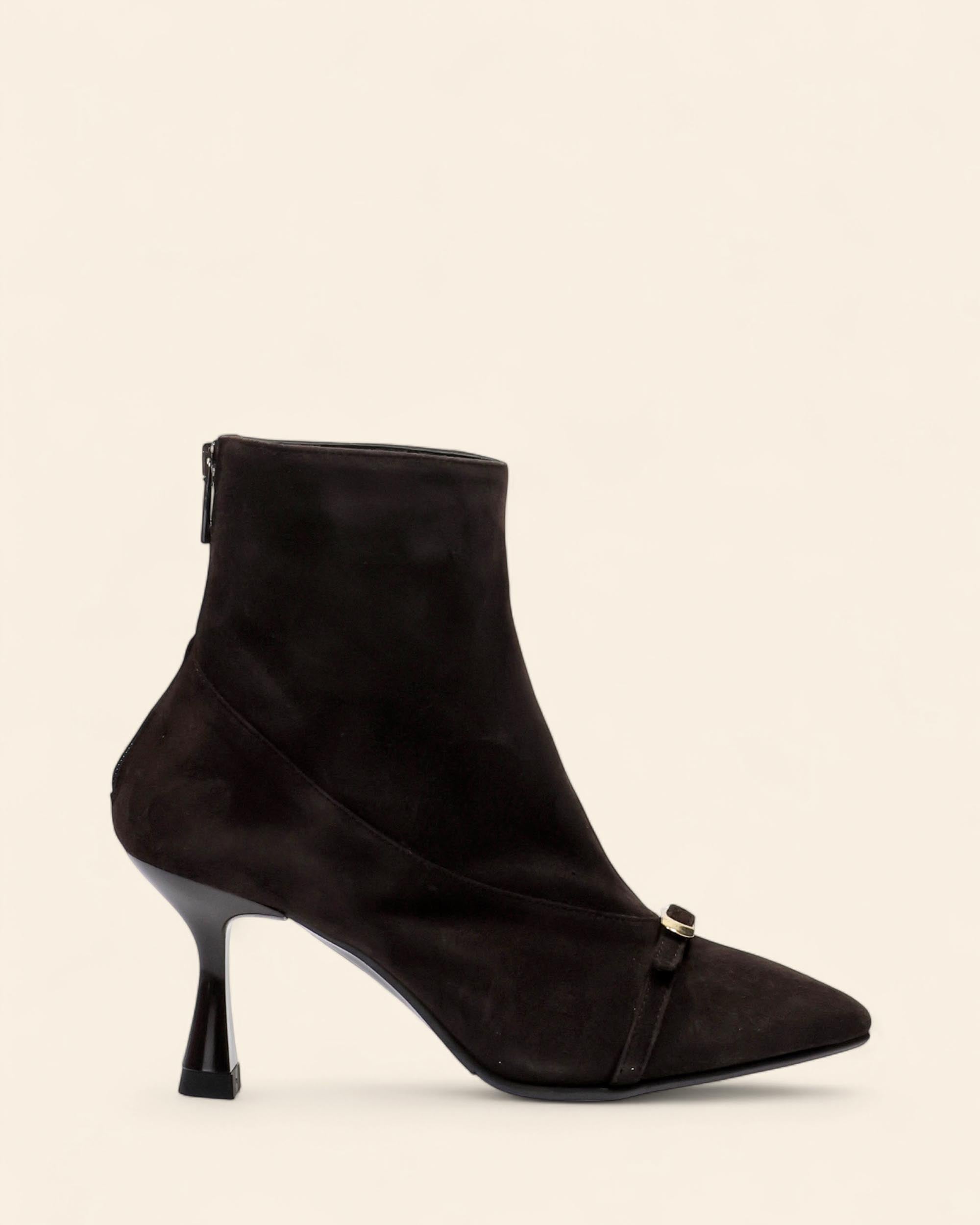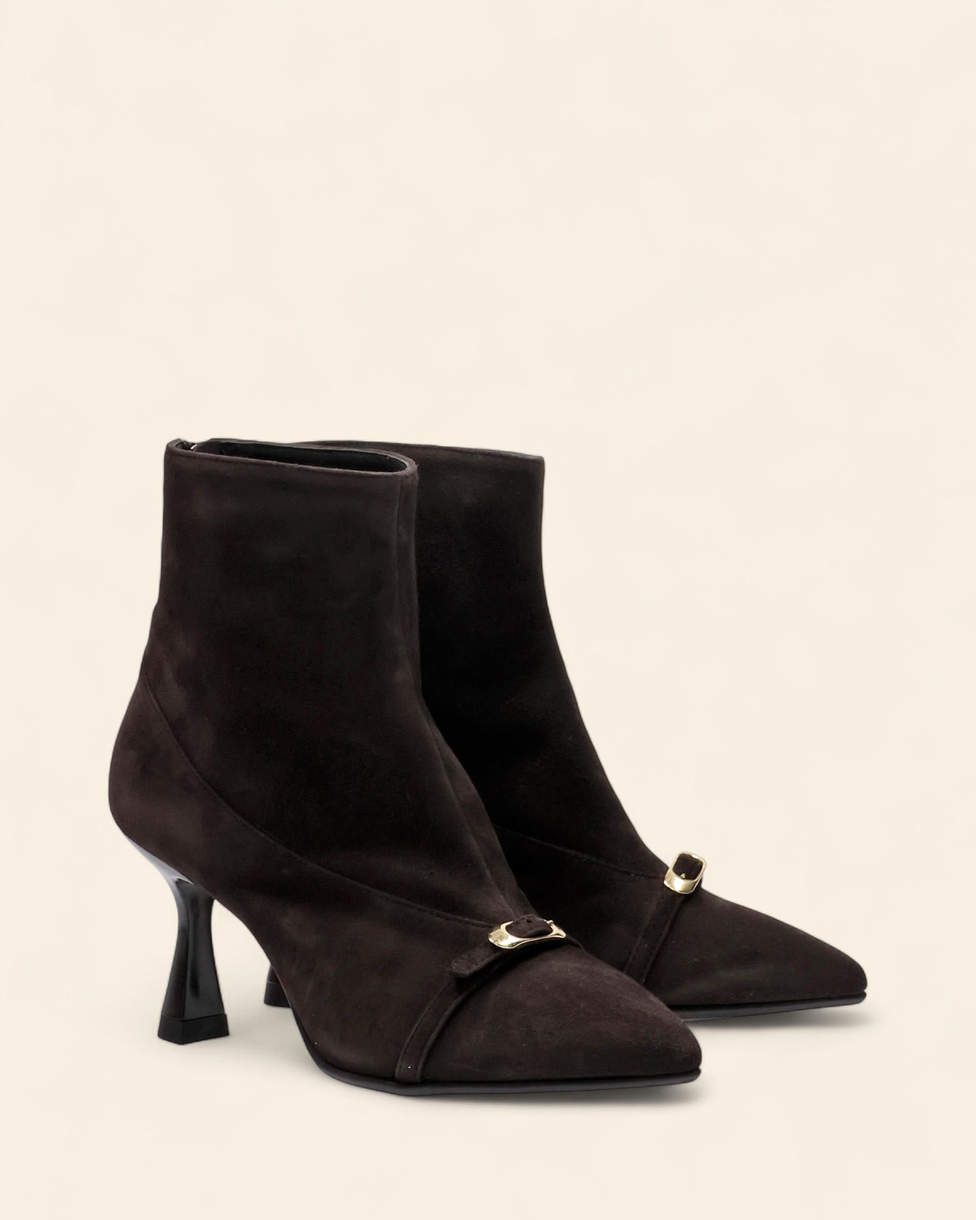 Stivaletti in camoscio color marrone, a punta, fodera in pelle, sottopiede in pelle, suola in gomma, chiusura con zip posteriore, dettaglio di cinturino dorato sul collo del piede, tacco a arocchetta 80mm, made in Italy, collezione autunno inverno Illogica 2025/2026