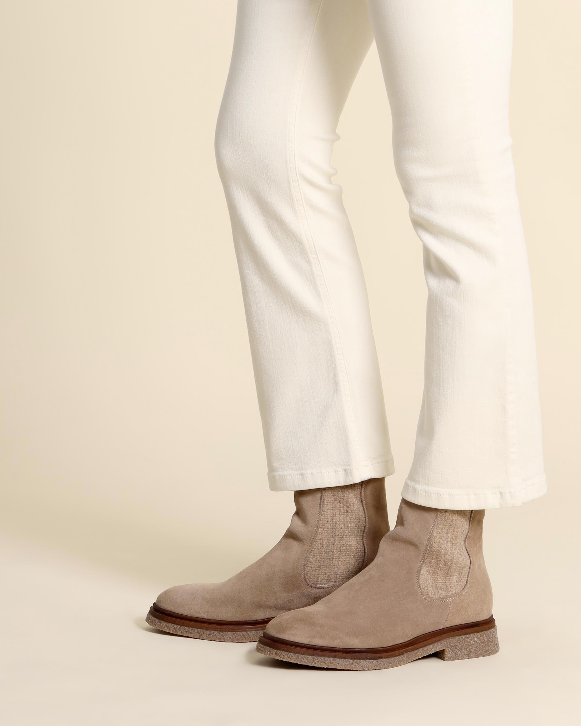 Chelsea boots in crosta color beige, conciata esclusivamente al vegetale, suola in gomma, tacco 30mm, soletta in pelle, elastici laterali in lana in tinta, fodera in pelle, punta tonda, lavorazione artigianale, tirante posteriore, made in Italy, collezione donna Creative Autunno Inverno 2025/26