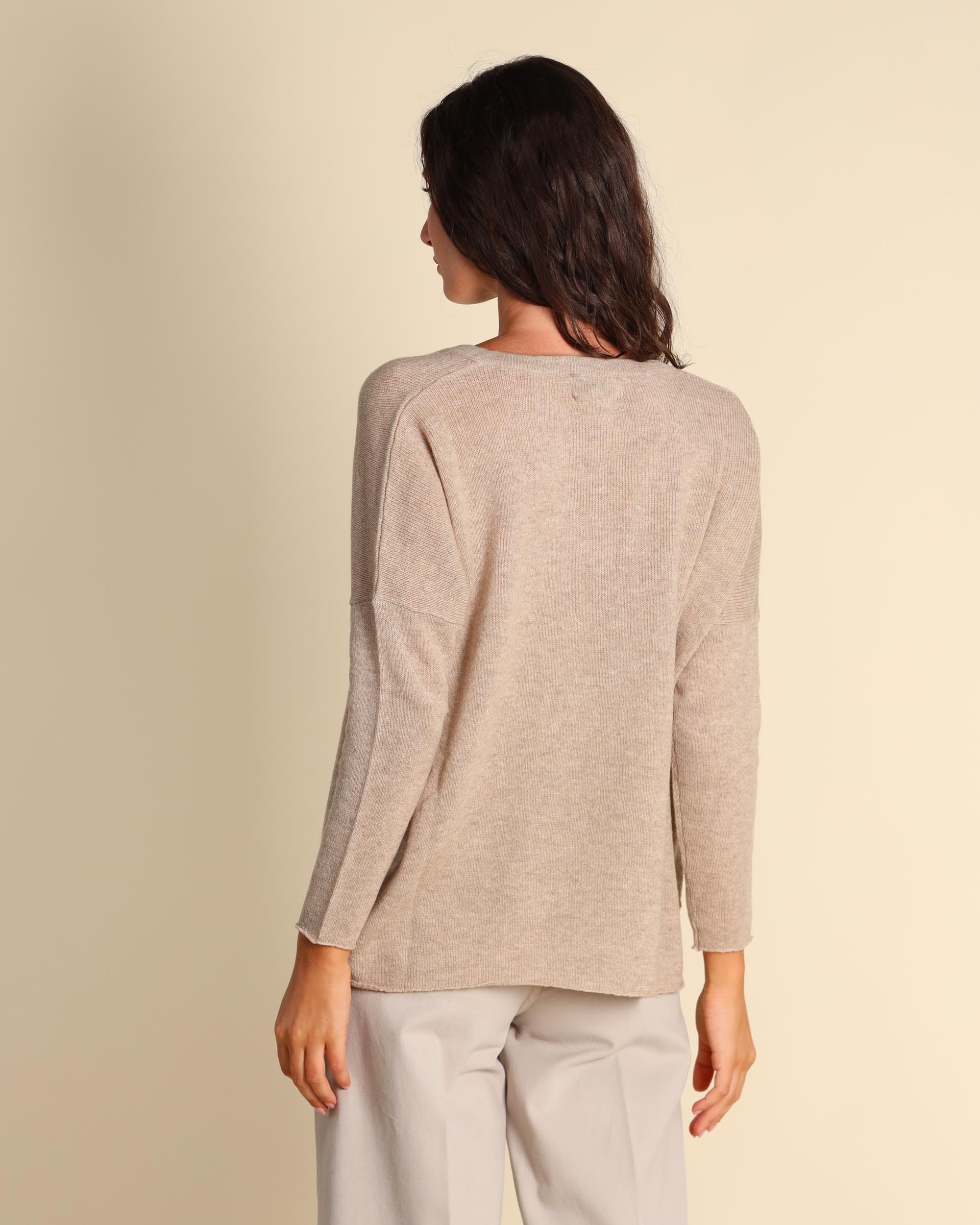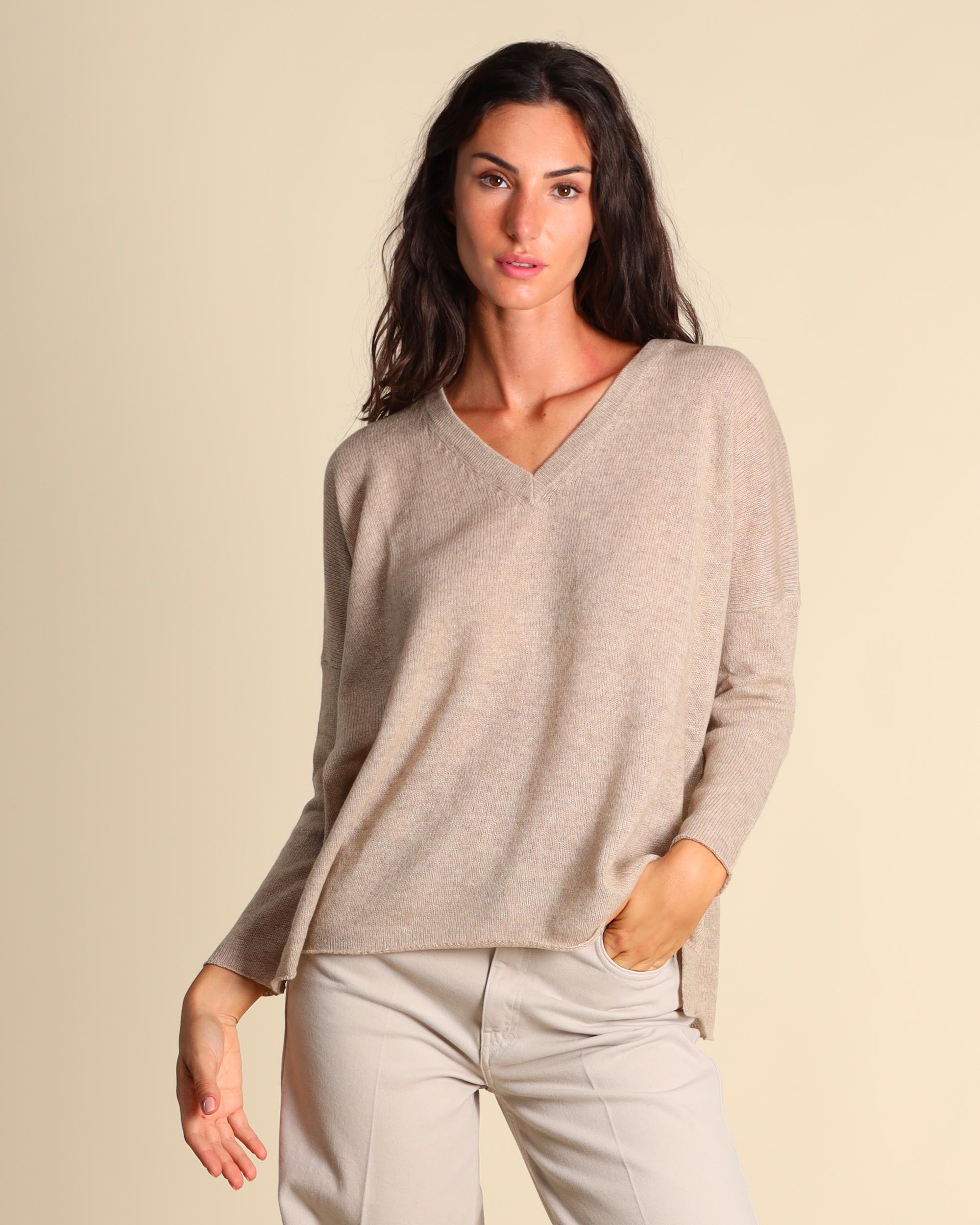 Maglia beige in cashmere con lavorazione ad un filo, gr.160, maniche lunghe, giro sceso, scollo a V, linea ampia, spacchi laterali, la modella indossa una tg.S, la modella ha le seguenti misure: altezza 179, seno 84, vita 63, fianchi 94, collezione donna Be You Autunno Inverno 2025/26