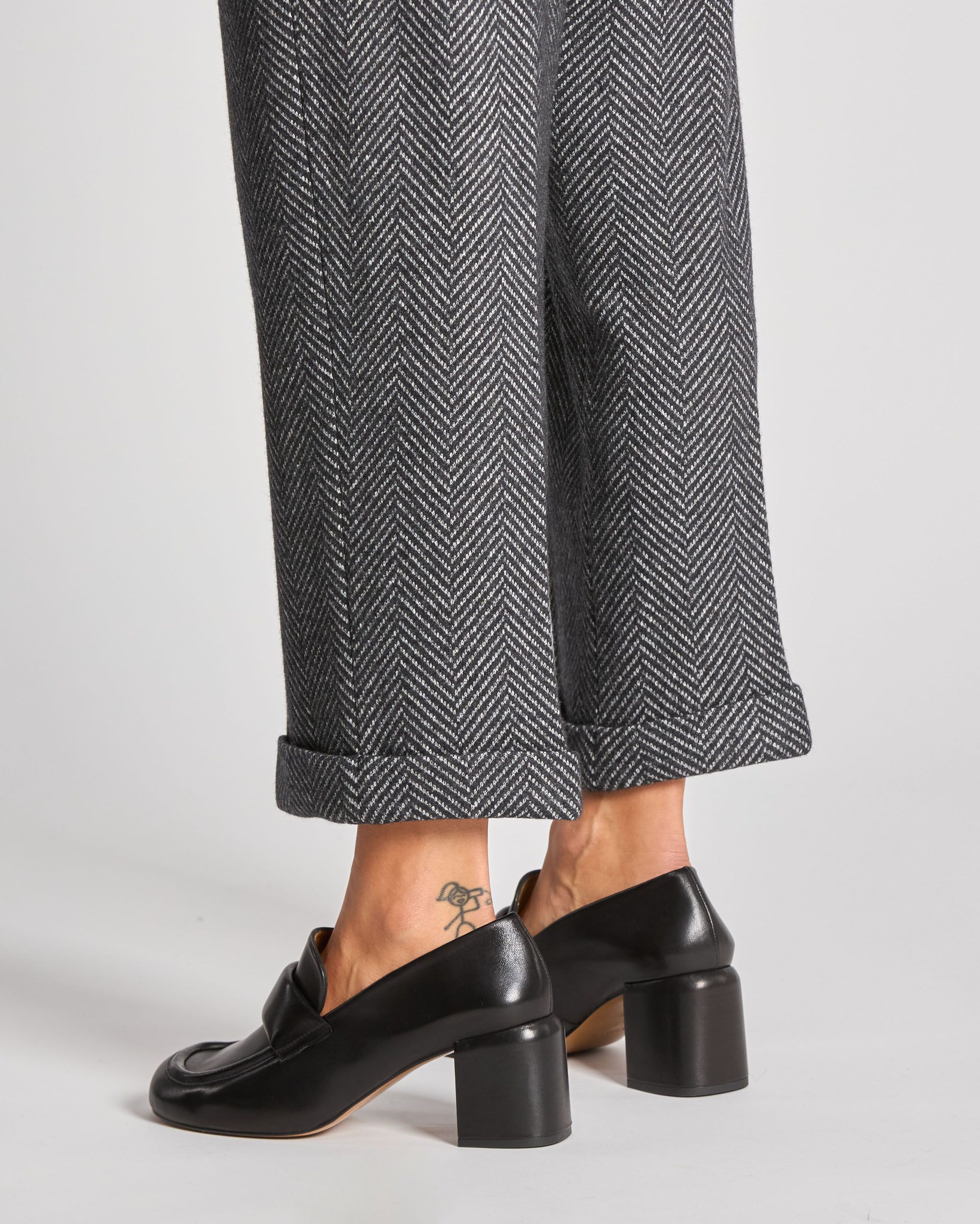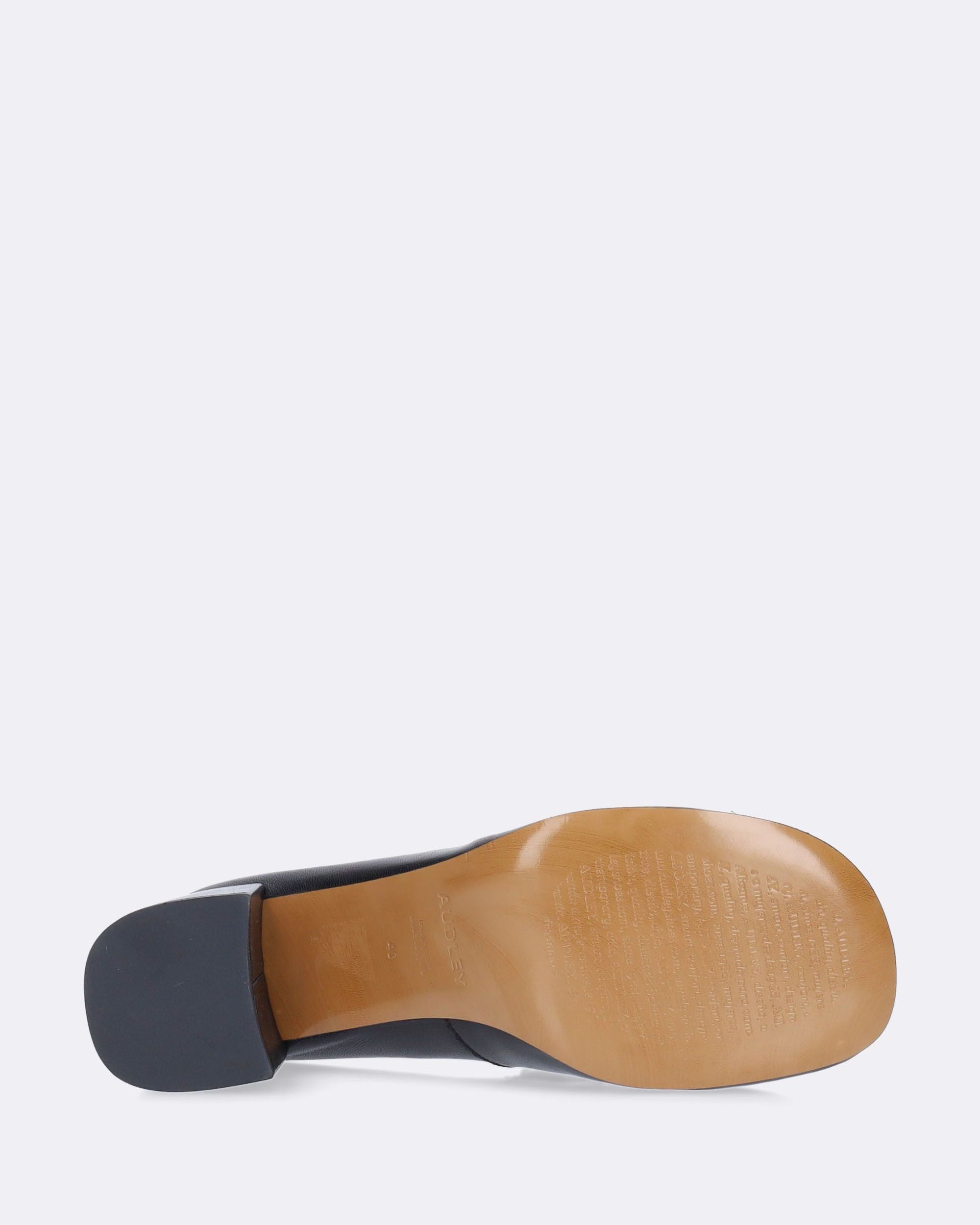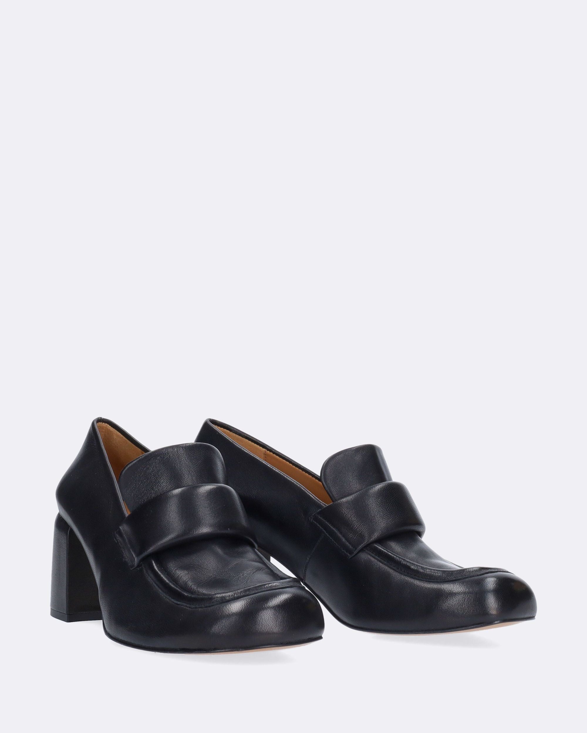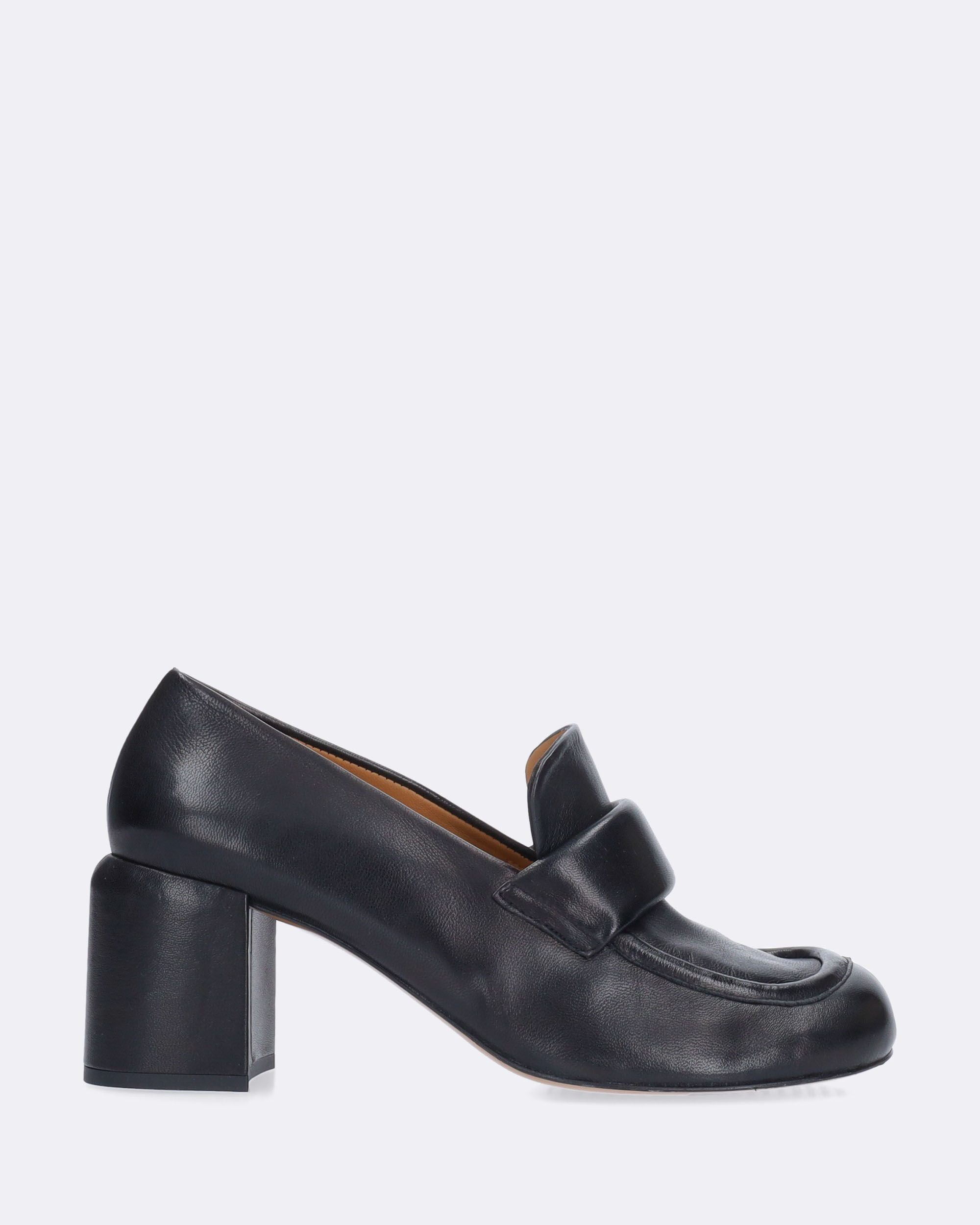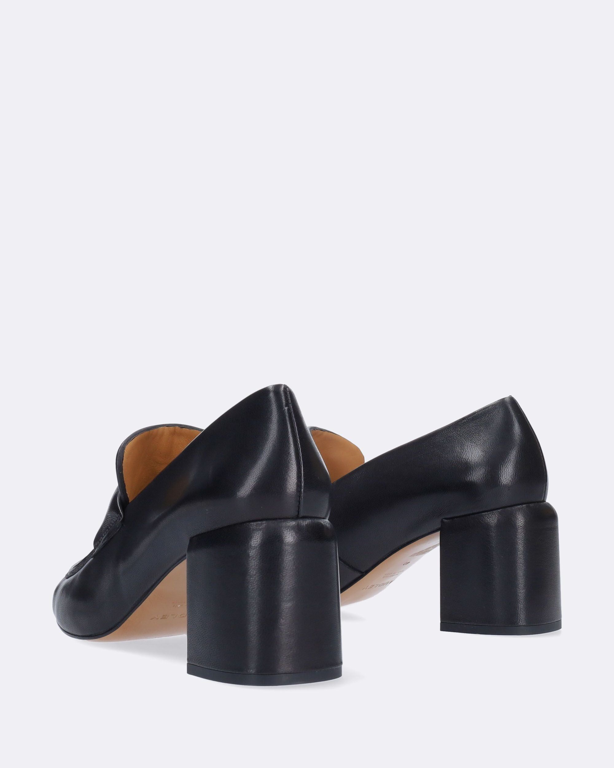 Mocassini neri in pelle ultramorbida, suola in cuoio logata, tacco ricoperto 70mm, sottopiede in pelle, fodera in pelle, collezione donna Audley London Autunno Inverno 2024/25
