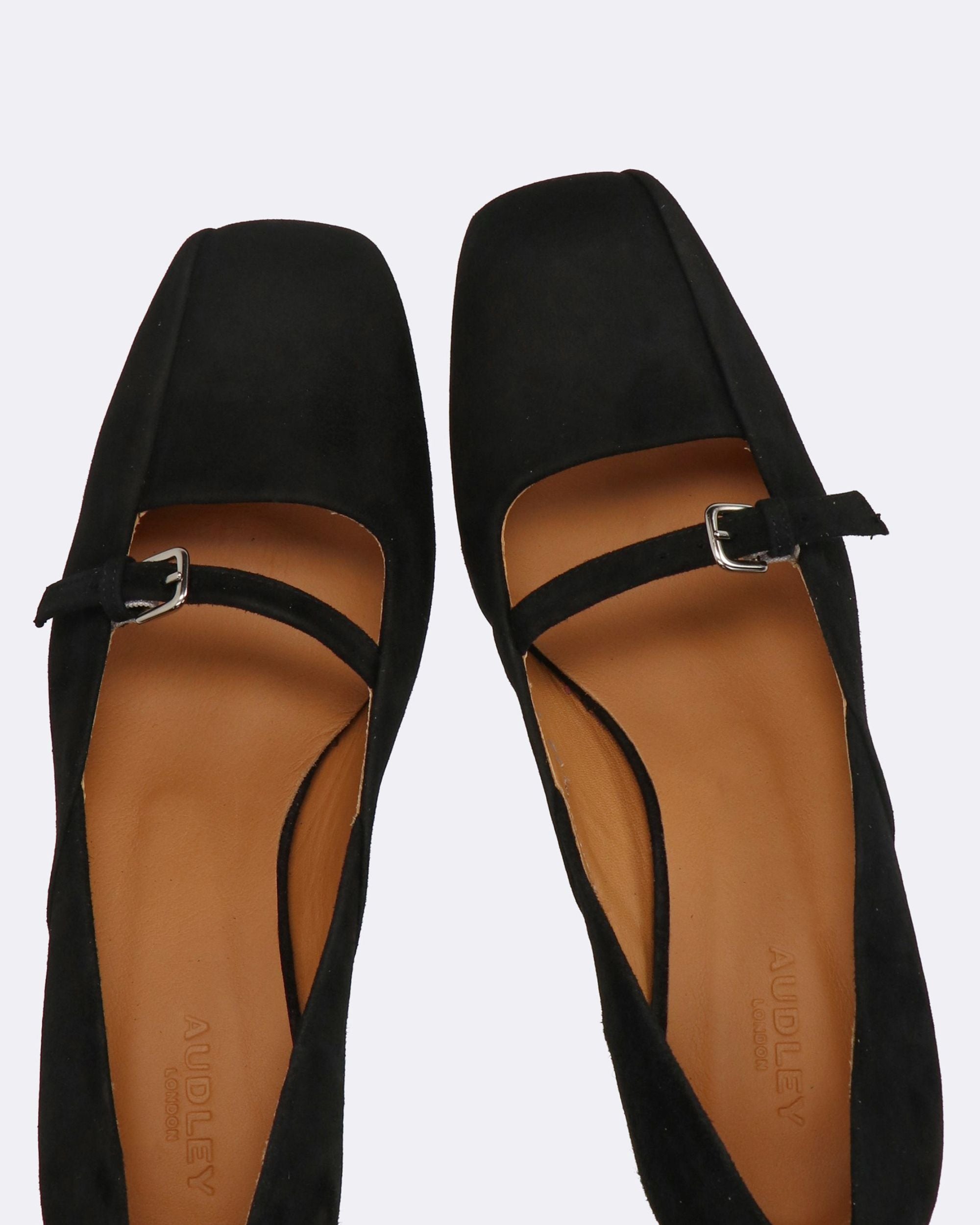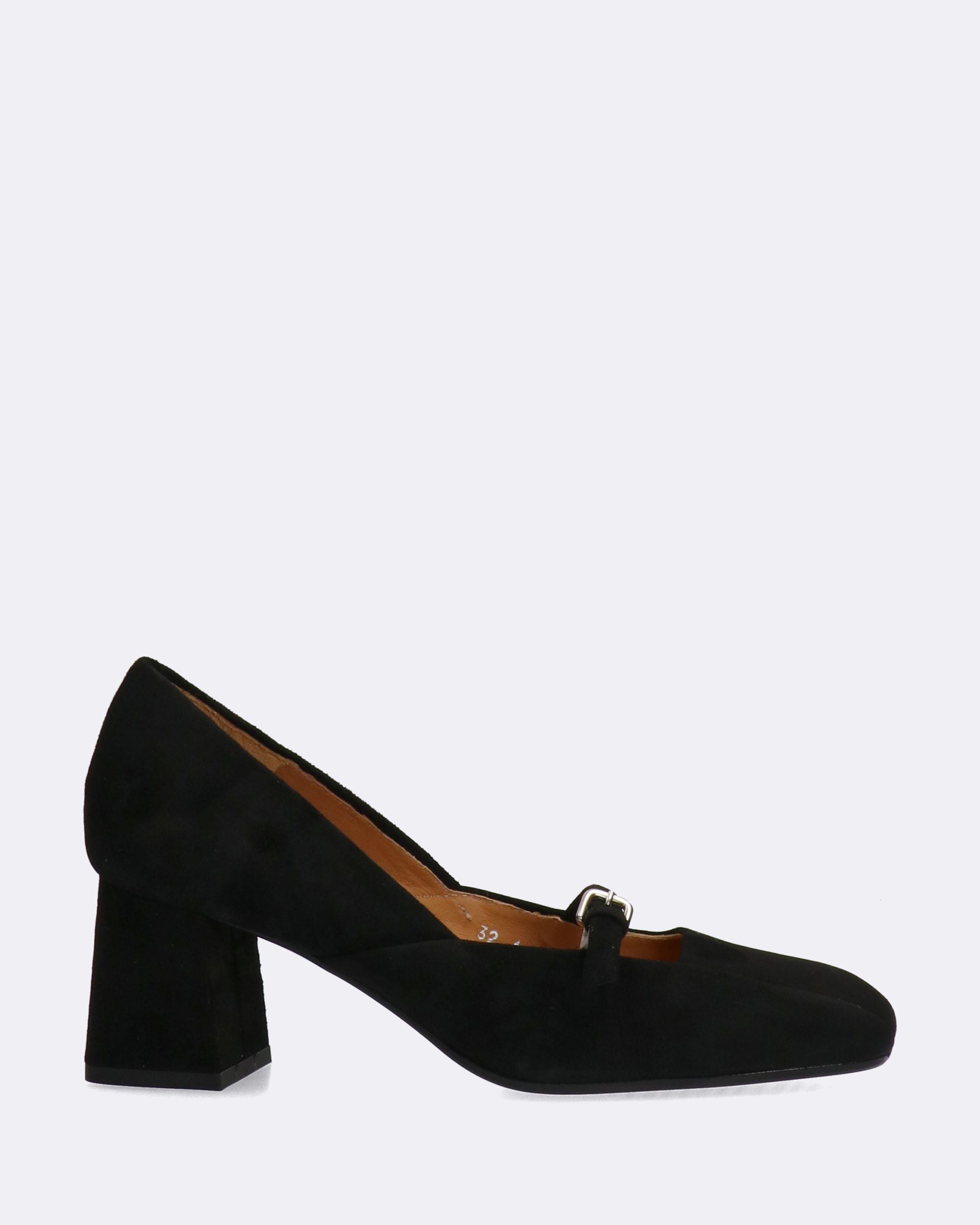 Decolletè nero in suede con cinturino, tacco ricoperto 60mm, suola in cuoio, fodera in pelle, sottopiede in pelle, made in Italy, collezione donna Audley Autunno Inverno 2024/25