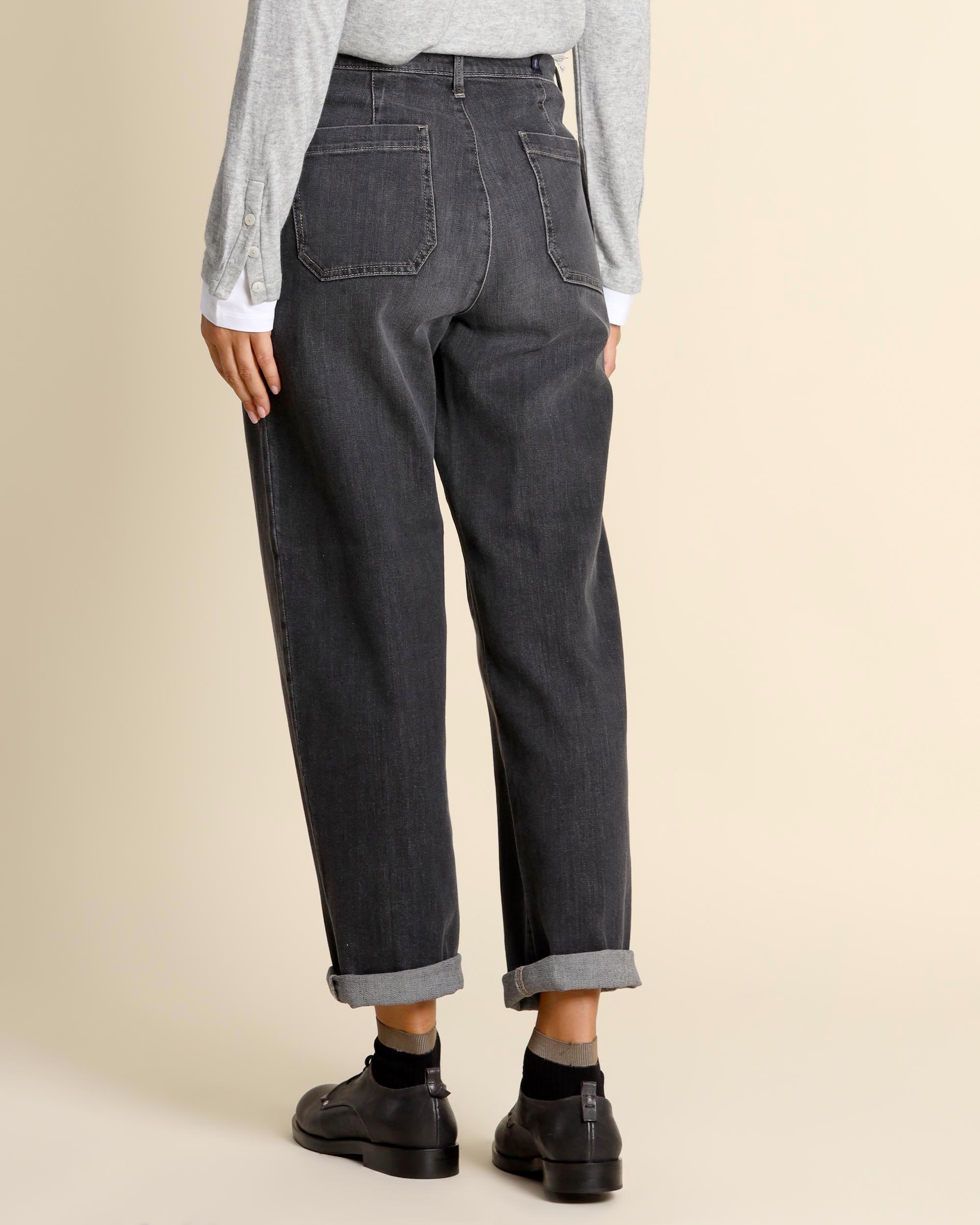Jeans nero flare cropped in denim di cotone stretch, chiusura con bottone a chiodo e zip nascosta, tasche applicate sul davanti e sul dietro, linea morbida, lavaggio cinque anni, made in Italy, la modella indossa una tg.28, la modella ha le seguenti misure: altezza 178, seno 86,vita 65, fianchi 93, collezione donna Cigala's Autunno Inverno 2025/26