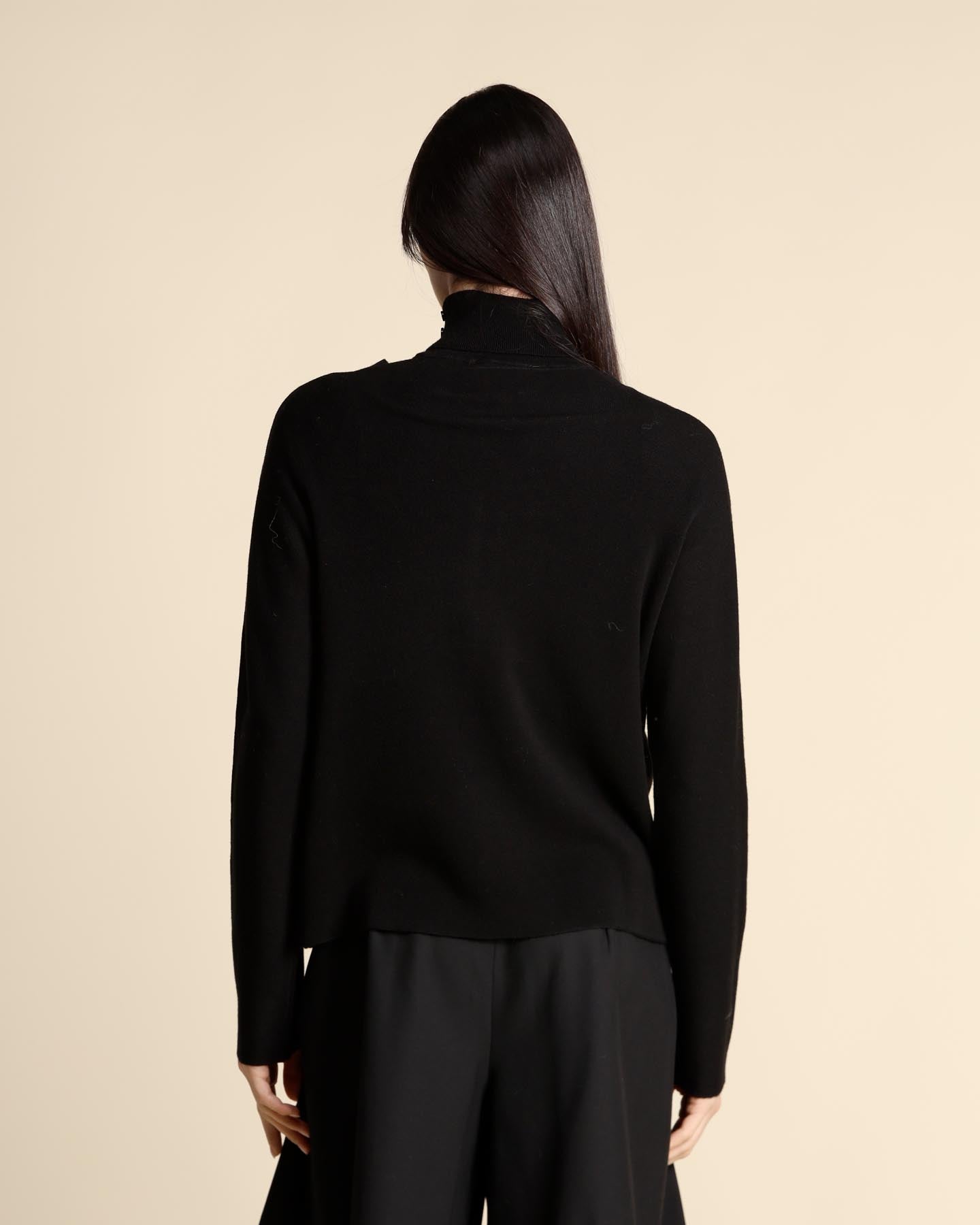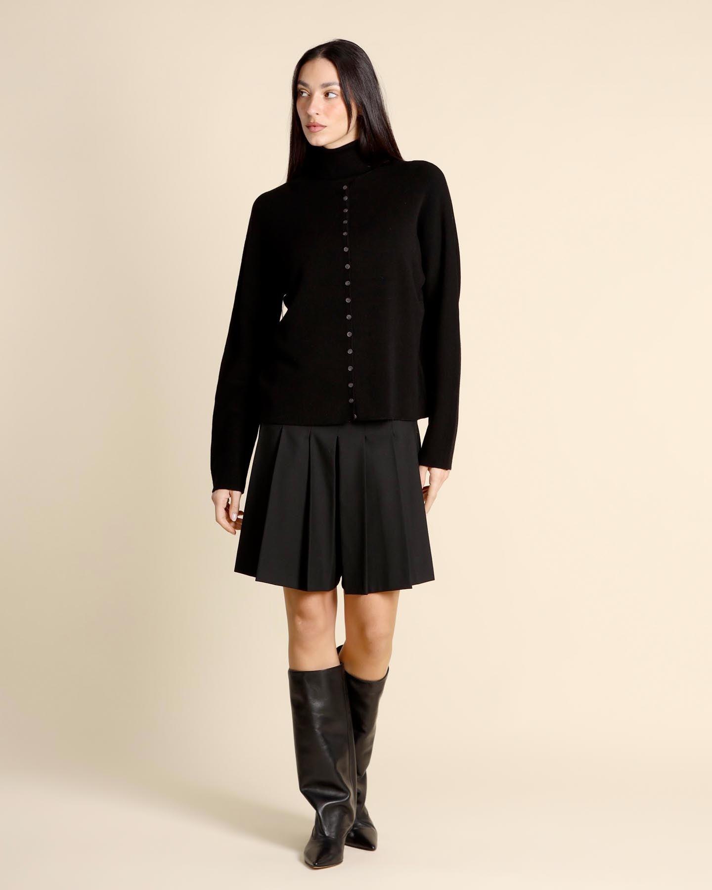 Cardigan nero in misto viscosa, collo a cratere, maniche lunghe, chiusura con bottoni, linea morbida, la modella indossa una tg.S, la modella ha le seguenti misure: altezza 179, seno 84, vita 63, fianchi 94, collezione donna Maidamila Autunno Inverno 2025/26