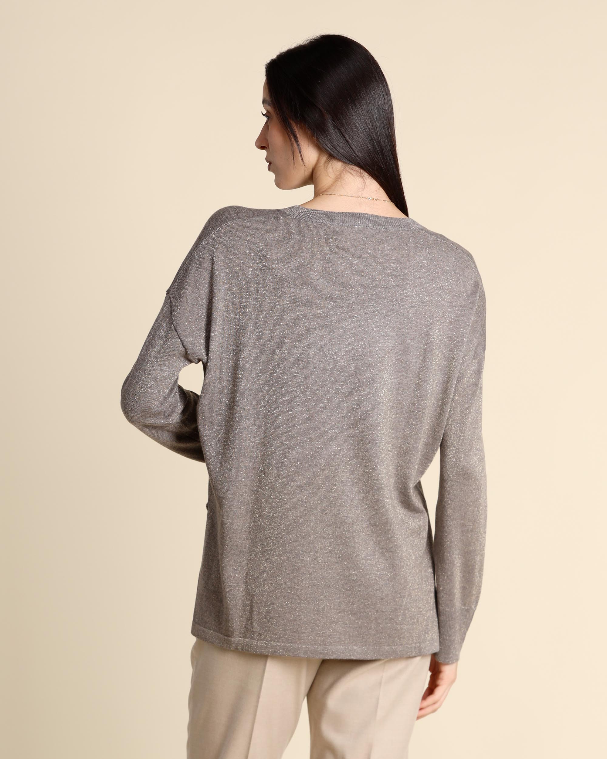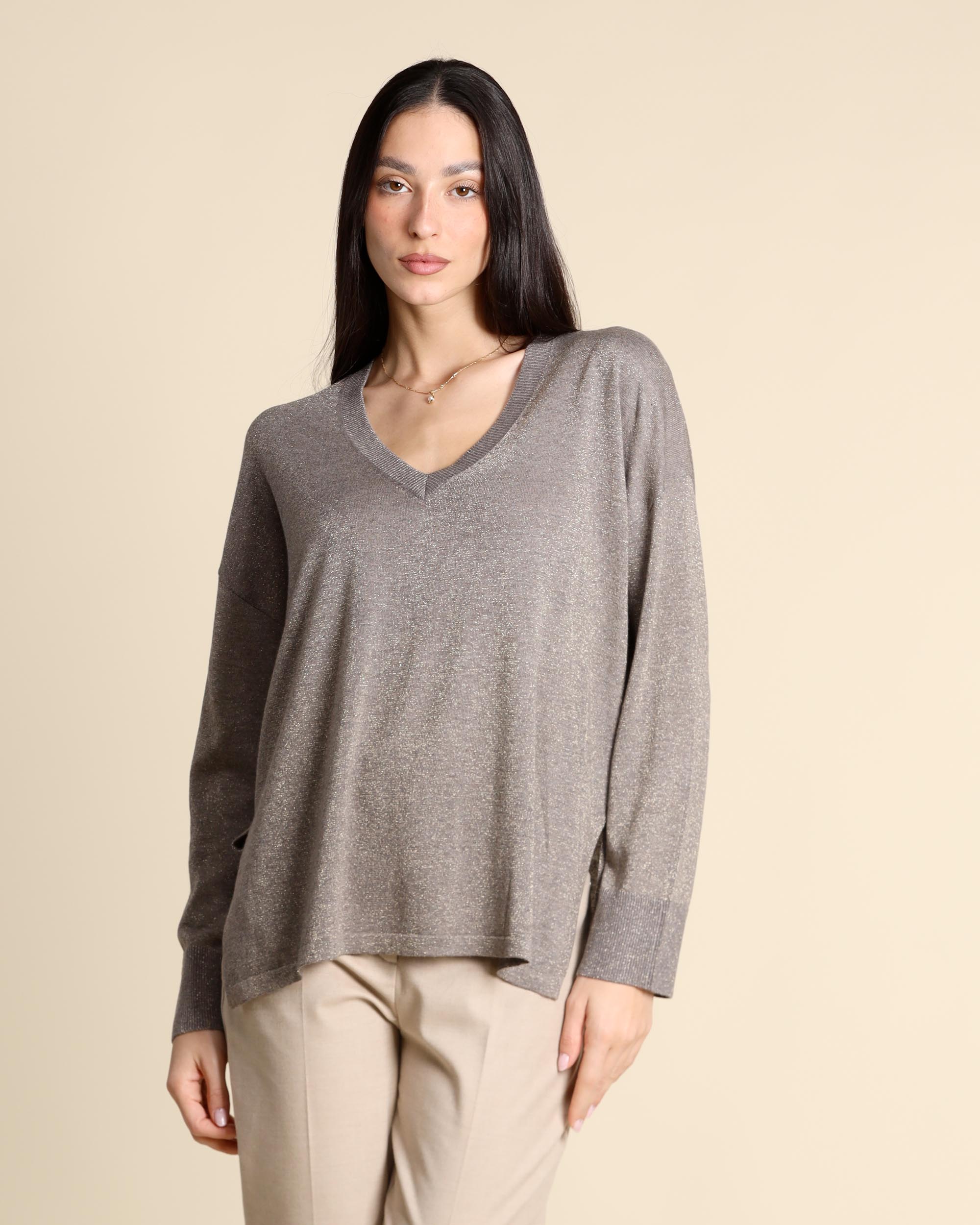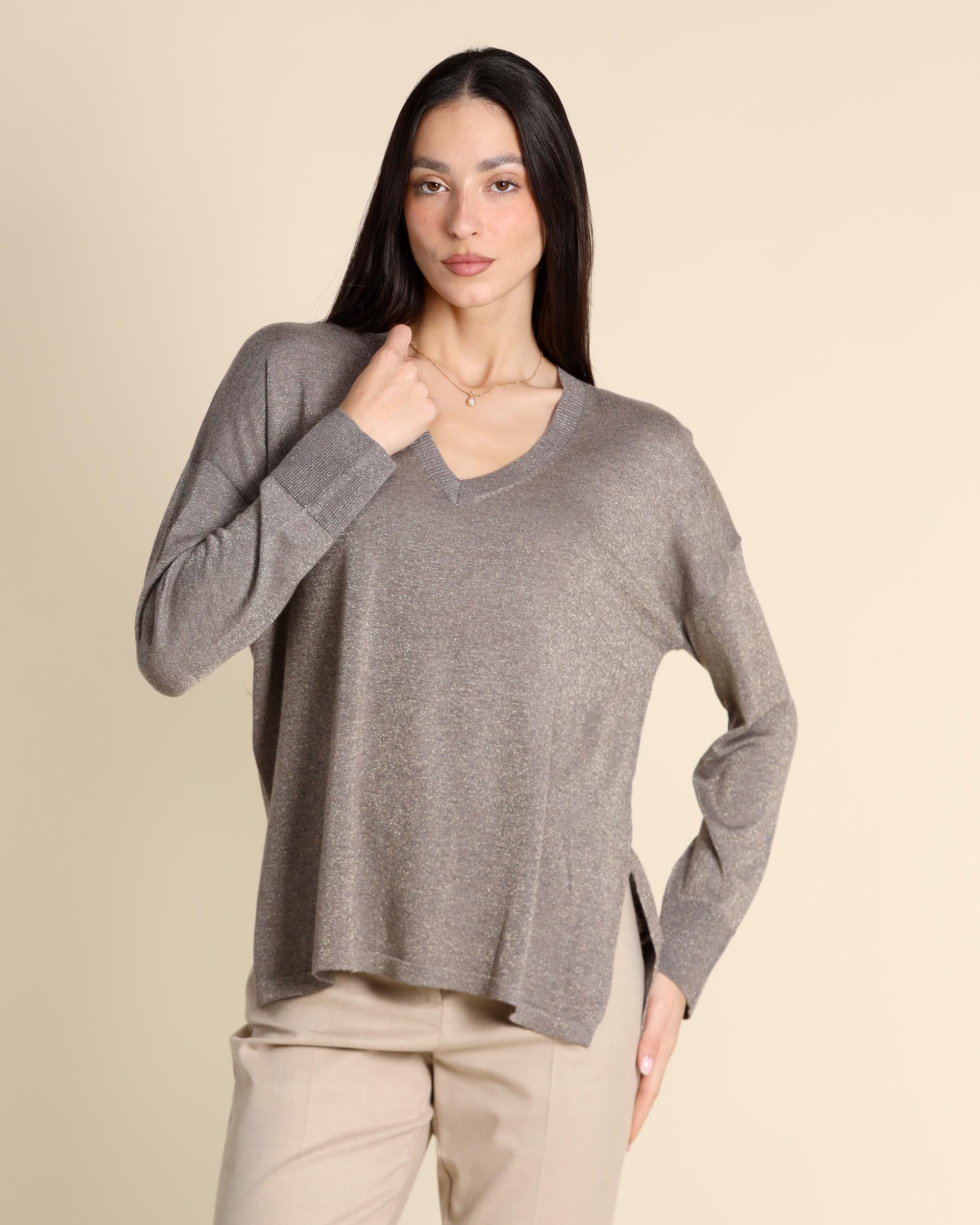 Maglia color tabacco in misto viscosa e cashmere con lurex in tinta, scollo a V, maniche lunghe, giro sceso, linea morbida, la modella indossa una tg.S, la modella ha le seguenti misure: altezza 179, seno 84, vita 63, fianchi 94, collezione donna Maidamila Autunno Inverno 2025/26