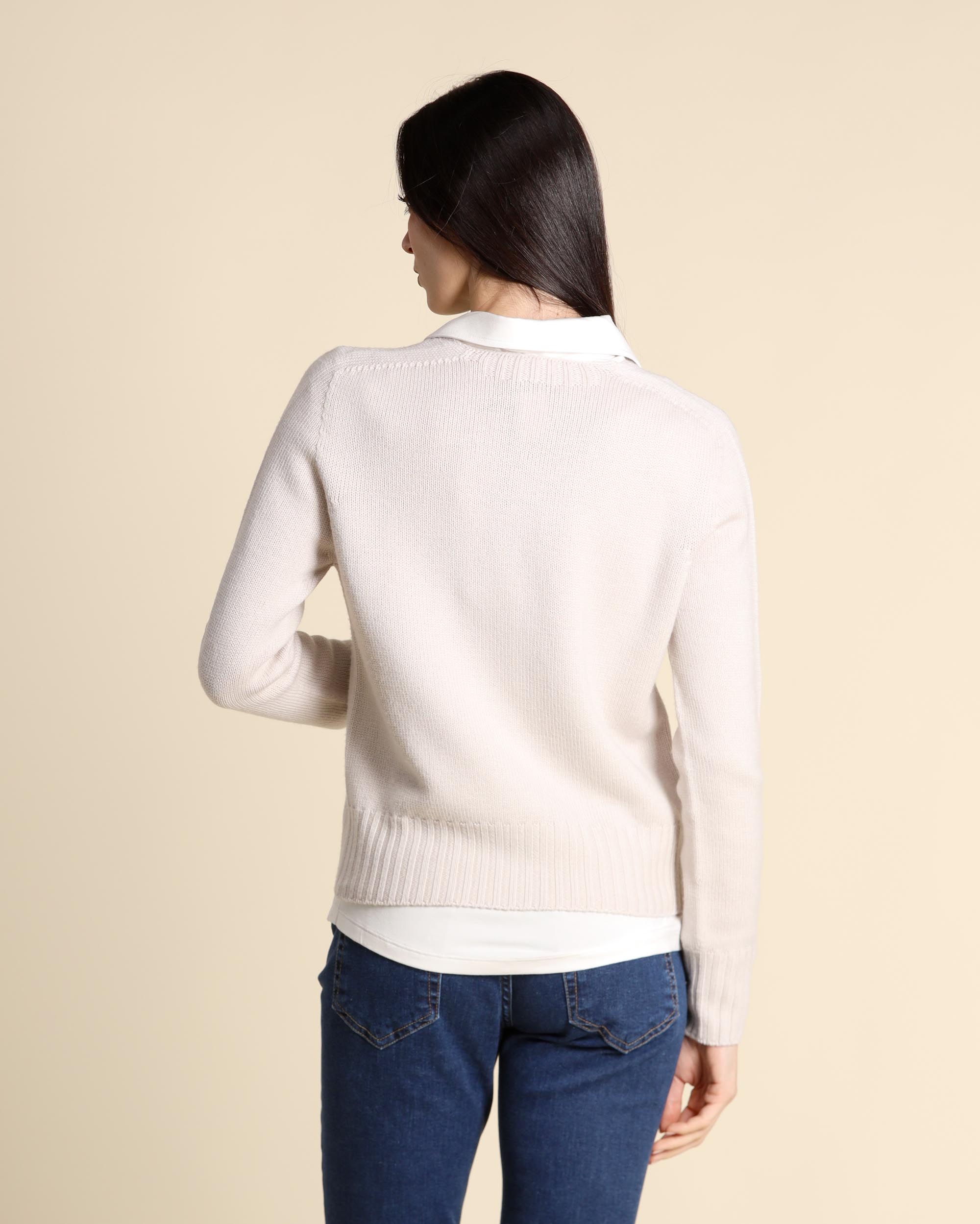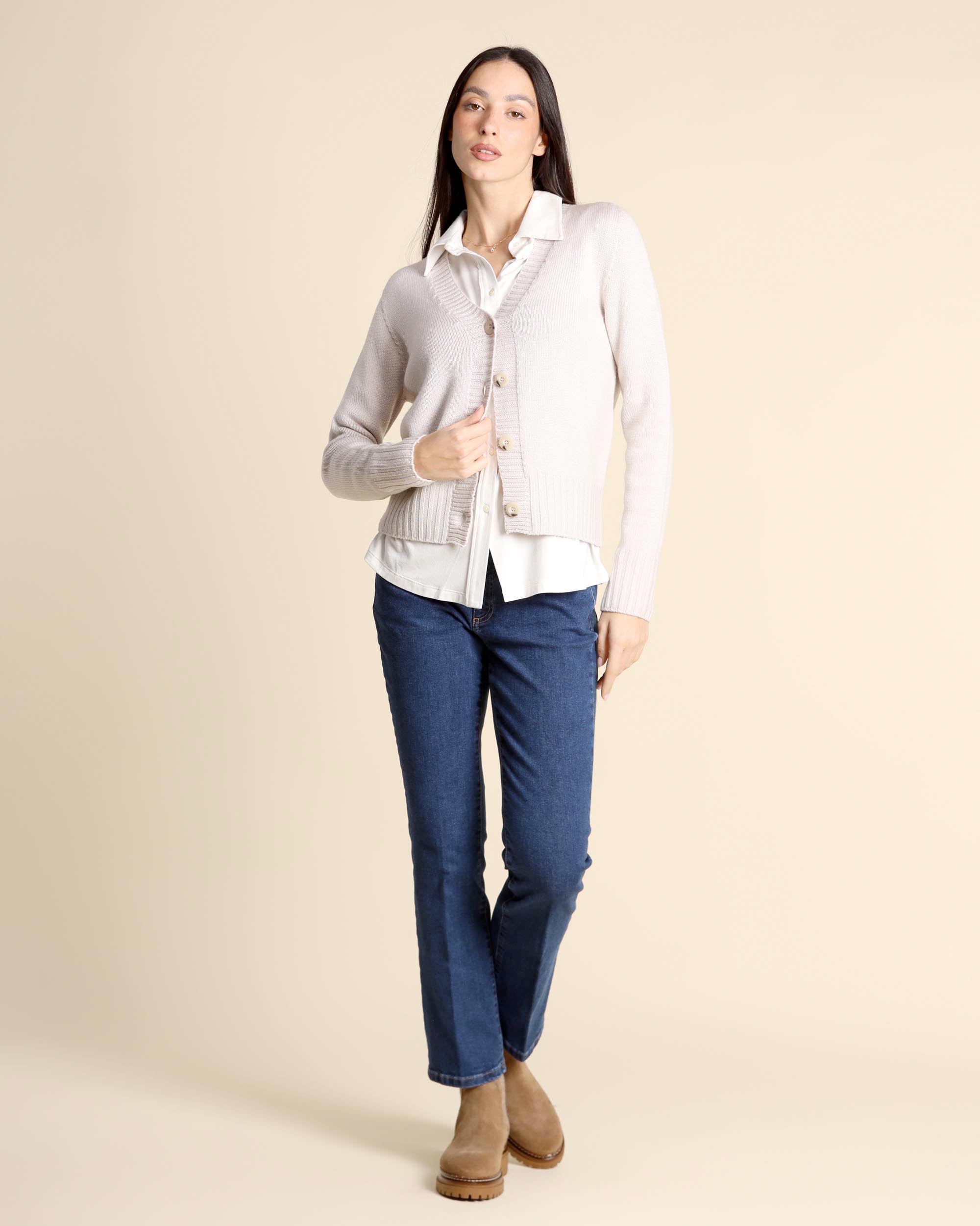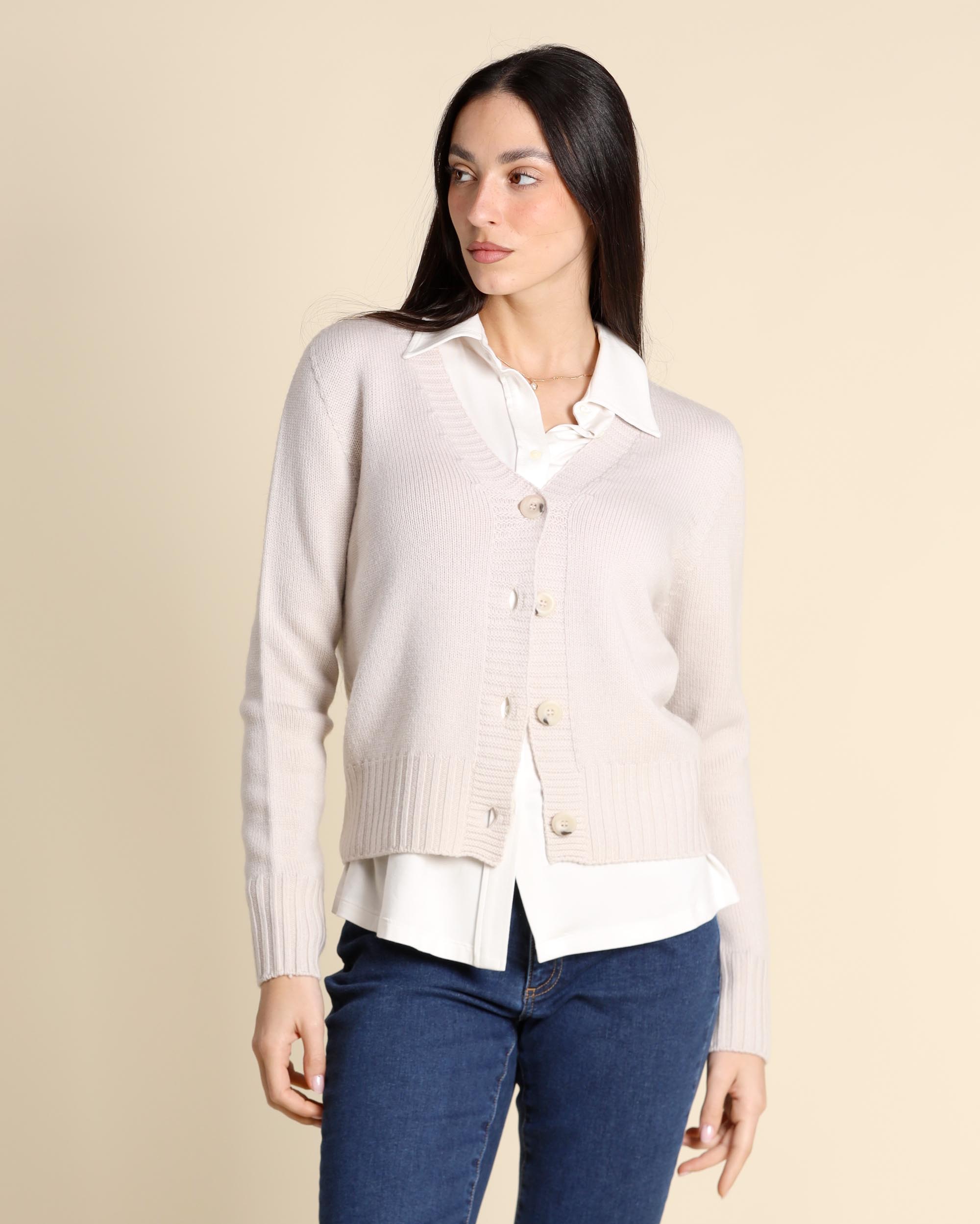 Cardigan color sabbia 100%lana vergine, maniche lunghe, linea dritta, chiusura con bottoni, made in Italy, la modella indossa una tg.S, la modella ha le seguenti misure: altezza 173, seno 84, vita 63, fianchi 94, collezione donna Maidamila Autunno Inverno 2025/26