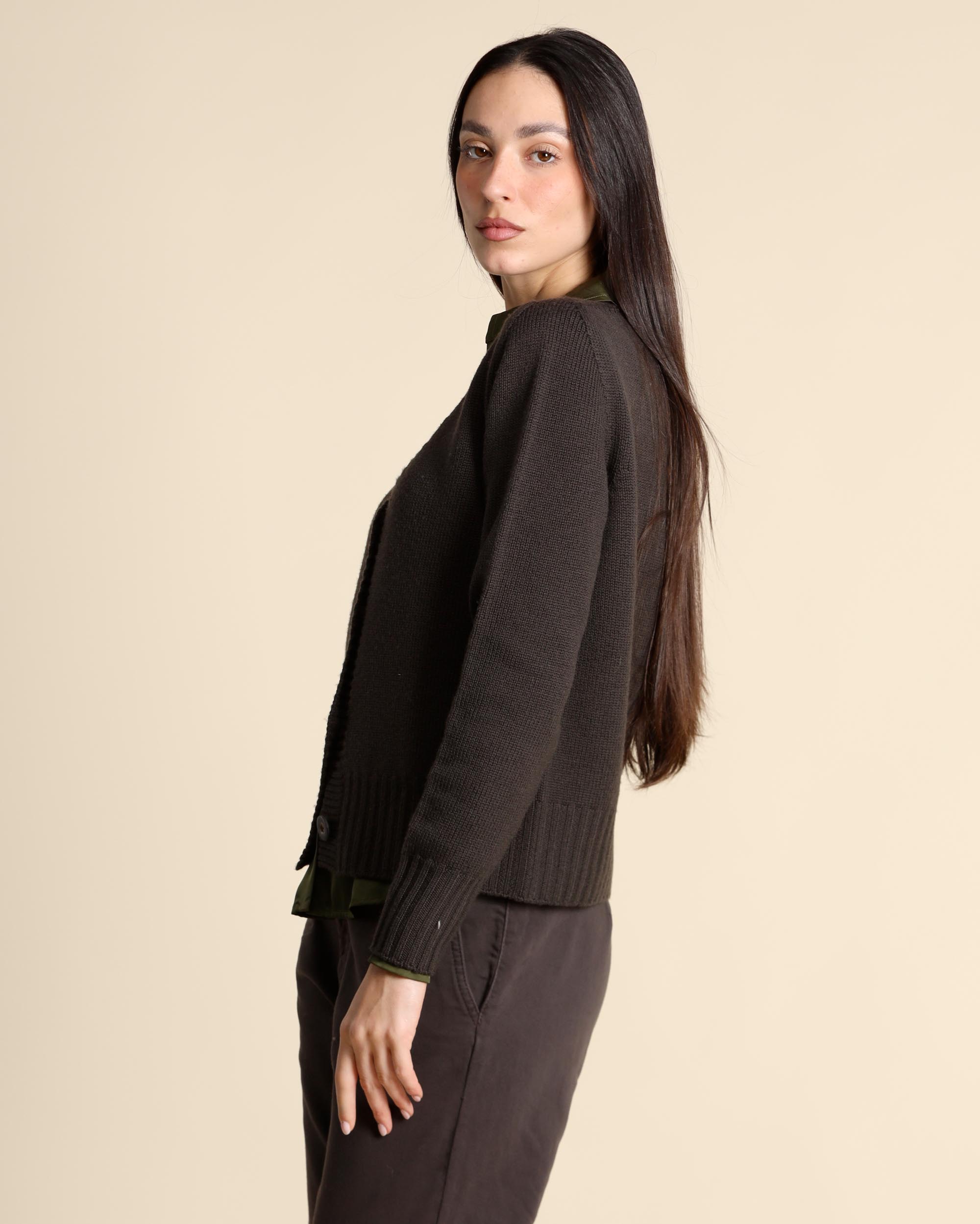 Cardigan testa moro 100%lana vergine, maniche lunghe, linea dritta, chiusura con bottoni, made in Italy, la modella indossa una tg.S, la modella ha le seguenti misure: altezza 173, seno 84, vita 63, fianchi 94, collezione donna Maidamila Autunno Inverno 2025/26