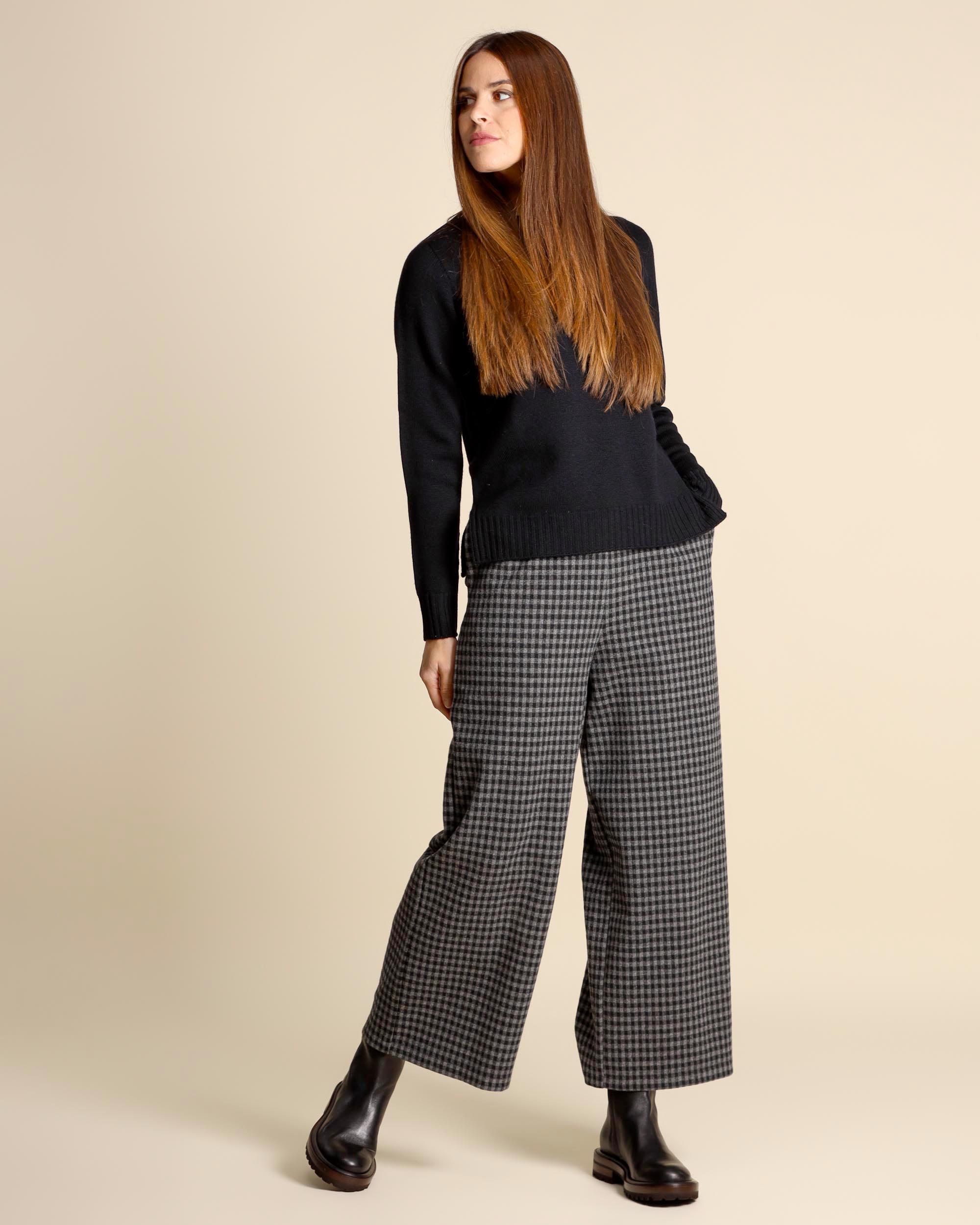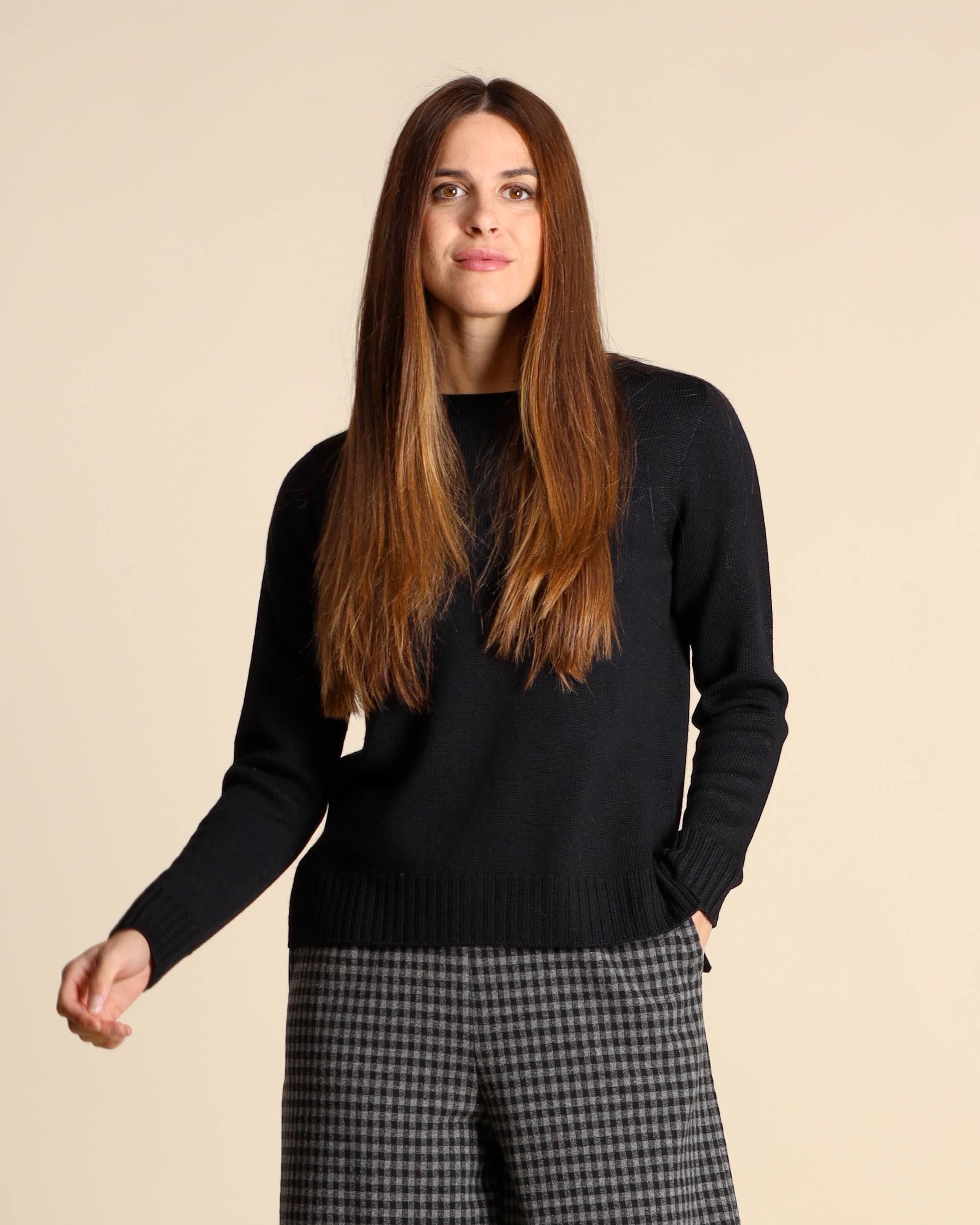 Maglia nera in pura lana vergine, scollo tondo, maniche lunghe, linea dritta, spacchi laterali, made in Italy, la modella indossa una tg.S, la modella ha le seguenti misure: altezza 179, seno 84, vita 63, fianchi 94, collezione donna Maidamila Autunno Inverno 2025/26